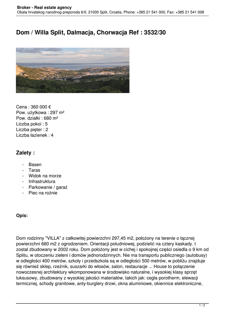 Broker - Real estate agency Obala hrvatskog narodnog preporoda 6/II, 21000 Split, Croatia, Phone: +385 21 541 000, Fax: +385 21 541 008 Dom / Willa Split, Dalmacja, Chorwacja Ref : 3532/30 Cena : 360 000 € Pow. użytkowa : 297 m² Pow. działki : 680 m² Liczba pokoi : 5 Liczba pięter : 2 Liczba łazienek : 4 Zalety : - Basen Taras Widok na morze Infrastruktura Parkowanie / garaż Piec na rożnie Opis: Dom rodzinny "VILLA" z całkowitej powierzchni 297,45 m2, położony na terenie o łącznej powierzchni 680 m2 z ogrodzeniem. Orientacji południowej, podzielić na cztery kaskady. t został zbudowany w 2002 roku. Dom położony jest w cichej i spokojnej części osiedla o 9 km od Splitu, w otoczeniu zieleni i domów jednorodzinnych. Nie ma transportu publicznego (autobusy) w odległości 400 metrów, szkoły i przedszkola są w odległości 500 metrów, w pobliżu znajduje się również sklep, rzeźnik, suszarki do włosów, salon, restauracje ... House to połączenie nowoczesnej architektury wkomponowana w środowisko naturalne, i wysokiej klasy sprzęt luksusowy, zbudowany z wysokiej jakości materiałów, takich jak: cegła porotherm, elewacji termicznej, schody granitowe, anty-burglery drzwi, okna aluminiowe, okiennice elektroniczne, 1/2 Broker - Real estate agency Obala hrvatskog narodnog preporoda 6/II, 21000 Split, Croatia, Phone: +385 21 541 000, Fax: +385 21 541 008 wysokiej jakości ceramiki i łazienki, zima-lato basen powierzchni 42 m2 ( 8,7 x4, 8m), centralne ogrzewanie, klimatyzacja. Dom ma dwa poziomy: parter i piętro z pięknym widokiem na Split, Trogir i kanał Split. Składa się z: baldachim parking (13,30 m2), garaż (25 m2), oddzielne mieszkanie (18 m2). Pierwsze piętro przedpokój (1,53 m2), wewnętrzna klatka schodowa (6,51 m2), korytarz (13,34 m2), łazienki (7,96 m2), pokój (13,85 m2), pokój (10,65 m2 ), loggia (10,20 m2). Parter ma korytarza (5,58 m2), WC i łazienka (4,50 m2), szafa, narożnik wino, kuchnia z jadalnia i salon (25,96 m2) z wyjściem na zadaszony taras (38,25 m2) oraz otwarty taras (14,88 m2), pralnię z kotła centralnego ogrzewania (2,56 m2), kuchnia letnia z zainstalowanym grill (8,46 m2). Maszynowni na basen (13,50 m2), taras przy basenie (17,36 m2), zamknięty taras przy basenie w okresie zimowym (8,46 m2), pomieszczenie z narzędziami (13,60 m2 ) i zamknięty ogród zimowy w lexsan (24 m2). Dom ma centralne ogrzewanie i system chłodzenia jakości. Jest pozwolenie na budowę i dokument własności bez hipoteki. 2/2