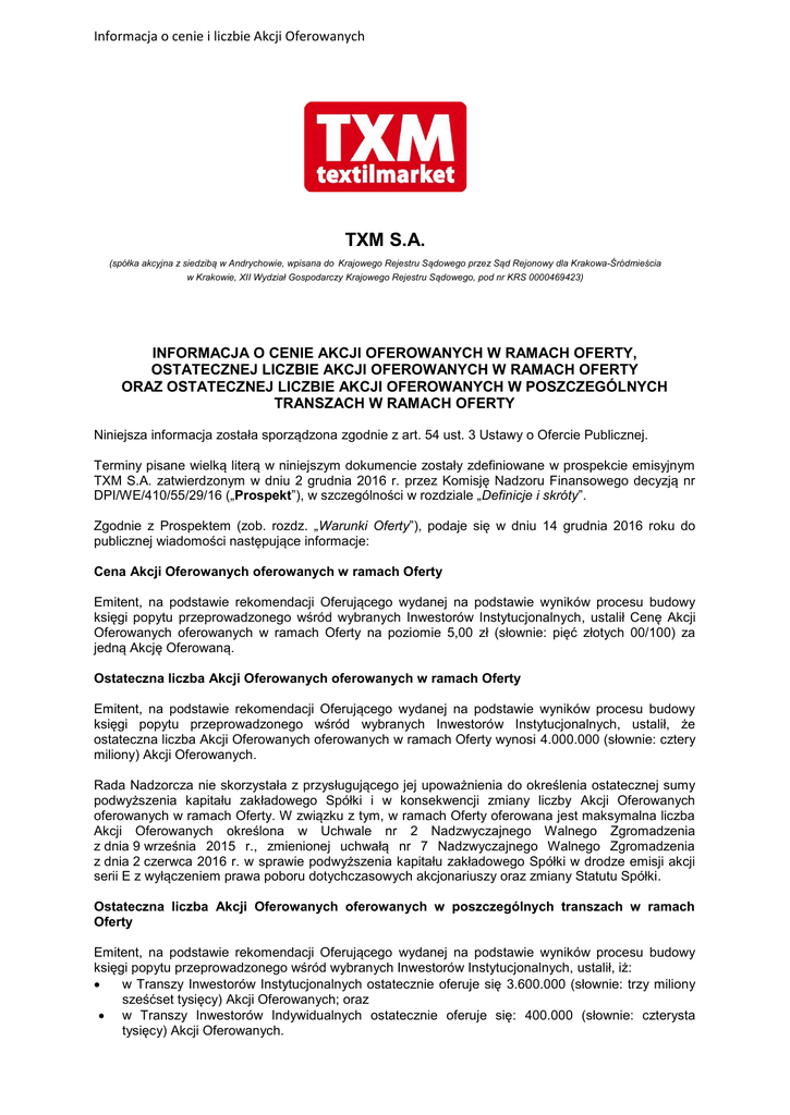 Informacja o cenie i liczbie Akcji Oferowanych TXM S.A. (spółka akcyjna z siedzibą w Andrychowie, wpisana do Krajowego Rejestru Sądowego przez Sąd Rejonowy dla Krakowa-Śródmieścia w Krakowie, XII Wydział Gospodarczy Krajowego Rejestru Sądowego, pod nr KRS 0000469423) INFORMACJA O CENIE AKCJI OFEROWANYCH W RAMACH OFERTY, OSTATECZNEJ LICZBIE AKCJI OFEROWANYCH W RAMACH OFERTY ORAZ OSTATECZNEJ LICZBIE AKCJI OFEROWANYCH W POSZCZEGÓLNYCH TRANSZACH W RAMACH OFERTY Niniejsza informacja została sporządzona zgodnie z art. 54 ust. 3 Ustawy o Ofercie Publicznej. Terminy pisane wielką literą w niniejszym dokumencie zostały zdefiniowane w prospekcie emisyjnym TXM S.A. zatwierdzonym w dniu 2 grudnia 2016 r. przez Komisję Nadzoru Finansowego decyzją nr DPI/WE/410/55/29/16 („Prospekt”), w szczególności w rozdziale „Definicje i skróty”. Zgodnie z Prospektem (zob. rozdz. „Warunki Oferty”), podaje się w dniu 14 grudnia 2016 roku do publicznej wiadomości następujące informacje: Cena Akcji Oferowanych oferowanych w ramach Oferty Emitent, na podstawie rekomendacji Oferującego wydanej na podstawie wyników procesu budowy księgi popytu przeprowadzonego wśród wybranych Inwestorów Instytucjonalnych, ustalił Cenę Akcji Oferowanych oferowanych w ramach Oferty na poziomie 5,00 zł (słownie: pięć złotych 00/100) za jedną Akcję Oferowaną. Ostateczna liczba Akcji Oferowanych oferowanych w ramach Oferty Emitent, na podstawie rekomendacji Oferującego wydanej na podstawie wyników procesu budowy księgi popytu przeprowadzonego wśród wybranych Inwestorów Instytucjonalnych, ustalił, że ostateczna liczba Akcji Oferowanych oferowanych w ramach Oferty wynosi 4.000.000 (słownie: cztery miliony) Akcji Oferowanych. Rada Nadzorcza nie skorzystała z przysługującego jej upoważnienia do określenia ostatecznej sumy podwyższenia kapitału zakładowego Spółki i w konsekwencji zmiany liczby Akcji Oferowanych oferowanych w ramach Oferty. W związku z tym, w ramach Oferty oferowana jest maksymalna liczba Akcji Oferowanych określona w Uchwale nr 2 Nadzwyczajnego Walnego Zgromadzenia z dnia 9 września 2015 r., zmienionej uchwałą nr 7 Nadzwyczajnego Walnego Zgromadzenia z dnia 2 czerwca 2016 r. w sprawie podwyższenia kapitału zakładowego Spółki w drodze emisji akcji serii E z wyłączeniem prawa poboru dotychczasowych akcjonariuszy oraz zmiany Statutu Spółki. Ostateczna liczba Akcji Oferowanych oferowanych w poszczególnych transzach w ramach Oferty Emitent, na podstawie rekomendacji Oferującego wydanej na podstawie wyników procesu budowy księgi popytu przeprowadzonego wśród wybranych Inwestorów Instytucjonalnych, ustalił, iż: w Transzy Inwestorów Instytucjonalnych ostatecznie oferuje się 3.600.000 (słownie: trzy miliony sześćset tysięcy) Akcji Oferowanych; oraz w Transzy Inwestorów Indywidualnych ostatecznie oferuje się: 400.000 (słownie: czterysta tysięcy) Akcji Oferowanych. Informacja o cenie i liczbie Akcji Oferowanych Zgodnie z warunkami Oferty przedstawionymi w Prospekcie w rozdziale „Warunki Oferty” Inwestorzy Indywidualni, którzy złożyli zapisy na Akcje Oferowane przed przekazaniem do publicznej wiadomości informacji zawartych w niniejszym dokumencie, mogą uchylić się od skutków prawnych złożonych zapisów na podstawie art. 54 ust. 1 pkt 3 Ustawy o Ofercie Publicznej, składając, w terminie dwóch dni roboczych od dnia przekazania do publicznej wiadomości niniejszej informacji, tj. do dnia 16 grudnia 2016 r. włącznie, odpowiednie oświadczenie na piśmie w jednym z punktów obsługi klienta firmy inwestycyjnej oferującej Akcje Oferowane, w którym został złożony zapis. Niniejszy materiał nie jest przeznaczony do rozpowszechniania na terytorium albo do Stanów Zjednoczonych Ameryki, ani w innych państwach, w których rozpowszechnianie informacji zawartych w niniejszym materiale może podlegać ograniczeniom lub być zakazane przez prawo. Niniejszy dokument nie stanowi rekomendacji w rozumieniu rozporządzenia Ministra Finansów z dnia 19 października 2005 r. w sprawie informacji stanowiących rekomendacje dotyczące instrumentów finansowych, ich emitentów lub wystawców. Niniejszy dokument w żadnym przypadku nie stanowi oferty ani zaproszenia, jak również samodzielnej podstawy podjęcia decyzji w przedmiocie inwestowania w papiery wartościowe emitowane przez TXM S.A („Spółka”). Prospekt Spółki sporządzony w związku z ofertą publiczną akcji Spółki na terytorium Rzeczypospolitej Polskiej („Oferta”) i ubieganiem się o dopuszczenie i wprowadzenie akcji Spółki do obrotu na rynku regulowanym prowadzonym przez Giełdę Papierów Wartościowych w Warszawie S.A., który został zatwierdzony przez Komisję Nadzoru Finansowego w dniu 2 grudnia 2016 r., wraz z opublikowanymi aneksami i komunikatami aktualizującymi do Prospektu i niniejszą informacją, jest jedynym prawnie wiążącym dokumentem zawierającym informacje o Spółce i Ofercie. Prospekt jest dostępny na stronie internetowej Spółki (www.txm.pl) oraz na stronie internetowej Oferującego (www.mdm.pl).