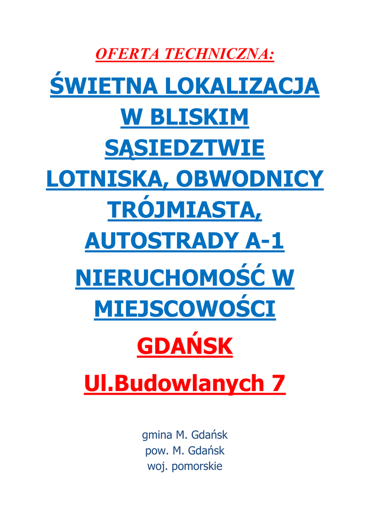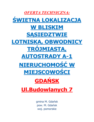OFERTA TECHNICZNA: ŚWIETNA LOKALIZACJA W BLISKIM SĄSIEDZTWIE LOTNISKA, OBWODNICY TRÓJMIASTA, AUTOSTRADY A-1 NIERUCHOMOŚĆ W MIEJSCOWOŚCI GDAŃSK Ul.Budowlanych 7 gmina M. Gdańsk pow. M. Gdańsk woj. pomorskie PRZEDMIOT OFERTY: Przedsiębiorstwo WAKOZ BUDOWNICTWO S.A. w upadłości likwidacyjnej z siedzibą w Luzinie, w skład którego wchodzą następujące składniki majątkowe: Prawo użytkowania wieczystego nieruchomości położonej w miejscowości Gdańsk, ul. Budowlanych 7, gmina Gdańsk, powiat Gdańsk, województwo pomorskie, obejmująca działkę nr 125/21, o powierzchni 947 m2 oraz nieruchomości lokalowe ( mieszkania ): lokal Nr. 1 położony na parterze, lokal Nr. 2 położony na parterze, lokal Nr. 3 położony na parterze, lokal Nr. 4 położony na I piętrze, lokal Nr. 5 położony na I piętrze, lokal Nr. 6 położony na I piętrze, lokal Nr. 7 położony na I piętrze, lokal Nr. 8 położony na I piętrze, lokal Nr. 9 położony na poddaszu, lokal Nr. 10 położony na poddaszu, lokal niewyodrębniony położony na parterze ( dawny osiedlowy sklep spożywczy ). Nieruchomość gruntowa, na której posadowiony jest budynek z wycenianymi lokalami mieszkalnymi oznaczona jest nr 125/21 i ma powierzchnię 947 m2. Kształt działki regularny, zbliżony do prostokąta. Budynek mieszkalny zlokalizowany jest w północnej części działki. Niezabudowana cześć działki wykorzystywana jest jako plac parkingowy oraz tereny komunikacji pieszej. Dojazd do nieruchomości od strony ulicy Budowlanych, wejście na klatkę schodową prowadząca do lokali mieszkalnych - od zaplecza budynku (za wyjątkiem wejścia do jednego z lokali na parterze , który był wcześniej wykorzystywany jako osiedlowy sklep spożywczy - wejście od frontu). Ponadto nieruchomość znakomicie z komunikowana jest z lotniskiem im. Lecha Wałęsy , portem morskim , obwodnicą Trójmiasta oraz autostradą A-1 . CHARAKTERYSTYKA BUDYNKU: Budynek przy ul. Budowlanych 7 jest budynkiem wolnostojącym, dwukondygnacyjnym z poddaszem użytkowym, niepodpiwniczonym. Konstrukcja budynku tradycyjna - murowana, dach drewniany, kopertowy, kryty dachówką ceramiczną Stropy drewniane. Klatka schodowa żelbetowa, wyłożona masą lastryko. Stolarka drzwiowa - drzwi wejściowe od zaplecza: aluminiowe. stolarka okienna - PCV. Elewacja nieocieplona nieotynkowana Budynek posiada wyposażenie w sieć wodno - kanalizacyjną , energetyczną oraz gaz doprowadzony do budynku. MAPKA LOKALIZACYJNA NIERUCHOMOŚCI: DOKUMENTACJA ZDJĘCIOWA NIERUCHOMOŚCI: Osoba kontaktowa: Jan Nowakowski Ul. Budowlanych 7 PL 80-298 Gdańsk, Polska +48/ 606-131-882 [email protected]
