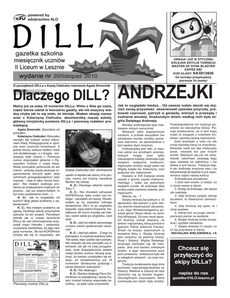powered by edubractwo IILO 20/listopad ʻ2010 Dlaczego DILL? O początkach DILLa z Kasią Cieliczko rozmawia Agata Drewniak Mamy już za sobą 19 numerów DILLa. Wielu z Was go czyta, część bierze udział w tworzeniu gazety, ale nie wszyscy wiedzą chyba jak to się stało, że istnieje. Miałam okazję rozmawiać z Katarzyną Cieliczko, absolwentką naszej szkoły, główną inicjatorką postania DiLLa i pierwszą redaktor prowadzącą. Agata Drewniak: Zacznijmy od początku. Katarzyna Cieliczko: Wszystko zaczęło się tydzień przed zebraniem Rady Pedagogicznej w sprawie ocen rocznych końcowych. Z jednej strony zawsze lubiłam robić coś dodatkowego, a z drugiej - motywacją była ocena..:) Pierwszy numer stworzyłam głównie z Ryszardem Cichym z mojej klasy. Wiele pomysłów podrzuciła mi też mama - zresztą często podczas organizowania różnych apeli, akcji szkolnych „przegadywałyśmy” plan imprezy – była to taka “burza mózgów”. Nie miałam żadnego problemu ze znalezieniem chętnych do pisania.. Jak już wspomniałam, to był czas wystawiania ocen...:) A. D.: Jak to wyglądało od kuchni? Były jakieś problemy z załatwianiem? K. C.: Nie miałam problemu ze zgodą, Dyrekcja szkoły przychylnie patrzyła na ten projekt. Pamiętam jednak jak w czasie tworzenia DILLa do sali informatycznej przyszedł major Handke i stwierdził, oczywiście żartobliwie, że daje nam parę numerów.. Bo był KOPERnick (chyba tak się to nazywało), ale Pierwszy numer DILLa Kasia Cieliczko (fot. archiwum) upadł i tu będzie tak samo:) A tu proszę, mamy już trzecią naczelną! Bardzo się cieszę. A. D.: Dlaczego właśnie nazwa 'DILL'? K. C.: Nie chciałam odnawiać KOPERnicka, tylko zrobić coś nowego - zaczęłam od nazwy. Zbudowałam ją na zasadzie luźnego skojarzenia: DILL to po angielsku koperek, nasz patron Kopernik. Dodatkowo dill brzmi troszkę jak interes, radzić sobie po angielsku, czyli deal. A. D.: Jaki był odbiór pierwszego numeru wśród społeczności szkolnej? K. C.: Jaki był odbiór... Z tego co pamiętam, to wydrukowaliśmy tylko 100 sztuk, więc szybko się rozeszło. Nie obeszło się bez pomyłek czy literówek, ale jak na czas przygotowań, brak doświadczenia jestem nadal bardzo dumna. Muszę przyznać, że bardzo ucieszyłam się widząc, że wydaliście(my) już 19 numerów! Serdecznie gratuluję i życzę dalszych sukcesów! A. D.: Nie dziękuję;) K. C.: Bardzo dziękuję Panu Dominikowi za współpracę i życzę mu, aby znalazł kolejną wspaniałą naczelną - za jakiś czas oczywiście. UWAGA! JUŻ W STYCZNIU KOLEJNA EDYCJA TURNIEJU MASTER OF DYNA BLASTER ZAPISZ SIĘ! KOD KLASY: KK4913926 Do turnieju przyjmujemy pierwsze 24 osoby! ANDRZEJKI Jak to wyglądało kiedyś... Od zawsze ludzie starali się dojrzeć swoją przyszłość: obserwowali zjawiska przyrody, próbowali czarować, patrzyli w gwiazdy, wierzyli w przesądy i cudowne amulety. Doskonałym dniem według nich była wigilia Świętego Andrzeja. Wróżby andrzejkowe były traktowane niczym wyrocznia! Wróżono tylko pojedynczym osobom, a przede wszystkim nie zdradzano wyniku wróżby, ponieważ wierzono, że opowiadanie o tym będzie złym omenem. Ciekawostką jest fakt, iż dawniej udział we wróżbach andrzejkowych mogły brać tylko niezamężne kobiety. Andrzejki były świętem wyłącznie kobiecym, mężczyźni wróżyć mogli sobie we Wigilię święta św. Katarzyny, czyli podczas tzw. katarzynek. Dopiero w XIX tradycja wróżb zeszła z gruntu czysto matrymonialnego i stała się jednolitym świętem wróżb. W andrzejki dziś wróżą sobie zarówno kobiety, jak i mężczyźni. Wiecie, że…? Święty Andrzej był jednym z 12 apostołów. Był jednym z tych, którzy wiernie towarzyszyli Jezusowi, a po Jego Wniebowstąpieniu poszedł głosić Słowo Boże na teren Azji Mniejszej. Za swe nauki apostoł Andrzej został skazany na śmierć męczeńską, którą poniósł w greckim Pátrai (obecnie Patras). Zmarł na krzyżu wykonanym w kształcie litery x. Święty Andrzej jest uważany za patrona Grecji, Rosji i Szkocji. Wigilię Świętego Andrzeja obchodzi się 30 listopada. Jest ona bardzo ciekawym dniem, a jego wieczorowa pora jest uznawana - zwłaszcza było tak w odległych wiekach - za czas magiczny. Tradycja świętowania tego dnia pochodzi najprawdopodobniej ze Szkocji. Właśnie w Szkocji do dziś obchodzi się ją bardzo bogato. Szczególnymi zwyczajami, które cechowały ten dzień, były wróżby. Prawdopodobnie ich tradycja pochodzi ze starożytnej Grecji. Panuje przekonanie, że w tym kraju miało to związek z imieniem Andreas i grecką nazwą mężczyzny. Dziś andrzejki z roku na rok coraz bardziej tracą na znaczeniu. Niewiele osób już leje tradycyjny wosk, niewiele też jest innych wróżb. Starszym się już nie chce, młodzi natomiast uważają tego typu zabawę za zabobony i nie widzą w tym sensu. Tradycja wigilii św. Andrzeja znacznie traci i za kilkadziesiąt lat będzie to już zapomniana część naszej kultury. Andrzejkowe przysłowia: 1.Dziś cień wosku ci ukaże, co ci życie niesie w darze. 2. Śnieg na Andrzeja, dla zboża zła nadzieja. 3. Gdy Andrzej zwiąże ziemię łyczkiem, to Katarzyna rzemyczkiem 4. Gdy Andrzej się zjawi, to i zimę postawi, 5. Której but na progu stanie pierwsza panna na wydanie. 6. Święty Andrzej wróży szczęście i szybkie zamęście. 7. Święty Andrzej Ci ukaże, co Ci los przyniesie w darze. MICHALINA WIELEBIŃSKA, 1A Chcesz się przyłączyć do ekipy DILLa? napisz do nas [email protected] Kręci się! [2] Chodzi o zdjęcia obrotowe wykonane przez Natalię Fiebig, uczennicę klasy 3E. Zdjęcia te - ukazujące budynek szkoły i Orlik - są dostępne na stronie internetowej naszego liceum i nie tylko. DYNA DAY K. M. :Skąd w ogóle wziął się pomysł wykonania takich zdjęć? N. F. : Pomysł niewątpliwie narodził się z potrzeby zrobienia czegoś nowego i nietradycyjnego. Nieeleganckie byłoby 