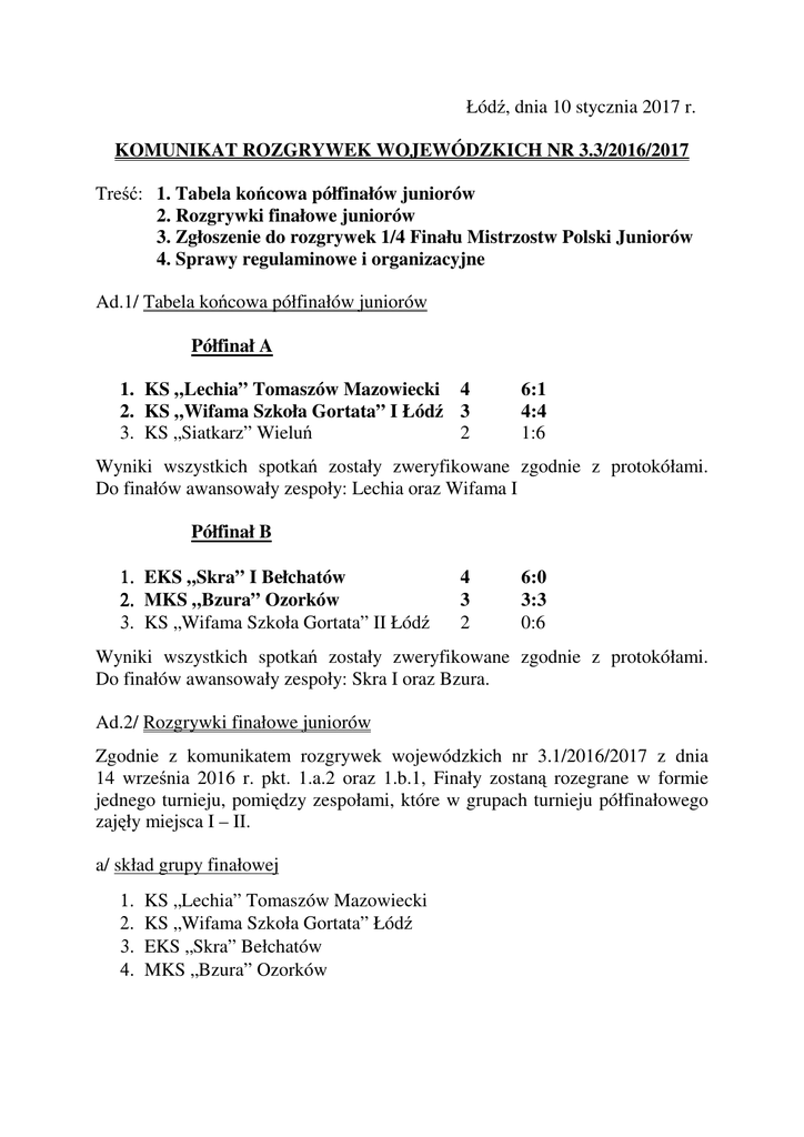 Łódź, dnia 10 stycznia 2017 r. KOMUNIKAT ROZGRYWEK