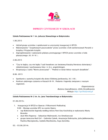 IMPREZY CZYTELNICZE W SZKOŁACH Szkoła Podstawowa Nr 1 im. Juliusza Słowackiego w Białymstoku 1.06.2015 Udział grupy uczniów z opiekunami w uroczystej inauguracji 4 BTCD. Wykonywanie " książkowych paszczaków" przez uczniów z kół zainteresowań Poranki z książką i Przyjaciele książki. Zaprojektowanie i wykonanie plakatu promującego 4 BTCD przez uczniów z koła plastycznego /kl. IV-VI /. 2.06.2015 "Czy to bajka, czy nie bajka "czyli kwadrans ze światową klasyką literatury dziecięcej i młodzieżowej ( wychowawcy klas i n-le j. angielskiego). Ekspozycja z cyklu "Warto przeczytać" - "Podróż w świat lektur naszych dziadków". 8.06. 2015 Spotkanie z autorką książek dla dzieci Elżbietą Janikowską /kl. I-III/. Konkurs pięknego czytania w klasach III-IV . Podania i legendy związane z naszym regionem. Organizatorzy: Bożena Gawryłkiewicz, Zofia Strzałkowska Relacja: http://sp1bialystok.pl Szkoła Podstawowa Nr 2 im. ks. Jana Twardowskiego w Białymstoku 01.06.2015r. 1. Inauguracja IV BTCD w Operze i Filharmonii Podlaskiej 9:00 – Występ uczniów SP2 na scenie Opery: rap Białostockie legendy według tekstu Pani Ewy Kosińskiej w wykonaniu Marty Brzosko duet Mini Raperzy – Sebastian Malinowski, Ivo Omelianczuk grupa taneczna Red Girl - Gabriela Cylwik, Anastazja Dobrzycka, Julia Jabłonowska, Paulina Maciejewska, Izabela Wasilewska, Kaja Zaremba. 02.- 03.06.2014r. 1 1. Głośne czytanie w wykonaniu nauczycieli naszej szkoły. W klasach 4-6 nauczyciel rozpoczyna lekcję czytaniem fragmentu wybranej książki: Legendy i podania polskie – M. Orłoń, Legendy Podlasia – T. Lippoman 2. Głośne czytanie w wykonaniu zaproszonych gości uczniom kl. Ia Pani Sarosiek – specjalista logopeda i nauczyciel PS nr 51 Pani Maria Dowgiert – babcia Karola (O Janku Wędrowniczku- M. Konopnickiej) Pani Elżbieta Śliperacka – babcia Poli 3. Klasowy Konkurs Pięknego Czytania w kl. Ia 4. Konkurs czytelniczy w świetlicy szkolnej Ilustracja dowolnej książki wybranej ze Złotej Listy Fundacji ABC XXI. 5. Czytanie recenzji ciekawych książek wyróżnionych w akcji “Czytam, bo lubię”, prowadzonej w ramach kampanii społecznej “Czytam, więc wiem” przez Kurier Poranny i Gazetę Współczesną w bibliotece szkolnej – nauczyciele bibliotekarze. 10.06.2015r. godz. 8:55 1. Głośne czytanie uczniom kl. I-III w wykonaniu Pani mjr SG Katarzyny Zdanowicz z Podlaskiego Oddziału Straży Granicznej w Białymstoku. 11.06.15r. 1. ŚWIĘTO KSIĄŻKI – turniej czytelniczy klas III-VI „Z książką za pan brat”. 2. Całoroczna akcja czytania przedszkolakom z Przedszkoli nr 51 oraz 53. Organizatorzy: Jolanta Kosobko, Kinga Wołowicz Relacja: http://sp2bialystok.edupage.org/ Szkoła Podstawowa Nr 3 im. Adama Mickiewicza Zespołu Szkół Nr 2 w Białymstoku 1. Udział w uroczystej inauguracji 4.BTCD w Operze i Filharmonii Podlaskiej. 2. Spotkania z gośćmi zaproszonymi przez organizatorów 4. BTCD. 3. Uczniowie PG nr 29 S im. A. Mickiewicza czytają dzieciom z klas młodszych SP nr 3 im. A. Mickiewicza w Białymstoku w ramach programu ,,Szkolna siostra, szkolny brat stwórzmy najmłodszym bezpieczny świat". 4. ,,Bohater mojej ulubionej książki" - konkurs i wystawa prac plastycznych. 5. ,,Hans Christian Andersen" - wystawa w bibliotece szkolnej. Organizatorzy: Grażyna Danilczuk Relacja: http://www.sp3bialystok.szkolnastrona.pl/ Szkoła Podstawowa Nr 4 im. Sybiraków w Białymstoku W tym roku obchody przebiegną pod hasłem: „Literatura ponad granicami”. W ramach akcji odbędzie się: 1. przygotowanie przez uczniów plakatów informacyjnych o danym państwie, 2. czytanie legend w różnych językach przez nauczycieli i gości, 2 3. prezentowanie sylwetek najbardziej znanych pisarzy dziecięcych danego kraju, 4. wystawki książek prezentowanych państw Głośne czytanie w świetlicy szkolnej. Każdy dzień Białostockiego Tygodnia Czytania Dzieciom rozpocznie się w naszej szkole od czytania fragmentu wybranej książki przez nauczycieli. 01.06.2015r. (poniedziałek ) 10:00 – Uczestnictwo uczniów SP 4 w Inauguracji IV BTCD w Operze i Filharmonii Podlaskiej 2 czerwca 2015r. (wtorek) - DZIEŃ NIEMIECKI czyta pan Łukasz Krawczyk 3 czerwca 2015. (środa) 9.50 czyta Magdalena Kraszewska pracownik CEN w Białymstoku - DZIEŃ ROSYJSKI czyta Walentyna Zagrzejewska 8 czerwca 2015r. (poniedziałek) - DZIEŃ ANGIELSKI czyta Monika Malinowska 9 czerwca 2015r. (wtorek ) - DZIEŃ BIAŁORUSKI 8.55 – asp. Alina Andrysewicz - czyta legendę „Dwa krzyżackie miecze” ze zbioru „Legendy i klechdy polskie” . 10.45 11.25 czyta Krzysztof Bitdorf aktor Białostockiego Teatru Lalek 10 czerwca 2015r. (środa) - DZIEŃ JAPOŃSKI czyta Anna Kuligowska Organizatorzy: Lucyna Lenart, Małgorzata Chmielewska Relacja: http: //www.sp4bialystok Szkoła Podstawowa Nr 5 im. Władysława Broniewskiego Zespołu Szkół Nr 5 w Białymstoku 1. Uroczyste podsumowanie konkursu organizowanego przez Bibliotekę "Najaktywniejszy czytelnik-klasa w szkole’’. 2. Wystawa ,,Bajkowy świat ‘’. 3. Przedstawienia teatralne "Żywa książka" – seria krótkich przedstawień książek znanych autorów baśni. 4. Akcja czytania ,,Dzieci – dzieciom’’ w zerówce szkolnej , świetlicy i Przedszkolu Samorządowym Nr 21. 5. Konkurs na Zakładkę do książek dla klas I –VI. 6.Quiz czytelniczy dla klas V-VI. Organizatorzy: Monika Szorc Szkoła Podstawowa Nr 6 im. Jarosława Iwaszkiewicza w Białymstoku 1.06 Udział grupy sześciolatków z opiekunami w Inauguracji 4 BTCD. 2.06 8.30 Warsztaty literackie dla kl.IIIa i IIIc w Filii Książnicy Podlaskiej nr 15 z p. G. Kozłowską, aktorką BTL. 8.55 E.Żebrowska aktorka BTL czyta wybrany utwór kl. Vd. 8.55 M.Godlewska-Siwerska (Galeria Arsenał) czyta wybrany utwór kl.VIb. Wystawa prac dzieci z kl.I-III "Moja ulubiona postać z baśni"- podsumowanie konkursu 3 3.06 8.00 Podpor. J. Kuczyńska z Podlaskiego Oddziału Straży Granicznej czyta wybrany 