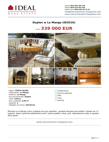 telefon 0034 603 390 766 telefon 0034 616 954 502 telefon biuro 0034 865 68 79 45 [email protected] www.nieruchomosci-hiszpania.com Duplex w La Manga (ID3516) cena: region: COSTA CALIDA miejscowość: La Manga dzielnica: La Manga typ nieruchomości: Duplex rynek: wtórny pow. użytkowa: 0.00 m2 sypialnie: 4 odległość od morza: 100.00 km 339 000 EUR umeblowanie kuchnia oddzielna AGD taras parking Blizniak w La Manga, ktory znajduje sie przy wjeździe , posiada fantastyczne widoki i sklada sie z 4 sypialni, dwoch lazienek,oddzielnej kuchni, salonu-jadalni, taras, grill, zabudowane szafy w sypialni, duży garaż. www.nieruchomosci-hiszpania.com Side 1 / 1 Powered by TCPDF (www.tcpdf.org)