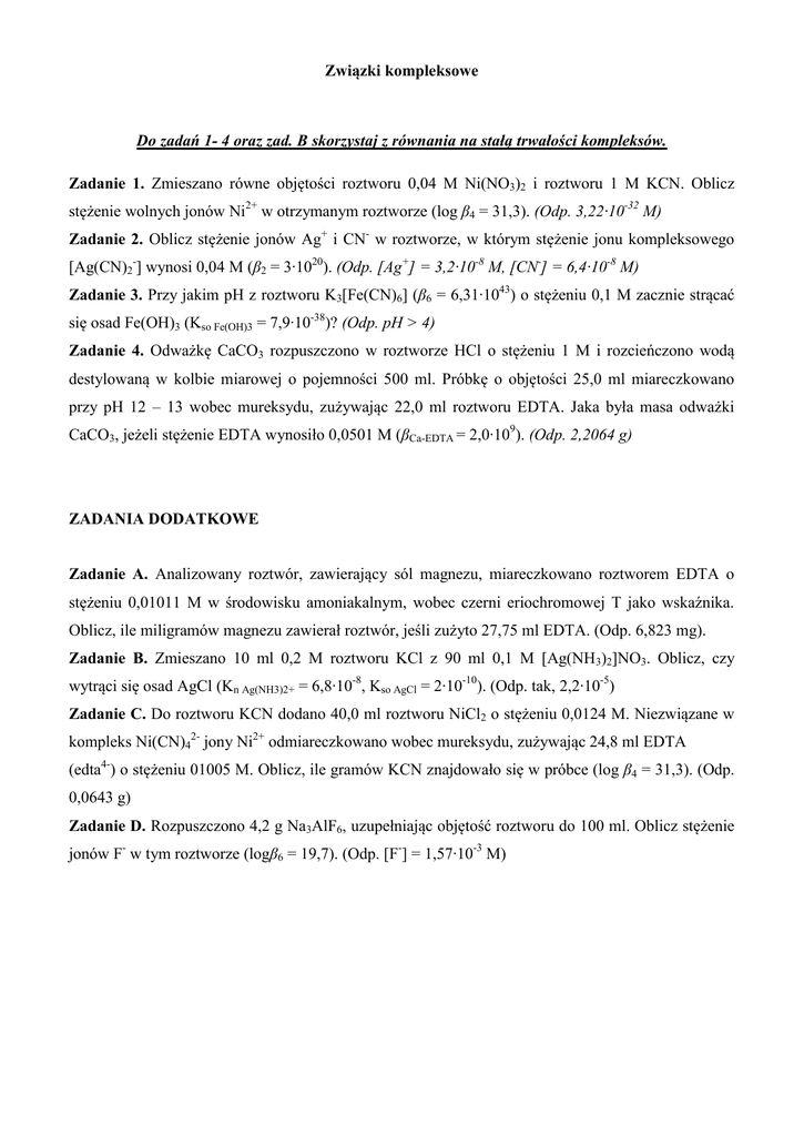 Związki kompleksowe Do zadań 1- 4 oraz zad. B skorzystaj z równania na stałą trwałości kompleksów. Zadanie 1. Zmieszano równe objętości roztworu 0,04 M Ni(NO3)2 i roztworu 1 M KCN. Oblicz stężenie wolnych jonów Ni2+ w otrzymanym roztworze (log β4 = 31,3). (Odp. 3,22∙10-32 M) Zadanie 2. Oblicz stężenie jonów Ag+ i CN- w roztworze, w którym stężenie jonu kompleksowego [Ag(CN)2-] wynosi 0,04 M (β2 = 3∙1020). (Odp. [Ag+] = 3,2∙10-8 M, [CN-] = 6,4∙10-8 M) Zadanie 3. Przy jakim pH z roztworu K3[Fe(CN)6] (β6 = 6,31∙1043) o stężeniu 0,1 M zacznie strącać się osad Fe(OH)3 (Kso Fe(OH)3 = 7,9∙10-38)? (Odp. pH > 4) Zadanie 4. Odważkę CaCO3 rozpuszczono w roztworze HCl o stężeniu 1 M i rozcieńczono wodą destylowaną w kolbie miarowej o pojemności 500 ml. Próbkę o objętości 25,0 ml miareczkowano przy pH 12 – 13 wobec mureksydu, zużywając 22,0 ml roztworu EDTA. Jaka była masa odważki CaCO3, jeżeli stężenie EDTA wynosiło 0,0501 M (βCa-EDTA = 2,0∙109). (Odp. 2,2064 g) ZADANIA DODATKOWE Zadanie A. Analizowany roztwór, zawierający sól magnezu, miareczkowano roztworem EDTA o stężeniu 0,01011 M w środowisku amoniakalnym, wobec czerni eriochromowej T jako wskaźnika. Oblicz, ile miligramów magnezu zawierał roztwór, jeśli zużyto 27,75 ml EDTA. (Odp. 6,823 mg). Zadanie B. Zmieszano 10 ml 0,2 M roztworu KCl z 90 ml 0,1 M [Ag(NH3)2]NO3. Oblicz, czy wytrąci się osad AgCl (Kn Ag(NH3)2+ = 6,8∙10-8, Kso AgCl = 2∙10-10). (Odp. tak, 2,2∙10-5) Zadanie C. Do roztworu KCN dodano 40,0 ml roztworu NiCl2 o stężeniu 0,0124 M. Niezwiązane w kompleks Ni(CN)42- jony Ni2+ odmiareczkowano wobec mureksydu, zużywając 24,8 ml EDTA (edta4-) o stężeniu 01005 M. Oblicz, ile gramów KCN znajdowało się w próbce (log β4 = 31,3). (Odp. 0,0643 g) Zadanie D. Rozpuszczono 4,2 g Na3AlF6, uzupełniając objętość roztworu do 100 ml. Oblicz stężenie jonów F- w tym roztworze (logβ6 = 19,7). (Odp. [F-] = 1,57∙10-3 M)