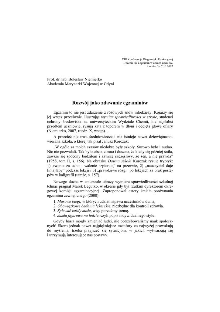XIII Konferencja Diagnostyki Edukacyjnej Uczenie się i egzamin w oczach uczniów. Łomża, 5 - 7.10.2007 Prof. dr hab. Bolesław Niemierko Akademia Marynarki Wojennej w Gdyni Rozwój jako zdawanie egzaminów Egzamin to nie jest zdarzenie z różowych snów młodzieży. Kojarzy się jej wręcz przeciwnie. Ilustrując wymiar sprawiedliwości w szkole, studenci ochrony środowiska na uniwersyteckim Wydziale Chemii, nie najsłabsi przedtem uczniowie, rysują kata z toporem w dłoni i odciętą głowę ofiary (Niemierko, 2007, rozdz. X, wstęp)… A przecież nie trwa średniowiecze i nie istnieje nawet dziewiętnastowieczna szkoła, o której tak pisał Janusz Korczak: „W ogóle za moich czasów niedobre były szkoły. Surowo było i nudno. Nic nie pozwalali. Tak było obco, zimno i duszno, że kiedy się później śniła, zawsze się spocony budziłem i zawsze szczęśliwy, że sen, a nie prawda” (1958, tom II, s. 156). Na obrazku Dawna szkoła Korczak rysuje tryptyk: 1) „rwanie za ucho i walenie szpicrutą” na przerwie, 2) „nauczyciel daje linią łapy” podczas lekcji i 3) „prawdziwe rózgi” po lekcjach za brak postępów w kaligrafii (tamże, s. 157). Nowego ducha w zmurszałe obrazy wymiaru sprawiedliwości szkolnej tchnąć pragnął Marek Legutko, w okresie gdy był rzutkim dyrektorem okręgowej komisji egzaminacyjnej. Zaproponował cztery śmiałe porównania egzaminu zewnętrznego (2000): 1. Masowe biegi, w których udział napawa uczestników dumą. 2. Obowiązkowe badania lekarskie, niezbędne dla kontroli zdrowia. 3. Śpiewać każdy może, więc porzućmy tremę. 4. Jazda figurowa na lodzie, czyli popis indywidualnego stylu. Gdyby hasła mogły zmieniać ludzi, nie potrzebowaliśmy nauk społecznych! Skoro jednak nawet najpiękniejsze metafory co najwyżej prowokują do myślenia, trzeba przyjrzeć się sytuacjom, w jakich wytwarzają się i utrzymują interesujące nas postawy. I. Egzamin jako fakt kulturowy Kultura, rozumiana jako całokształt dorobku społeczeństwa, cechuje się inercją zapewniająca ciągłość. Jest źródłem i motorem edukacji, bo do jej utrzymania konieczne jest przygotowanie kolejnych pokoleń. W ślad za tym podążają egzaminy, czyli próby potwierdzające to przygotowanie. O doniosłości dawnych egzaminów świadczy ich obrastanie legendą. Inicjacja w plemionach myśliwskich, pasowanie na rycerza w średniowieczu, wyzwolenie cechowe, święcenia kapłańskie, przedwojenna matura – oto przykłady doświadczeń, które mogły być najważniejsze w życiu. Obok nich płynęły szerokim, choć powolnym nurtem mniejsze, powszednie próby węższych umiejętności: rzemieślniczych, gospodarskich, opiekuńczych, przywódczych – składające się na karierę każdego człowieka. Czy postęp cywilizacyjny uwolni nas od egzaminów? Nie sądzę. Kultura rozwija się z przyspieszeniem, specjalizacja postępuje, odpowiedzialność za zachowanie – w rodzinie, biurze, zakładzie produkcyjnym, sklepie, samochodzie, Internecie – rośnie, choć nie dość szybko. Dlaczego więc egzaminy szkolne tak mało kojarzą się polskiej młodzieży z rozwojem?1 Pierwsza, gotowa odpowiedź na to pytanie brzmi: bo nasza młodzież jest mało zainteresowana własnym rozwojem. Badania Marii Dudzikowej, co prawda sprzed piętnastu laty (1993), przeprowadzone wśród uczniów szkół średnich, przyniosły następujący obraz: I. Około 24 procent uczniów oświadczyło, że nie pracują i nie będą pracowali nad sobą. Odwoływali się do „natury” człowieka, do porażek we wcześniejszych próbach, do faktu, iż „podnoszenie poprzeczki może zadać wiele ran” i do przekonania, że „życie należy przyjmować takie, jakie jest”. II. Aż 40 procent uczniów wyraziło gotowość rozpoczęcia pracy nad sobą, gdy pojawi się w otoczeniu wzór do naśladowania. Potrzebny jest im „holownik wyciągający na czyste wody”, bliski przyjaciel, który „dostrzegłby [ich] błędy i służyłby dobrą radą, mądrą i rzeczową”. Takich przyjaciół pragnie aż 83 procent ogółu, ale gdzie ich znaleźć w tej liczbie? III. Około 21 procent uczniów ogranicza pracę nad sobą do unikania błędów i do zapobiegania „pogarszaniu się charakteru”. Po porażkach, jakich kiedyś doznali, postanowili „pilnować się, aby znowu 1 Napisałem „polskiej”, bo obserwacje dokonane za granicą, w tym zwłaszcza w Stanach Zjednoczonych, i doświadczenia pedagogów pracujących na Dalekim Wschodzie wydają się świadczyć, że może być inaczej. czegoś nie wywinąć”. Chcieliby zachować swój stan obecny, nawet kosztem wyrzeczeń, tłumienia uczuć, izolacji od otoczenia. IV. Tylko 16 procent uczniów ma pozytywny program samodoskonalenia: rozpoznawania sił, koncentracji, hartowania się, ćwiczenia, budzenia odwagi. Dokonuje wyboru wartości „na całe życie” i wierzy, że uda się je utrzymać. Szkoła odgrywa w tych planach rolę tylko pomocniczą i stale muszą „bronić się przed wtłoczeniem w szkolne i inne rameczki”. Tak więc niemal 2/3 uczniów szkół średnich (grupy I i II) przyznaje, że nie pracuje nad sobą, co oznacza brak zainteresowania własnym rozwojem. Egzaminy stanowią dla nich głos z innego świata, odległego od bieżących zainteresowań. Gdy zadanie do wykonania jest traktowane jako obce, motywacja do jego wykonania ulega osłabieniu. Tak jest zapewne w przypadku egzaminów szkolnych u większości młodzieży. Według Wiesława Łukaszewskiego (2002), który przez zadanie rozumie wyobrażenie pożądanego wyniku określonego działania, zadania mogą być „własne”, podejmowane z motywacją wewnętrzną, czyli ze względu na zadowolenie z wykonywanej czynności, lub „narzucone”, podejmowane z motywacją zewnętrzną, czyli dla korzyści płynących z uzyskania określonego wyniku czynności. Tylko pierwszy rodzaj zadań wspomaga rozwój jednostki. Analogie literaturowe nie wystarczą jednak do 