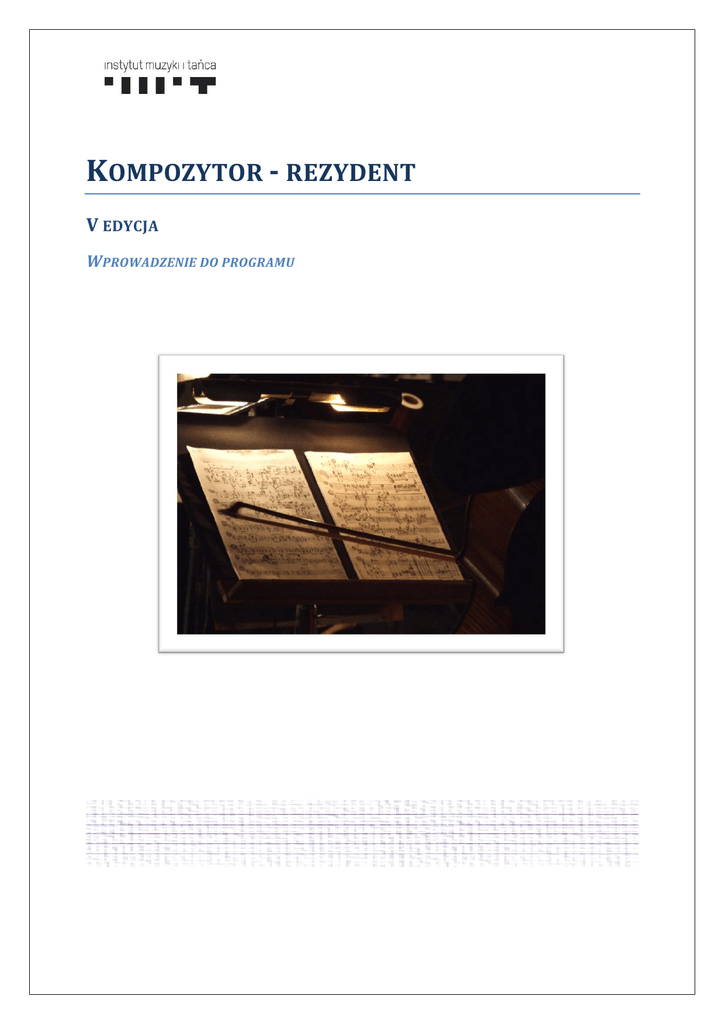 KOMPOZYTOR - REZYDENT V EDYCJA WPROWADZENIE DO PROGRAMU Wstęp Niniejszy dokument pełni funkcję skrótowego przewodnika po programie „Kompozytor - rezydent”, ale może posłużyć także jako zestaw podstawowych zasad regulujących współpracę twórców i wykonawców. Nie opisuje jak skomponować utwór lub w jakim stylu powinna zostać stworzona kompozycja, ale podaje kilka podstawowych podpowiedzi natury czysto organizacyjnej. Akt kreacji utworu jest zawsze zjawiskiem indywidualnym. Podobnie jak interpretacja nowego utworu, dająca możliwość zaproponowania czegoś całkowicie nowego i niepowtarzalnego. Jak się odnaleźć Zamówienia twórcze od zawsze są motorem wszelkiej sztuki. W dzisiejszych czasach artyści wykonawcy coraz częściej dają impuls do powstawania nowych dzieł. Inicjatywa artystycznej współpracy może jednak i powinna wychodzić z obu stron. Jak w każdym owocnym i kreatywnym związku musi zaistnieć także swoista „alchemia”, która sprawi, że całość stanie się czymś więcej niż sumą jej części. Elitarność środowiska muzycznego sprawia, że drogi twórców i artystów wykonawców nieustannie i często od najmłodszych lat się krzyżują. Dodatkowe możliwości stwarza dziś także Internet, ułatwiający dostęp do informacji i skracający formy kontaktu. Kiedy rozpoczyna się poszukiwania partnera artystycznego, warto postawić sobie jednak pewne pytania. Czy wykonawca szuka kompozytora o określonym wizerunku stylistycznym i estetycznym? Już znanego czy może jeszcze nie odkrytego? Czy kompozytor poszukuje sprawdzonych wykonawców czy może interesują go działania eksperymentalne. Jak znaleźć kompozytora W Polsce największą organizacją zrzeszającą twórców jest Związek Kompozytorów Polskich (www.zkp.org.pl). W jego ramach działa Koło Młodych Kompozytorów. Na stronie internetowej Polskiego Centrum Informacji Muzycznej (www.polmic.pl) znaleźć można sylwetki kompozytorów i spisy ich twórczości. Młodzi kompozytorzy często posiadają własne strony internetowe, które dostarczają pełną informację na temat ich twórczości. Organizowane są także konkursy kompozytorskie dla młodych twórców (m.in im. Tadeusza Bairda, Artura Malawskiego, Tadeusza Ochlewskiego), które pozwalają śledzić pojawiające się nowe twarze i przyszłe talenty. Ponadto corocznie polskie akademie muzyczne opuszcza kilku świeżo upieczonych kompozytorów, których utwory pojawiają się w programach festiwali muzyki współczesnej (np. Warszawskiej Jesieni, Festiwalu Prawykonań w Katowicach). Jak nawiązać kontakt z wykonawcą W Polsce stałą działalność artystyczną prowadzi ponad 40 orkiestr od filharmonii poprzez zespoły radiowe, orkiestry kameralne i smyczkowe po orkiestry młodzieżowe oraz kilka chórów zawodowych i wiele zespołów chóralnych prowadzących regularną działalność koncertową na profesjonalnym poziomie. Każdy z tych zespołów może być potencjalnym partnerem w programie „Kompozytor – rezydent”. Listę orkiestr i chórów można znaleźć na stronach Polskiego Centrum Informacji Muzycznej, a szczegółowe informacje na stronach internetowych poszczególnych instytucji. Informacje o zespołach opublikowane zostały także przez Instytut w Raporcie o stanie muzyki polskiej, który jest dostępny w wersji elektronicznej na stronie IMIT w zakładce „materiały”. Rozmowę na temat rezydencji najlepiej przeprowadzić osobiście z dyrektorem artystycznym lub pierwszym dyrygentem zespołu. Warto wcześniej wysłać kilka wybranych kompozycji w formie partytur i nagrań. Generalne zasady programu Program „Kompozytor - rezydent” adresowany jest do kompozytorów młodszych oraz do zawodowo działających zespołów orkiestrowych i chóralnych. Istotą programu jest prezentacja w ciągu jednego sezonu artystycznego przynajmniej trzech utworów kompozytora - rezydenta w tym obligatoryjne zamówienie i prawykonanie jego nowego utworu. Prezentowanych utworów może być więcej, a dodatkowe sposoby współpracy mogą przybierać różne formy (np. spotkań z publicznością, warsztatów). Należy pamiętać także o tym, że w ramach rezydencji wykonywać można nie tylko utwory orkiestrowe, ale także solowe, kameralne czy chóralne i wykonywać je na różnorodnych koncertach, w tym na organizowanych lub firmowanych przez zespół festiwalach czy cyklach koncertowych. Wpływa to na różnorodność i atrakcyjność prezentacji sylwetki kompozytora i umożliwia jak najbardziej pełne zaprezentowanie go publiczności. W programie mogą wziąć udział polscy kompozytorzy do 40. roku życia, a więc w V edycji dotyczy ona twórców urodzonych od 1 stycznia 1975 roku. Jeden kompozytor lub jedna instytucja zakwalifikowani do programu mogą wziąć udział w edycji programu raz na dwa lata. Dofinansowanie oferowane w ramach programu „Kompozytor - rezydent” może obejmować wyłącznie dodatkowe koszty bezpośrednio wynikające z zamówienia i prawykonania utworu kompozytora-rezydenta oraz wykonania innych jego dzieł. Nie jest możliwe otrzymanie dofinansowania na wynagrodzenia etatowych pracowników artystycznych i administracyjnych, zakupy inwestycyjne oraz wszelkie standardowe działania łączące się z organizacją, promocją i obsługą koncertów. Program „Kompozytor - rezydent” uzupełnia się z priorytetem Ministra Kultury i Dziedzictwa Narodowego „Zamówienia kompozytorskie”, program „Kolekcje”. Podczas gdy „Zamówienia kompozytorskie” dotyczą zamówienia i prawykonania jednego utworu, program „Kompozytor-rezydent” związuje kompozytora z instytucją na cały sezon artystyczny. Podstawowe zasady współpracy Współpraca artystyczna wymaga szczegółowego planowania, jasno sprecyzowanych oczekiwań i dobrej komunikacji. Obie strony muszą jasno określić zasady współpracy, a później respektować realizację zawartego pomiędzy sobą porozumienia oraz kwestie o