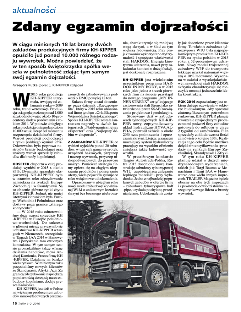 ’ aktualnosci Zdany egzamin dojrzałości W ciągu minionych 18 lat bramy dwóch zakładów produkcyjnych firmy KH-KIPPER opuściło już ponad 10.000 różnego rodzaju wywrotek. Można powiedzieć, że w ten sposób świętokrzyska spółka weszła w pełnoletność zdając tym samym swój egzamin dojrzałości. Grzegorz Rutka (oprac.), KH-KIPPER (zdjęcia) W 2015 roku produkcja KH-KIPPER utrzymała, trwający od załamania rynku w 2009 roku, trend wzrostowy. Produkcja osiągnęła poziom ponad 1.000 sztuk odnotowując około 10-procentowy skok w porównaniu z rokiem 2014. W połowie ubiegłego roku produkcja osiągnęła poziom 10.000 sztuk, licząc od momentu rozpoczęcia działalności firmy. Wzrost produkcji pochodzącej z rynku polskiego wyniósł 25%. Odczuwalna była poprawa nastrojów branży budowlanej oraz znaczny wzrost sprzedaży zabudów dla branży kopalnianej. Odsetek eksportu w całej produkcji wyniósł w 2015 r. około 85%. Dynamika sprzedaży eksportowej KH-KIPPER była w ostatnim roku zdecydowanie największa na rynkach Europy Zachodniej i w Skandynawii. Są to obecnie główne rynki zbytu KH-KIPPER. Jednak nie mniej istotnymi kierunkiem była Europa Wschodnia i Południowa oraz dostawy poza granice „starego kontynentu”. — W 2015 roku odnotowaliśmy duży wzrost sprzedaży KH -KIPPER w Europie południowo-wschodniej. Do sukcesu w głównej mierze przyczyniło się uczestnictwo KH-KIPPER w targach w Niemczech, szczególnie w Targach IAA 2014 w Hanowerze i pozyskanie tam owocnych kontraktów. W tym samym czasie prowadziliśmy także własne działania handlowe, mówi Andrzej Kamionka, Prezes firmy KH -KIPPER. Działamy na bardzo wielu rynkach. W minionym roku pozyskaliśmy nowych klientów ze Skandynawii, Afryki i Azji. Za granicą zdecydowanie największą popularnością cieszą się nasze zabudowy kopalniane, dodaje prezes Kamionka. KH-KIPPER jest dziś w Polsce największym producentem zabudów samowyładowczych przezna- 16 Trailer 1–2 2016 czonych do zabudowywania podwozi o DMC powyżej 12 ton. Sukces firmy został doceniony przez dziennik „Rzeczpospolita”, który w 2015 roku uhonorował firmę tytułem „Orła Eksportu Województwa Świętokrzyskiego”. Spółka KH-KIPPER została laureatem nagrody w dwóch kategoriach „Najdynamiczniejszy eksporter” oraz „Najlepszy debiut w eksporcie”. Z zakładów KH-KIPPER co tydzień wyjeżdża ponad 20 zabudów, w tym cała gama wywrotek, urządzeń hakowych, przyczep i naczep wywrotek, przyczep niskopodwoziowych do przewozu maszyn. Ponieważ strategia firmy opiera się na ciągłym ulepszaniu produktów i poszerzaniu oferty, wiele pojazdów zyskuje co roku wciąż nowe udoskonalenia. Opracowany w ubiegłym roku nowy model zabudowy kopalnianej W1M o unikatowym kształcie skrzyni bez bocznego użebrowa- nia, charakteryzuje się mniejszą wagą skrzyni, a w ślad za tym większą ładownością. Przy projektowaniu wykorzystano wytrzymałość i sprężyste właściwości stali HARDOX. Energia kinetyczna uderzenia, nawet przy załadunku kamieni o dużej frakcji, jest doskonale rozpraszana. KH-KIPPER jest wieloletnim uczestnikiem programu HARDOX IN MY BODY, a w 2015 roku jako jedna z trzech pierwszych firm na świecie przystąpił do nowego programu „MY INNER STRENX” certyfikującego zastosowania stali Strenx jako zatwierdzone przez SSAB rozwiązania projektowe i produkcyjne. Stosowany dziś w zabudowach tylnozsypowych KH-KIPPER nowy, zoptymalizowany układ hydrauliczny HYVA ALPHA, pozwolił skrócić o około 20% czas podnoszenia i opuszczania skrzyni. Lżejszy, a zarazem mocniejszy system hydrauliczny pracujący na wysokim ciśnieniu zwiększa także ładowność wywrotki. W prestiżowym konkursie Targów Autostrada-Polska, Rotra 2015 doceniono nową konstrukcję zabudowy tylnozsypowej W1U zapobiegającą zaleganiu lepkiego materiału przy wyładunku. Jedna z najbardziej popularnych zabudów w ofercie firmy – zabudowa tylnozyspowa half -pipe, uzyskała pochyloną przednią ścianę. Udoskonalenia zosta- ły już docenione przez klientów firmy. To właśnie zabudowa tylnozsypowa W1U była najpopularniejszym produktem KH-KIPPER na rynku polskim w 2015 roku, z 52-procentowym udziałem. Nowy model trójstronnej zabudowy W3F do transportu lekkiego uzyskał natomiast większą o 10% ładowność. Wykonana w całości z wysokojakościowej, szwedzkiej stali HARDOX skrzynia charakteryzuje się niezwykle mocną i jednocześnie lekką konstrukcją. Rok 2016 zapowiadany jest rokiem dużego ożywienia w sektorze budowlanym. Aby sprostać zintensyfikowanym potrzebom rynkowym, KH-KIPPER planuje stworzenie z największymi producentami podwozi floty zabudów gotowych do odbioru w ciągu 2 tygodni od zamówienia. Plan sprzedaży zakłada wzrost ilości zamówień o kolejne 10%. Realizacja tego celu będzie możliwa dzięki zintensyfikowaniu sprzedaży na rynkach Europy Zachodniej, Skandynawii i Afryki. W tym roku KH-KIPPER planuje udział w dużych międzynarodowych wydarzeniach, takich jak Targi Bauma w Monachium i Targi IAA w Hanowerze oraz wielu innych imprezach. TRAILER Magazine będzie obecny na obu tych imprezach i z pewnością odwiedzi stoiska naszego rynkowego lidera w branży wywrotek. n