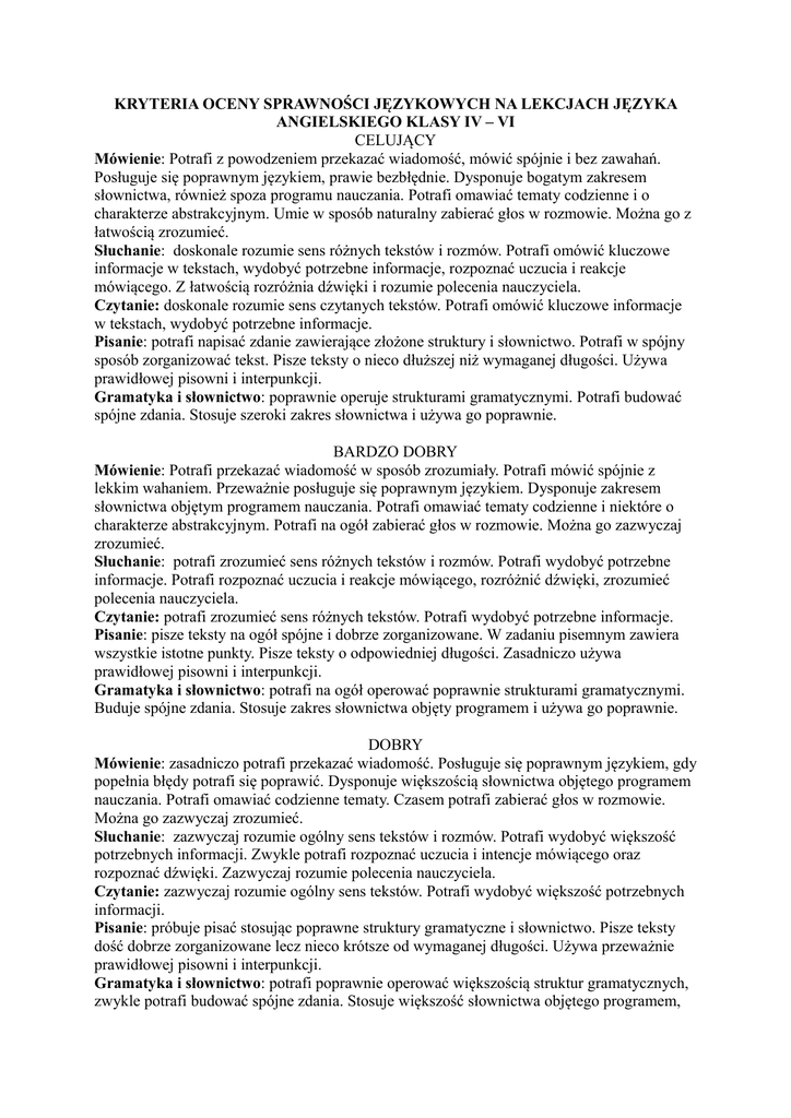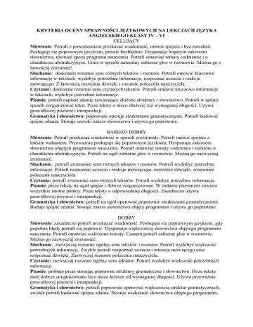 KRYTERIA OCENY SPRAWNOŚCI JĘZYKOWYCH NA LEKCJACH JĘZYKA ANGIELSKIEGO KLASY IV – VI CELUJĄCY Mówienie: Potrafi z powodzeniem przekazać wiadomość, mówić spójnie i bez zawahań. Posługuje się poprawnym językiem, prawie bezbłędnie. Dysponuje bogatym zakresem słownictwa, również spoza programu nauczania. Potrafi omawiać tematy codzienne i o charakterze abstrakcyjnym. Umie w sposób naturalny zabierać głos w rozmowie. Można go z łatwością zrozumieć. Słuchanie: doskonale rozumie sens różnych tekstów i rozmów. Potrafi omówić kluczowe informacje w tekstach, wydobyć potrzebne informacje, rozpoznać uczucia i reakcje mówiącego. Z łatwością rozróżnia dźwięki i rozumie polecenia nauczyciela. Czytanie: doskonale rozumie sens czytanych tekstów. Potrafi omówić kluczowe informacje w tekstach, wydobyć potrzebne informacje. Pisanie: potrafi napisać zdanie zawierające złożone struktury i słownictwo. Potrafi w spójny sposób zorganizować tekst. Pisze teksty o nieco dłuższej niż wymaganej długości. Używa prawidłowej pisowni i interpunkcji. Gramatyka i słownictwo: poprawnie operuje strukturami gramatycznymi. Potrafi budować spójne zdania. Stosuje szeroki zakres słownictwa i używa go poprawnie. BARDZO DOBRY Mówienie: Potrafi przekazać wiadomość w sposób zrozumiały. Potrafi mówić spójnie z lekkim wahaniem. Przeważnie posługuje się poprawnym językiem. Dysponuje zakresem słownictwa objętym programem nauczania. Potrafi omawiać tematy codzienne i niektóre o charakterze abstrakcyjnym. Potrafi na ogół zabierać głos w rozmowie. Można go zazwyczaj zrozumieć. Słuchanie: potrafi zrozumieć sens różnych tekstów i rozmów. Potrafi wydobyć potrzebne informacje. Potrafi rozpoznać uczucia i reakcje mówiącego, rozróżnić dźwięki, zrozumieć polecenia nauczyciela. Czytanie: potrafi zrozumieć sens różnych tekstów. Potrafi wydobyć potrzebne informacje. Pisanie: pisze teksty na ogół spójne i dobrze zorganizowane. W zadaniu pisemnym zawiera wszystkie istotne punkty. Pisze teksty o odpowiedniej długości. Zasadniczo używa prawidłowej pisowni i interpunkcji. Gramatyka i słownictwo: potrafi na ogół operować poprawnie strukturami gramatycznymi. Buduje spójne zdania. Stosuje zakres słownictwa objęty programem i używa go poprawnie. DOBRY Mówienie: zasadniczo potrafi przekazać wiadomość. Posługuje się poprawnym językiem, gdy popełnia błędy potrafi się poprawić. Dysponuje większością słownictwa objętego programem nauczania. Potrafi omawiać codzienne tematy. Czasem potrafi zabierać głos w rozmowie. Można go zazwyczaj zrozumieć. Słuchanie: zazwyczaj rozumie ogólny sens tekstów i rozmów. Potrafi wydobyć większość potrzebnych informacji. Zwykle potrafi rozpoznać uczucia i intencje mówiącego oraz rozpoznać dźwięki. Zazwyczaj rozumie polecenia nauczyciela. Czytanie: zazwyczaj rozumie ogólny sens tekstów. Potrafi wydobyć większość potrzebnych informacji. Pisanie: próbuje pisać stosując poprawne struktury gramatyczne i słownictwo. Pisze teksty dość dobrze zorganizowane lecz nieco krótsze od wymaganej długości. Używa przeważnie prawidłowej pisowni i interpunkcji. Gramatyka i słownictwo: potrafi poprawnie operować większością struktur gramatycznych, zwykle potrafi budować spójne zdania. Stosuje większość słownictwa objętego programem, używając go na ogół poprawnie. DOSTATECZNY Mówienie: czasem potrafi przekazać wiadomość, ale z trudnościami. Czasem potrafi mówić spójnie lub z pomocą nauczyciela. Popełnia wiele błędów, czasem posługuje się poprawnym słownictwem. Dysponuje dość ograniczonym zakresem słownictwa. Z trudnością omawia codzienne tematy. Rzadko zabiera głos w rozmowie. Rozumie się go z trudnością. Słuchanie: czasem rozumie sens tekstów i rozmów. Potrafi wydobyć część potrzebnych informacji. Zazwyczaj potrafi rozpoznać uczucia i reakcje mówiącego. Rozróżnia większość dźwięków. Zazwyczaj rozumie polecenia nauczyciela. Czytanie: czasem rozumie sens czytanych tekstów. Potrafi wydobyć część potrzebnych informacji. Pisanie: czasami pisze zdania zawierające poprawne struktury i słownictwo. Czasem potrafi zorganizować tekst. W zadaniu zawiera niektóre istotne punkty. Pisze teksty zdecydowanie krótsze od wymaganej długości. Dość często używa nieprawidłowej pisowni i interpunkcji. Gramatyka i słownictwo: potrafi poprawnie operować niektórymi strukturami. Niekiedy buduje spójne zdania. Stosuje niezbyt obszerny zakres słownictwa, czasem poprawnie go używa. DOPUSZCZAJĄCY Mówienie: potrafi sformułować wiadomość tylko z pomocą nauczyciela. Mówi niespójnie i popełnia wiele błędów. Słuchanie: rzadko rozumie sens tekstów i rozmów. Rzadko wydobywa potrzebne informacje. Czasem rozpoznaje uczucia i reakcje mówiącego. Rozróżnia niektóre dźwięki. Rzadko rozumie polecenia nauczyciela, zazwyczaj z jego pomocą. Czytanie: rzadko rozumie sens czytanych tekstów. Rzadko wydobywa potrzebne informacje. Pisanie: z pomocą nauczyciel próbuje pisać proste zdania. Tekstom brak organizacji. W zadaniu zawiera niewiele punktów. Pisze teksty o minimalnej długości. Używa w większości nieprawidłowej pisowni i interpunkcji. Gramatyka i słownictwo: potrafi poprawnie operować niewielką ilością prostych struktur. Zdania buduje zwykle niespójne i niegramatyczne. Dysponuje bardzo wąskim zakresem słownictwa. NIEDOSTATECZNY Mówienie: nie potrafi sformułować wiadomości. Popełnia mnóstwo błędów językowych. Nie zabiera głosu na lekcji. Nie próbuje tworzyć samodzielnych wypowiedzi. Nie można go zrozumieć. Słuchanie: nie potrafi zrozumieć ogólnego sensu tekstów i rozmów. Nie potrafi wydobyć nawet kilku potrzebnych informacji. Rzadko rozpoznaje uczucia i intencje mówiącego. Nie potrafi rozróżniać dźwięków. Nie rozumie poleceń nauczyciela. Czytanie: nie potrafi zrozumieć 