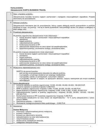 Karta produktu Ubezpieczenie WARTA BUSINESS TRAVEL 1. Opis i charakter produktu: Ubezpieczenie kosztów leczenia nagłych zachorowań i następstw nieszczęśliwych wypadków, Produkt skierowany do pracodawców 2. Adresaci produktu: Ubezpieczenie kierowane jest do pracodawców, którzy często delegują swoich pracowników w podróŜe słuŜbowe w kraju i za granicę, i nie są w stanie przewidzieć rzeczywistego okresu ich pobytu w delegacji w skali całego roku: 3. Przedmiot ubezpieczenia: W podróŜy zagranicznej ubezpieczenie moŜe obejmować: koszty leczenia nagłych zachorowań i nieszczęśliwych wypadków assistance bagaŜ podróŜny odpowiedzialność cywilna kontynuacja leczenia w RP jednorazowe świadczenie na rzecz dzieci lub współmałŜonków opóźnienie podróŜy, anulowanie noclegu, anulowanie biletu W podróŜy krajowej ubezpieczenie moŜe obejmować: koszty leczenia nagłych zachorowań i nieszczęśliwych wypadków assistance bagaŜ podróŜny odpowiedzialność cywilna kontynuacja leczenia w RP jednorazowe świadczenie na rzecz dzieci lub współmałŜonków opóźnienie podróŜy, anulowanie noclegu, anulowanie biletu 4. Wyłączenia odpowiedzialności min: WARTA nie ponosi kosztów: - jeśli istniały przeciwwskazania lekarskie do odbycia podróŜy, - w przypadku umyślnego działania lub raŜącego niedbalstwa, - w przypadku udziału w zamieszkach, rozruchach i bójkach, - w przypadku zdarzeń w związku ze spoŜyciem alkoholu, zaŜyciu narkotyków lub innych środków odurzających 5. Suma ubezpieczenia Leczenie szpitalne w podróŜy zagranicznej: 10.000, 20.000, 30.000, 60.000, 100.000 EUR Leczenie szpitalne w podróŜy krajowej: 5.000 PLN NNW w podróŜy zagranicznej i krajowej: 5.000, 10.000, 20.000, 30.000, 40.000 PLN BagaŜ podróŜny w podróŜy zagranicznej i krajowej: 2.000, 3.000, 5.000, 10.000, 20.000 PLN Odpowiedzialność cywilna w podróŜy zagranicznej i krajowej: 30.000, 50.000, 100.000, 150.000, 200.000 PLN Kontynuacja leczenia w RP w podróŜy zagranicznej i krajowej: 5.000 PLN Jednorazowe świadczenie na rzecz dzieci lub współmałŜonka – 10 % sumy ubezpieczenia z tytułu śmierci (NNW) Opóźnienie podróŜy – 1.500 PLN Anulowanie noclegu/anulowanie biletu podróŜnego – 3.000 PLN 6. Assistance: Zestaw Medyczny informacja i natychmiastowa pomoc medyczna, przewóz medyczny, przewóz po zakończeniu leczenia, zakwaterowanie na czas rekonwalescencji, natychmiastowa wizyta, dostarczenie niezbędnych lekarstw, zastępstwo Ubezpieczonego, 1 transport zwłok Zestaw PodróŜny przekazanie pilnej wiadomości, pomoc administracyjna, pomoc prawna - udział prawnika, przedpłata kaucji, przedpłata funduszy, powrót do miejsca zamieszkania, powrót do miejsca zatrudnienia, odzyskanie i ponowne skierowanie bagaŜu, dosłanie niezbędnych przedmiotów osobistych nadzór medyczny Zestaw Domowy pomoc interwencyjna, pomoc organizacyjna, opieka nad zwierzętami domowymi Concierge organizacja usług 7. Rozszerzenia dodatkowe: wykonywanie pracy o zwiększonym ryzyku, działania wojenne, stan wyjątkowy następstwa chorób przewlekłych 8. Franszyza: franszyza integralna – 100 zł. - bagaŜ podróŜny 9. Składka: Płatna jednorazowo przy zawieraniu umowy ubezpieczenia lub w ratach (2 lub 4 raty) 10. Okres ochrony: 12 miesięcy 11. ZniŜki: 20% za zawarcie umowy ubezpieczenia jednocześnie na podróŜ krajową i zagraniczną w PAKIECIE ROTACYJNYM lub na podróŜ krajową i zagraniczną w PAKIECIE VIP, 12. ZwyŜki: 5% za płatność składki za ubezpieczenie w ratach, 50% za objęcie ubezpieczeniem wykonywania pracy o zwiększonym ryzyku podczas podróŜy zagranicznej lub krajowej, 300% za objęcie ubezpieczeniem ryzyka działań wojennych, stanu wyjątkowego podczas podróŜy zagranicznej, 20% z tytułu przekroczenia liczby osobodni ponad zadeklarowane 13. Korzyści dla klienta prosta forma ubezpieczenia rocznego gwarantująca płatność składki za faktycznie wykorzystany czas ochrony ubezpieczeniowej, dowód ubezpieczenia dla jednej lub grupy osób realizujących ten sam wyjazd słuŜbowy to estetyczna karta WARTA BUSINESS TRAVEL: - karta ROTACYJNA – bezimienną (moŜe być wykorzystywana przez kaŜdego z pracowników) – ochrona uruchamiana jest na czas określany kaŜdorazowo we wniosku podróŜnym, - karta VIP – imienna, której posiadacz objęty jest całoroczną ochroną ubezpieczeniową na wszystkie wyjazdy, bez względu na ich charakter (słuŜbowy czy prywatny) 2