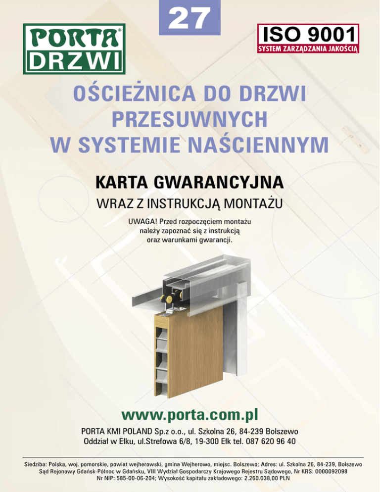 27 OŚCIEŻNICA DO DRZWI PRZESUWNYCH W SYSTEMIE NAŚCIENNYM KARTA GWARANCYJNA WRAZ Z INSTRUKCJĄ MONTAŻU UWAGA! Przed rozpoczęciem montażu należy zapoznać się z instrukcją oraz warunkami gwarancji. www.porta.com.pl PORTA KMI POLAND Sp.z o.o., ul. Szkolna 26, 84-239 Bolszewo Oddział w Ełku, ul.Strefowa 6/8, 19-300 Ełk tel. 087 620 96 40 Siedziba: Polska, woj. pomorskie, powiat wejherowski, gmina Wejherowo, miejsc. Bolszewo; Adres: ul. Szkolna 26, 84-239, Bolszewo Sąd Rejonowy Gdańsk-Północ w Gdańsku, VIII Wydział Gospodarczy Krajowego Rejestru Sądowego, Nr KRS: 0000092098 Nr NIP: 585-00-06-204; Wysokość kapitału zakładowego: 2.260.038,00 PLN WARUNKI GWARANCJI 1. Porta KMI Poland jako Gwarant udziela gwarancji na swoje produkty na terenie RP pod warunkiem, że zostaną one zamontowane zgodnie z zamieszczoną w niniejszej karcie instrukcją montażu oraz będą użytkowane zgodnie z ich przeznaczeniem. W wykonywaniu obowiązków gwarancyjnych pośredniczą na podstawie umów dealerskich przedstawiciele fabryki - Dealerzy Porta KMI Poland 2. Okres gwarancji na wyroby firmy Porta KMI Poland wynosi: – 12 miesięcy na wyroby standardowe, – 24 miesiące na wyroby antywłamaniowe, – 24 miesiące na drzwi zewnętrzne drewniane, – 10 lat na konstrukcję drzwi Enduro, – 10 lat na perforację blachy w drzwiach wewnętrznych metalowych i ościeżnicach metalowych. Okres gwarancji ulega wydłużeniu o następne 12 miesięcy w przypadku montażu zakupionych produktów przez Autoryzowane Grupy Montażowe (posiadające aktualną autoryzację), a fakt ten zostanie potwierdzony przystawieniem odpowiedniej pieczęci w niniejszej karcie. 3. Okres gwarancji liczony jest od daty sprzedaży uwidocznionej na dowodzie zakupu (fakturze). 4. Warunkiem świadczenia usług gwarancyjnych jest przedłożenie przez Kupującego w punkcie sprzedaży karty gwarancyjnej wraz z dowodem zakupu i faktury za montaż (dotyczy wydłużonej gwarancji). Karta gwarancyjna załączona jest do produktu. Obowiązkiem Kupującego jest odebranie karty gwarancyjnej od Sprzedawcy lub Autoryzowanego Montażysty. Wszelkie adnotacje i zapisy w karcie gwarancyjnej mogą być dokonywane wyłącznie przez Gwaranta, upoważniony do tego punkt sprzedaży lub Autoryzowanego Montażystę. Dział reklamacji znajduje się w Porta KMI Poland, 84-239 Bolszewo, ul. Szkolna 26, tel. 58 677 81 00 5. Gwarant zobowiązuje się do rozpatrzenia i załatwienia reklamacji w możliwie najkrótszym terminie. 6. Zwłoka w załatwieniu reklamacji nie zachodzi, gdy oględzin, wymiany lub naprawy nie dokonano z przyczyn leżących po stronie Kupującego. 7. Jeżeli charakter wad nie wymaga ich usuwania w warunkach fabrycznych, naprawę gwarancyjną wykonuje się u Kupującego. 8. W okresie gwarancji (patrz punkt 2) producent zobowiązuje się do nieodpłatnej naprawy wadliwego wyrobu. 9. Oceny charakteru wady i sposobu załatwienia reklamacji dokonuje przedstawiciel Sprzedającego lub Gwaranta. 10. Warunkiem rozpatrzenia reklamacji dotyczącej widocznej usterki jakości jest zgłoszenie jej przed montażem z jednoczesnym odstąpieniem od czynności montażowych. Zainstalowanie akcesoriów traktowane jest jako rozpoczęcie montażu wyrobu. Towar należy zwrócić w oryginalnym opakowaniu. 11. Gwarancja wygasa w przypadku: – – – – – dokonania jakichkolwiek przeróbek w skrzydle lub ościeżnicy, naruszenia konstrukcji wyrobu, zdjęcia tabliczki znamionowej z wyrobów certyfikowanych, zniszczenia lub zagubienia karty gwarancyjnej, dokonania wpisu w karcie gwarancyjnej przez osobę nieupoważnioną. 12. Gwarancją nie są objęte: – mechaniczne uszkodzenia oraz wady zewnętrzne powstałe na skutek nieprzestrzegania prawidłowych zasad w trakcie transportu, składowania i przechowywania wyrobów, – przebarwienia i odkształcenia, uszkodzenia elementów i podzespołów powstałe na skutek pęcznienia materiału, spowodowanych nadmierną wilgotnością powietrza w pomieszczeniach (drzwi powinny być osadzone po wykonaniu tzw. prac mokrych: np. po położeniu tynków, posadzek, w pomieszczeniach suchych i przewiewnych), – przebarwienia, sęki, zawoje włókien, różnice kolorystyczne oraz wyciągnięcia struktury drewna, wynikające z niepowtarzalnej specyfiki naturalnych oklein, – wady powstałe na skutek nieprawidłowego zabezpieczenia wyrobu na czas robót budowlanych (np. zabrudzenia zaprawą, tynkiem lub pianką; czyszczenia gruboziarnistymi środkami czyszczącymi lub agresywnymi środkami chemicznymi), – producent nie odpowiada za uszkodzenia powłoki lakierniczej i laminowanej powstałe w wyniku oklejenia wyrobu taśmami samoprzylepnymi, – wady powstałe na skutek niewłaściwego użytkowania lub niedbałości Kupującego, – montaż wyrobu, – wadliwe działanie wyrobu będące skutkiem zdarzeń losowych, niezależnych od producenta i warunków eksploatacji (powódź, pożar, włamanie itp.), – naturalne zużycia eksploatacyjne wyrobu, – braki ilościowe elementów i akcesoriów widocznych przy odbiorze, – powierzchnie malowane proszkowo w wykonaniu podkładowym, – powierzchnie lakierowane proszkowo w wykonaniu ostatecznym, gdy zostały one przemalowane samodzielnie przez Kupującego. 13. Gwarancja na sprzedany towar nie wyłącza, nie ogranicza ani nie zawiesza uprawnień kupującego wynikających z niezgodności towaru z umową. 2 SYSTEM NAŚCIENNY DRZWI PRZESUWNYCH WYKAZ ELEMENTÓW I AKCESORIÓW AKCESORIA PRZEZNACZENIE ILOŚĆ SZT. Śruba SIM 5x16 +podkładka+nakrętka Montaż słupka odbojowego 4 szt. Kołek szybkiego montażu 8x60+HS4+65 Montaż wieszaka do ściany 4 - 6* szt. Zaślepka 10 Zakrycie otworów w osłonie i stojaku odbojowym 4 szt. Uszczelka szczotkowa Do naklejenia na stojak pionowy i nadproże 2,8 m - 3,2 m Śruba z łbem stożkowym 4x15+podkładka+nakrętka Dokręcenie szyny jezdnej do wieszaka 5 - 7* szt. Blachowkręt 3,9x15 Skręcenie stojaków pionowych i nadproża 8 szt . Kpl. jez