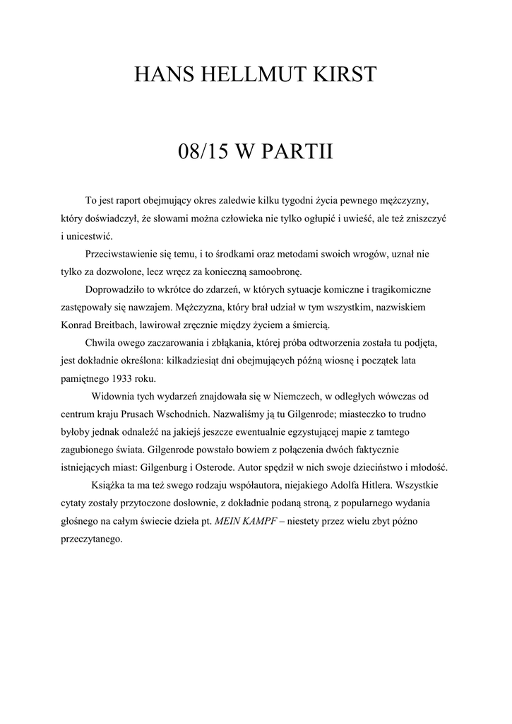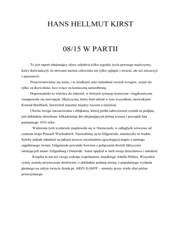 HANS HELLMUT KIRST 08/15 W PARTII To jest raport obejmujący okres zaledwie kilku tygodni życia pewnego mężczyzny, który doświadczył, że słowami można człowieka nie tylko ogłupić i uwieść, ale też zniszczyć i unicestwić. Przeciwstawienie się temu, i to środkami oraz metodami swoich wrogów, uznał nie tylko za dozwolone, lecz wręcz za konieczną samoobronę. Doprowadziło to wkrótce do zdarzeń, w których sytuacje komiczne i tragikomiczne zastępowały się nawzajem. Mężczyzna, który brał udział w tym wszystkim, nazwiskiem Konrad Breitbach, lawirował zręcznie między życiem a śmiercią. Chwila owego zaczarowania i zbłąkania, której próba odtworzenia została tu podjęta, jest dokładnie określona: kilkadziesiąt dni obejmujących późną wiosnę i początek lata pamiętnego 1933 roku. Widownia tych wydarzeń znajdowała się w Niemczech, w odległych wówczas od centrum kraju Prusach Wschodnich. Nazwaliśmy ją tu Gilgenrode; miasteczko to trudno byłoby jednak odnaleźć na jakiejś jeszcze ewentualnie egzystującej mapie z tamtego zagubionego świata. Gilgenrode powstało bowiem z połączenia dwóch faktycznie istniejących miast: Gilgenburg i Osterode. Autor spędził w nich swoje dzieciństwo i młodość. Książka ta ma też swego rodzaju współautora, niejakiego Adolfa Hitlera. Wszystkie cytaty zostały przytoczone dosłownie, z dokładnie podaną stroną, z popularnego wydania głośnego na całym świecie dzieła pt. MEIN KAMPF – niestety przez wielu zbyt późno przeczytanego. – A więc kochani chłopcy – ja wcale nie wymagam, abyście wyłącznie podążali za moimi radami. Chciałbym jednak, żebyście spróbowali zrozumieć moje myślenie. W końcu jestem waszym ojcem. Waszym Ojcem! Tak mówił Richard Breitbach z zachęcającą serdecznością do obydwu swych synów, których zawezwał do siebie. Breitbach był wielce szanowanym obywatelem w wymienionym już Gilgenrode – niedoścignionym mistrzem siodlarskim, właścicielem kamienicy, do tego zdeklarowanym nacjonalistą i chrześcijaninem. Lecz czasy, w których nawet tutaj w niewielkim Gilgenrode mógłby nadal uchodzić wyłącznie za porządnego obywatela i skromnego sługę Bożego, dawno minęły; w każdym razie ostatnio Breitbach nie poruszał się już tak pewnie i ochoczo po okolicy. Jakby coś złego przeczuwał. Niektórzy nawet zaczęli o nim mówić. Po co ten skądinąd przyzwoity człowiek zadziera z nimi, stroi się w takiego kłótnika. I to tylko tak dla siebie, bez konkretnego celu. – Nie osądzajcie mnie źle, moi kochani synowie – mówił dalej podniesionym tonem Richard Breitbach. – Ale to wszystko co zachodzi w tych zarozumiałych facetach, niby nowoniemcach – jest niebywałym kuriozum, gorszącym wybrykiem, czy infantylną zabawką. – Spoglądał teraz na obydwu swych synów, jak ksiądz przemawiający z ambony, próbujący swym kazaniem wzbudzić refleksję wiernych nad głoszoną Ewangelią. – Nasza dzisiejsza sytuacja, moi kochani chłopcy, jest wielką błazenadą. Nawet jeśli niektóre prawdy, głoszone przez tych brunatnych braci, wydają się brzmieć przekonywająco. Ale nie należy im w niczym ufać! – Czy naprawdę w niczym – skoro wiele rzeczy, które głoszą, brzmi przekonywająco? – zapytał wtedy Konrad, młodszy syn Breitbacha. Chwilowo jeszcze ojcowska pewność siebie Richarda Breitbacha pozostawała niezakłócona. – Przyznam – mówił do nich dalej – że coraz trudniej przychodzi mi zrozumieć naszych kochanych współziomków, większość z nich zachowuje się jak dzieci. Ale całe szczęście, że wciąż jeszcze można znaleźć w okolicy prawdziwych idealistów, których łatwo odróżnić od kręcących się wokół coraz częściej łotrzyków i oszustów. – I ty ojcze naprawdę wierzysz w to, że potrafisz ich odróżnić – tu u nas w Gilgenrode? – znów zapytał z nieco drwiącą uporczywością młodszy syn, Konrad, coraz jednak mniej pewnego siebie ojca. – Ja na przykład nie potrafię ich odróżnić – i powiem więcej, czasami to właśnie oni, a więc ci, których nazywasz łotrzykami i oszustami wydają się dla mnie być idealistami. Ojciec Breitbach wyglądał teraz na człowieka, który miewa kłopoty z oddychaniem, zaczął rozluźniać krawat w czarno-biało-czerwone prążki. Słońce tego wiosennego dnia prażyło, jakby była pełnia lata, i wdzierało się całą swoją jaskrawością do tego na ogół ciemnego pokoju, w którym królowały mieszczańskie dębowe meble obite skórą. Nie wiadomo zupełnie, kiedy ci jego „chłopcy” z dzieci stali się dorosłymi mężczyznami. Wysokim i szczupłym – starszy, który miał na imię Johannes; jego twarz była pełna dostojności, gotyckiego piękna, jakby została wyrzeźbiona przez artystę. Niebieskie oczy spoglądały z głębokim rozmarzeniem. Wyglądał na człowieka uduchowionego, którym wciąż opiekowały się muzy, mimo że miał już prawie trzydzieści lat. Zupełnie inaczej za to ukształtowany był jego brat, czyli Konrad, swego rodzaju „manekinek rodzaju męskiego”. Zwracało się na niego uwagę, gdyż był bardzo niski, mierzył zaledwie sto sześćdziesiąt pięć centymetrów. Wyglądał naprawdę mizernie, uchodząc wokół za nie mającego wszystkich klepek. Słowem – karykaturalna postać i niezdara. Nikt zatem nie przypuszczał, że Konrad będzie mógł kiedykolwiek dokonać czegoś szczególnego. I on sam też chyba nie bardzo w to wierzył. Ojciec mawiał o nim często: „Nasz mały Konrad jest z pewnością bardzo kochanym i posłusznym chłopcem, lecz niestety głupim pieskiem”. Richard Breitbach bardzo bowiem kochał psy. Stąd więcej uwagi poświęcał ojciec zawsze widocznemu, nawet gdy ten zapadał się w głębokim fotelu, Johannesowi, czyli swojemu starszemu synowi. On był jego oczkiem w głowie. Równocześnie symbolem jego zasad, jak: honor, wierność – i kto wie jeszcze jaki