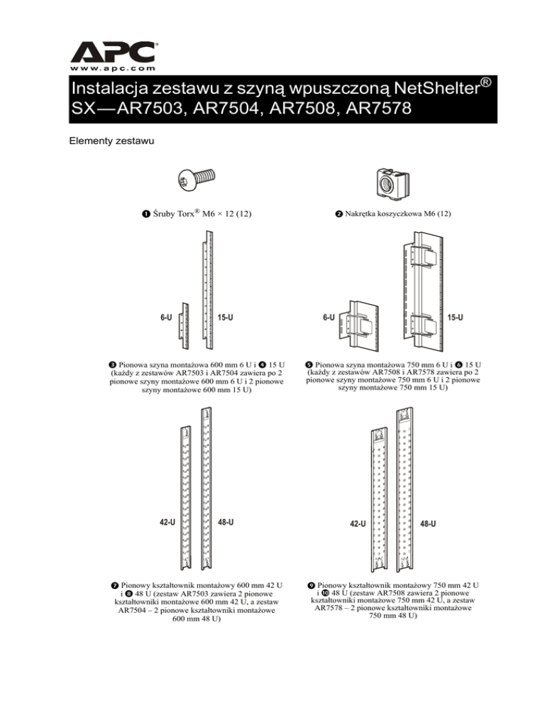 Instalacja zestawu z szyną wpuszczoną NetShelter® SX—AR7503, AR7504, AR7508, AR7578 Elementy zestawu ® Śruby Torx M6 × 12 (12) 6-U 15-U Pionowa szyna montażowa 600 mm 6 U i 15 U (każdy z zestawów AR7503 i AR7504 zawiera po 2 pionowe szyny montażowe 600 mm 6 U i 2 pionowe szyny montażowe 600 mm 15 U) 42-U 48-U Pionowy kształtownik montażowy 600 mm 42 U i 48 U (zestaw AR7503 zawiera 2 pionowe kształtowniki montażowe 600 mm 42 U, a zestaw AR7504 – 2 pionowe kształtowniki montażowe 600 mm 48 U) Nakrętka koszyczkowa M6 (12) 6-U 15-U Pionowa szyna montażowa 750 mm 6 U i 15 U (każdy z zestawów AR7508 i AR7578 zawiera po 2 pionowe szyny montażowe 750 mm 6 U i 2 pionowe szyny montażowe 750 mm 15 U) 42-U 48-U Pionowy kształtownik montażowy 750 mm 42 U i 48 U (zestaw AR7508 zawiera 2 pionowe kształtowniki montażowe 750 mm 42 U, a zestaw AR7578 – 2 pionowe kształtowniki montażowe 750 mm 48 U) Potrzebne narzędzia (dostarczane w zestawie) Narzędzie do nakrętek koszyczkowych Klucz krzyżakowy Torx T30/#2 Zakładanie i wyjmowanie nakrętek koszyczkowych Aby założyć nakrętkę koszyczkową: Ostrzeżenie Warning Nakrętki koszyczkowe należy zakładać poziomo. Nie zakładaj nakrętek koszyczkowych pionowo, tj. tak by boki nakrętki zaczepiły o górną i dolną krawędź kwadratowego otworu. 1. Włóż nakrętkę koszyczkową do kwadratowego otworu, zaczepiając zespół nakrętki za dalszą krawędź otworu. 2. Umieść narzędzie do zakładania nakrętek koszyczkowych (dostarczone w zestawie) po drugiej stronie nakrętki i pociągnij, aby ją zamocować. Aby zdjąć nakrętkę koszyczkową: 1. Wykręć śrubę z nakrętki. 2. Chwyć nakrętkę koszyczkową i ściśnij ją po bokach, aby uwolnić ją z kwadratowego otworu. Uwaga Note 2 Zestawy z szyną wpuszczoną są dostarczane z ilością wkrętów M6 × 12 i nakrętek koszyczkowych M6 wystarczającą dla większości instalacji. Dodatkowe wkręty i nakrętki koszyczkowe można zastosować w celu zapewnienia lepszego mocowania szyn montażowych mających ponad sześć otworów. Zestaw z szyną wpuszczoną — AR7503, AR7504, AR7508, AR7578 Instalacja pionowych kształtowników montażowych i korzystanie z nich Lokalizacja pionowych kształtowników montażowych ns1023a Określ żądaną lokalizację instalacji kształtowników montażowych. Pionowe kołnierze montażowe można zamontować na górze lub dole szafy. Kształtowniki montażowe można przesuwać w stronę przodu lub tyłu szafy, aby dostosować ich położenie do różnych głębokości urządzeń. Instalacja pionowych kształtowników montażowych 1. Umieść pionowy kształtownik montażowy na bocznej obejmie szafy. Upewnij się, że zarówno góra, jak i dół kształtownika są zamocowane albo do górnej i środkowej albo do środkowej i dolnej bocznej obejmy szafy, w zależności od lokalizacji kształtownika montażowego. Uwaga Note Wszystkie pionowe kształtowniki montażowe są mocowane do szafy w taki sam sposób. Zestaw z szyną wpuszczoną — AR7503, AR7504, AR7508, AR7578 ns01029a 2. Powtórz czynności z kroku 1 dla przeciwnej strony szafy. 3 Regulacja położenia kształtowników montażowych na obejmach bocznych Ostrzeżenie Warning Aby uniknąć obrażeń lub uszkodzenia szafy, procedurę tę należy wykonywać tylko wtedy, gdy na kształtownikach nie ma zamontowanych urządzeń. ns1025a ns01024a 1. Posługując się kluczem Torx T30/krzyżakowym o rozmiarze 2, poluzuj śruby Torx w szczelinach kształtowników montażowych, ale nie wykręcaj ich. Poluzuj obydwa wkręty na kształtowniku montażowym stojaka 750 mm. Uwaga Note ns01026a 2. Opuść płaską klamrę i przesuń kształtownik montażowy w żądane położenie. 4 Zestaw z szyną wpuszczoną — AR7503, AR7504, AR7508, AR7578 3. Aby prawidłowo ustawić pionowe kształtowniki montażowe, zapamiętaj symbol (np. trójkąt) widoczny przez jeden z otworów u góry kształtownika i dopilnuj, aby ten sam symbol był widoczny przez odpowiedni otwór u dołu kształtownika. Przez jeden otwór widoczny jest tylko jeden symbol naraz. Uwaga Note Uwaga Note ns01027a W przypadku stojaka montażowego 750 mm z tyłu kształtownika montażowego znajdują się koła 476 mm (18,75 cala), oznaczające położenie urządzeń sieciowych i telekomunikacyjnych. Położenie pionowych kształtowników montażowych można regulować z dokładnością do 6 mm (1/4 cala). Pionowe kształtowniki montażowe umieszczone naprzeciwko siebie muszą być ustawione na tych samych symbolach. Uwaga Note Podczas dokręcania śrub mocujących klamrę do szafy, należy zwrócic uwagą na duży otwór centrujący, znajdujący się pod brzegiem klamry. Ułatwia on wypoziomowanie i odpowiednie ustawienie klamry względem zebów. ns01028a 4. Po umieszczeniu pionowego kształtownika montażowego w odpowiednim położeniu przesuwaj poszczególne śruby w górę, aż zaczep klamry zahaczy się całkowicie o zaczep bocznej obejmy, a następnie dokręć śruby. Zestaw z szyną wpuszczoną — AR7503, AR7504, AR7508, AR7578 5 Instalacja szyn montażowych Konfiguracje pionowych kształtowników montażowych i szyny montażowe Konfiguracje pionowych kształtowników montażowych 600 mm. Pionowe szyny montażowe 6 U i 15 U wykorzystują różne otwory w kształtownikach montażowych 600 mm w zależności od tego, czy kształtowniki są montowane w górnej, czy w dolnej połowie szafy. W przypadku montażu TOP GÓRNY w górnej połowie należy użyć otworów zewnętrznych, a w dolnej połowie – otworów środkowych. ns1058a BOTTOM DOLNY Konfiguracje pionowych kształtowników montażowych 750 mm. 6 DOLNY BOTTOM Zestaw z szyną wpuszczoną — AR7503, AR7504, AR7508, AR7578 ns1057a Pionowe szyny montażowe 6 U i 15 U wykorzystują różne otwory w kształtownikach montażowych 750 GÓRNY TOP mm w zależności od tego, czy kształtowniki są montowane w górnej czy w dolnej połowie szafy. Dla montazu w górnej polowie nalez