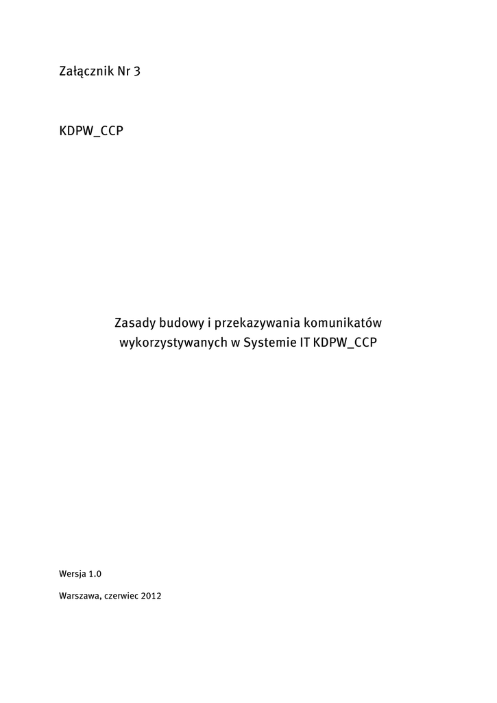 Załącznik Nr 3 KDPW_CCP Zasady budowy i przekazywania komunikatów wykorzystywanych w Systemie IT KDPW_CCP Wersja 1.0 Warszawa, czerwiec 2012 Spis treści Wstęp ............................................................................................................................... 3 Budowa komunikatów XML ................................................................................................. 3 Przestrzenie nazw (namespaces) ..................................................................................... 3 Nagłówki........................................................................................................................ 4 Zestaw znaków ............................................................................................................... 4 Schematy przepływów komunikatów ................................................................................... 5 Oznaczenia przyjęte przy prezentacji schematów przepływów ........................................... 5 Identyfikacja KDPW jako odbiorcy i nadawcy komunikatów ................................................ 5 Powiązania komunikatów przesyłanych pomiędzy uczestnikami a KDPW ............................ 6 Ogólny przepływ komunikatów pomiędzy Uczestnikami a KDPW_CCP w zakresie rynku OTC .... 6 Opis zawartości komunikatów............................................................................................. 8 otcd.rqi.001.01 – instrukcja obsługi rynku OTC ................................................................ 8 otcd.rsi.001.01 – status realizacji instrukcji obsługi rynku OTC ......................................... 9 otcd.ntf.001.01 – powiadomienie dotyczące obsługi rynku OTC ....................................... 11 Strona 2 z 11 Wstęp Niniejszy dokument opisuje zasady budowy komunikatów XML w systemie IT KDPW_CCP dla obsługi transakcji OTC, opis ogólnej budowy oraz sekwencje przepływów komunikatów. Szczegółowa zawartość poszczególnych komunikatów w relacji do poszczególnych procesów biznesowych została przedstawiona w odrębnej dokumentacji (Załącznik nr 3). Budowa komunikatów XML Nazewnictwo komunikatów KDPW opiera się na zaleceniach normy ISO20022: Nazwa komunikatu posiada następującą postać: kdpw.otc.aaa.bb gdzie: aaa — kod określający wariant funkcji komunikatu (numeryczny); bb — wersja (w postaci numerycznej). Wersje testowe schematów komunikatów są w KDPW oznaczane dodatkowym członem w postaci: ‘.Draftn,’ gdzie n oznacza kolejny numer wersji testowej. To dodatkowe oznaczenie nie jest częścią normy ISO20022. Przykład: Druga wersja testowa komunikatu wersji 3 opisującego powiadomienie Uczestnika w ramach obsługi rynku OTC może mieć postać: kdpw.otc.003.03.Draft2. Przestrzenie nazw (namespaces) W komunikatach KDPW wykorzystywane są cztery przestrzenie nazw: Domyślna przestrzeń nazw (default namespace) Jej nazwa składa się z części stałej w postaci: urn:std:kdpw: oraz części zmiennej zbudowanej według schematu: xsd:IdentyfikatorKomunikatu (np.: urn:std:kdpw:xsd: kdpw.otc.003.03.Draft2) Strona 3 z 11 xs: standardowa przestrzeń nazw dla W3C XML schema xsi: standardowa przestrzeń nazw dla W3C XML schema instance docelowa przestrzeń nazw (target namespace) — taka sama jak przestrzeń domyślna Nagłówki Pierwszy element każdego komunikatu posiada zawsze nazwę: <KDPWDocument>. Element ten zawiera następujące obowiązkowe atrybuty: Sndr (sender) — nadawca komunikatu w postaci kodu uczestnika KDPW_CCP; Rcvr (receiver) — odbiorca komunikatu w postaci kodu uczestnika KDPW_CCP. Drugi element (bezpośredni potomek elementu głównego) posiada zawsze nazwę tożsamą z nazwą komunikatu. Przykład: <KDPWDocument Sndr=”09AA” Rcvr=”0010” xmlns="urn:std:kdpw:xsd:sese.001.001.01" xmlns:xsi="http://www.w3.org/2001/XMLSchema-instance" <otcd.rqi.001.01> <GnlInf> … </GnlInf> … </otcd.rqi.001.01> </KDPWDocument> Zestaw znaków Komunikaty KDPW wykorzystują zestaw kodowania znaków UTF-8. Strona 4 z 11 Schematy przepływów komunikatów Oznaczenia przyjęte przy prezentacji schematów przepływów W zaprezentowanych poniżej sekwencjach przepływów wykorzystano konwencję budowania schematów sekwencji (sequence diagram) pochodzącą z języka UML 2.0. W szczególności zastosowano następujące oznaczenia: Nazwa komunikatu - Komunikat - Instytucja współpracująca z KDPW_CCP (np. uczestnik, rynek) Uczestnik - KDPW_CCP Schematy zawierają jedynie te komunikaty, które zawierają bezpośrednie odniesienie do opisywanego zagadnienia. Identyfikacja KDPW jako odbiorcy i nadawcy komunikatów System IT KDPW_CCP posiada własny, dedykowany kod instytucji – ‘0010’. Komunikaty przesyłane do systemu IT KDPW_CCP muszą zawierać w polu Rcvr odpowiedni kod odbiorcy komunikatu. Analogicznie komunikaty wychodzące z KDPW_CCP będą miały pole Sndr wypełnione kodem ‘0010’. Strona 5 z 11 Powiązania komunikatów przesyłanych pomiędzy uczestnikami a KDPW_CCP W procesie komunikacji pomiędzy Uczestnikami a KDPW_CCP niezbędny jest mechanizm odwoływania się do poprzednio przesyłanych komunikatów. Każda instrukcja przesyłana przez Uczestnika do KDPW_CCP posiada identyfikator nadany przez nadawcę umieszczany w polu SndrMsgRef. KDPW_CCP nie kontroluje unikalności tak wprowadzonego identyfikatora. Poniżej opisano najczęściej stosowane oznaczenia służące do identyfikacji komunikatów i instrukcji: SndrMsgRef (sender message reference) — identyfikator komunikatu wyznaczony przez nadawcę; jest to obowiązkowe pole każdego komunikatu. RltdRef (related reference) — oznacza odniesienie do poprzednio otrzymanej instrukcji/komunikatu. Pole stosowane w przypadku odwoływania się do instrukcji przesłanej w kierunku przeciwnym niż aktualna instrukcja. Przykład: komunikat statusu instrukcji rozliczeniowej przesyłany przez KDPW do uczestnika zawiera w polu RltdRef identyfika