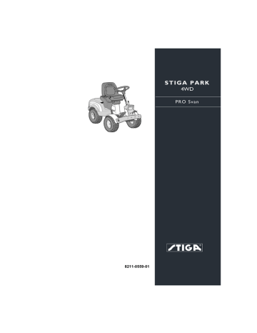 STIGA PARK 4WD PRO Svan 8211-0559-01 2 1 D E G A N O F B C 4 3 R P Q 6 5 S T U V 2 H I J K L M 8 7 W Max 10 9 10 Ampere 0 1 11 12 X Y Z 3 13 14 15 16 B A 18 17 F G H 4 19 20 21 22 23 24 5 PL POLSKI 1 INFORMACJE OGÓLNE Ten symbol oznacza OSTRZEŻENIE. Niedokładne stosowanie się do instrukcji może prowadzić do poważnych obrażeń ciała i/lub uszkodzenia mienia. Przed uruchomieniem maszyny należy dokładnie zapoznać się z niniejszą instrukcją obsługi oraz załączoną broszurą „INSTRUKCJA BEZPIECZEŃSTWA”. 1.1 Symbole Na maszynie znajdują się następujące symbole. Ich zadaniem jest przypominanie o zachowaniu ostrożności i uwagi podczas jej używania i konserwacji. Znaczenie symboli: Ostrzeżenie! Przed rozpoczęciem użytkowania maszyny należy zapoznać się z instrukcją obsługi i instrukcją bezpieczeństwa. Ostrzeżenie! Uważać na wyrzucane przedmioty. Przy maszynie powinien znajdować się tylko operator. Ostrzeżenie! Zawsze nosić ochraniacze słuchu. Ostrzeżenie! Maszyna nie jest przeznaczona do poruszania się po drogach publicznych. Ostrzeżenie! Nie wolno prowadzić maszyny z oryginalnym wyposażeniem dodatkowym po pochyłościach o stopniu nachylenia przekraczającym 10ş. Ostrzeżenie! Istnieje ryzyko obrażeń kończyn. Trzymać dłonie i stopy z dala od przegubu sterowniczego. Ostrzeżenie! Istnieje ryzyko oparzeń. Nie dotykać tłumika/katalizatora. 1.2 Oznaczenia 1.2.1 Rysunki Rysunki w niniejszej instrukcji zostały kolejno ponumerowane: 1, 2, 3, itp. Komponenty przedstawione na rysunkach zostały oznaczone literami A, B, C, itp. Oznaczenie komponentu C na rysunku 2 to: „2:C”. 1.2.2 Sekcje Sekcje w niniejszej instrukcji zostały ponumerowane zgodnie z następującym przykładem: 36 „1.3.1 Ogólna kontrola bezpieczeństwa” to podpunkt w sekcji „1.3 Kontrole bezpieczeństwa” i znajduje się właśnie w tej sekcji. Odwołując się do sekcji zwykle podawany jest tylko jej numer. Przykład: „Patrz 1.3.1”. 2 OPIS 2.1 Napęd 2.2 Kierowanie 2.3 System bezpieczeństwa Maszyna posiada napęd na 4 koła. Moc z silnika do kół napędowych przekazywana jest hydraulicznie. Silnik napędza pompę olejową, która pompuje olej do napędu tylnej i przedniej osi. Przednia i tylna oś połączone są szeregowo, w wyniku czego przednie i tylne koła obracają się z taką samą prędkością. Aby ułatwić skręcanie, obie osie wyposażono w dyferencjał. Montowane z przodu wyposażenie dodatkowe napędzane jest paskami napędowymi. Maszyna jest przegubowa. Oznacza to, że podwozie zostało podzielone na odcinek przedni i tylny, które mogą skręcać się względem siebie. Dzięki sterowaniu przegubowemu maszyna może pracować przy drzewach i innych przedmiotach z bardzo małym promieniem skrętu. Maszyna została wyposażona w elektryczny system bezpieczeństwa. System ten przerywa określone czynności, które mogą stwarzać zagrożenie w postaci nieprawidłowych manewrów. Na przykład nie można uruchomić silnika, jeśli wciśnięty jest pedał sprzęgła-hamulca postojowego. Działanie systemu bezpieczeństwa należy sprawdzać przed każdym użyciem maszyny. 2.4 Sterowanie 2.4.1 Hydrauliczny podnośnik elementów wyposażenia dodatkowego (2:M) Hydrauliczny podnośnik elementów wyposażenia dodatkowego działa dopiero po uruchomieniu silnika, a steruje się nim za pomocą przełącznika (2:M). Przełącznik posiada następujące trzy położenia: • Położenie tuż nad podłożem. Nacisnąć przednią część przełącznika. Przełącznik pozostaje w pozycji wciśniętej, a element wyposażenia dodatkowego zostanie opuszczony do pozycji tuż nad podłożem. Położenie tuż nad podłożem oznacza, że element wyposażenia dodatkowego przez cały PL POLSKI czas równomiernie naciska na podłoże i dopasowuje się do jego ukształtowania. Położenie tuż nad podłożem należy stosować w czasie pracy. • Podnoszenie. Naciskać tylną część przełącznika, aż element wyposażenia dodatkowego znajdzie się w najwyższym położeniu (pozycja transportowa). Po zwolnieniu przełącznika, wysokość zostanie zablokowana w pozycji transportowej. • Blokowanie w pozycji transportowej. Po zakończeniu podnoszenia przełącznik powróci w położenie neutralne. Element wyposażenia dodatkowego jest zablokowany w pozycji transportowej. UWAGA! Aby podłączyć wał poboru mocy należy ustawić hydrauliczny podnośnik elementów wyposażenia dodatkowego w położeniu tuż nad podłożem. UWAGA! Nie można podłączyć wału poboru mocy, jeśli załączono hamulec postojowy. 2.4.2 Sprzęgło-hamulec postojowy (1:B) Nigdy nie naciskać tego pedału w czasie jazdy. Grozi to przegrzaniem pędni. Pedał (1:B) posiada następujące trzy położenia: • Zwolniony. Sprzęgło nie jest załączone. Hamulec postojowy nie jest załączony. • Wciśnięty do połowy. Napęd do przodu wyłączony. Hamulec postojowy nie jest załączony. • Wciśnięty. Napęd do przodu wyłączony. Hamulec postojowy całkowicie załączony, ale nie zablokowany. 2.4.3 Blokada, hamulec postojowy (1:A) Blokada unieruchamia pedał sprzęgłahamulca w pozycji wciśniętej. Funkcja ta służy do blokowania maszyny na pochyłościach, podczas transportu, itp., kiedy silnik jest wyłączony. W czasie pracy hamulec postojowy powinien być zawsze zwolniony. Blokowanie: 1. Wcisnąć pedał (1:B) do oporu. 2. Przestawić blokadę (1:A) w prawo. 3. Zwolnić pedał (1:B). 4. Zwolnić blokadę (1:A). Odblokowanie: Nacisnąć i zwolnić pedał (1:B). 2.4.4 Jazda-hamulec główny (1:F) Pedał (1:F) określa przełożenia między silnikiem i kołami napędowymi (= prędkość). Po zwolnieniu pedału załącza się hamulec główny. 1. Nacisnąć pedał do przodu – maszyna porusza się do przodu. 2. Brak nacisku na pedał – maszyna stoi w miejscu. 3. Nacisnąć pedał do tyłu – maszyna cofa. 4. Zmniejszyć nacisk na pedał – maszyna hamuje. 2.4.5 Kierownica (1:D) Wysokość kie