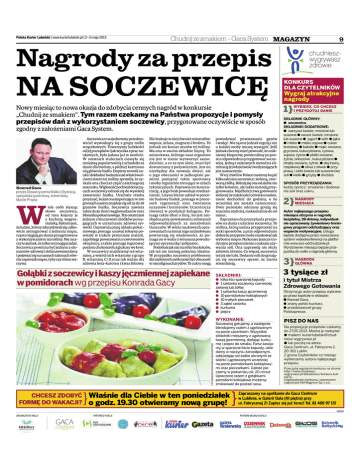 Polska Kurier Lubelski | www.kurierlubelski.pl | 2–3 maja 2013 Chudnij ze smakiem – Gaca System MAGAZYN 9 KONKURS DLA CZYTELNIKÓW Wygraj atrakcyjne nagrody Nowy miesiąc to nowa okazja do zdobycia cennych nagród w konkursie „Chudnij ze smakiem”. Tym razem czekamy na Państwa propozycje i pomysły przepisów dań z wykorzystaniem soczewicy, przygotowane oczywiście w sposób zgodny z założeniami Gaca System. Konrad Gaca prezes Stowarzyszenia Walki z Otyłością, specjalista żywieniowy, trener klasy Master Propta iele osób słysząc słowo soczewica, od razu kojarzy je z kuchnią wegetariańską. Faktem jest, że ludzie, którzy zdecydowali się całkowicie zrezygnować z jedzenia mięsa, często sięgają po dania przygotowane z wykorzystaniem tej rośliny. Nie znaczy to jednak, że tylko oni mogą je jadać. Soczewica powinna być jednym z elementów zdrowej i zbilansowanej diety i pojawiać się na naszych talerzach równie często jak mięso, ryby czy różne warzywa. Soczewica to najzdrowszy przedstawiciel wywodzący się z grupy roślin strączkowych. Towarzyszy ludzkości od jej początków i jak wynika z prac naukowych, była jadana już w neolicie. W ostatnich stuleciach cieszyła się mniejszą popularnością i uchodziła za danie dla biedoty, a później karmiono nią głównie bydło. Dopiero rozwój nauki i dokładne badania nad właściwościami ziaren tej rośliny sprawiły, że zyskała ona chociaż część należnego jej szacunku. Większość pochwał dotyczących soczewicy odnosi się do wysokiej zawartości białka. Uczciwie trzeba przyznać, że jest ona imponująca: w 100 gramach nasion znajduje się od 25 do 28 gramów białka. Soczewica zawiera także duże ilości węglowodanów oraz błonnika pokarmowego. Ten ostatni jest jednym z kluczowym środków pomagających w utrzymaniu zdrowej sylwetki. Usprawnia pracę układu pokarmowego, pomaga usuwać toksyny powstałe w trakcie przemiany materii, zapobiega powstawaniu nowotworów okrężnicy, a także pomaga regulować poziom cholesterolu i glukozy we krwi. W soczewicy znajdziemy też witaminy, a wśród nich witaminy z grupy B, witaminę C i E oraz tak ważne dla zdrowia beta-karoten i kwas foliowy. Nie brakuje w niej również minerałów: wapnia, żelaza, magnezu i fosforu. To jednak nie koniec atutów tej rośliny. Ma ona w swoim składzie lizynę. To aminokwas, którego nasz organizm nie jest w stanie wytworzyć samodzielnie, a co za tym idzie, musi być dostarczany z pożywieniem. Jest on niezbędny dla rozwoju dzieci, ale o jego obecności w jadłospisie powinni pamiętać także sportowcy i osoby regularnie trenujące w celach rekreacyjnych. Poprawia on koncentrację, a jego brak powoduje rozdrażnienie. Lizyna bierze udział w procesie budowy białek, pomaga w procesach regeneracji oraz tworzenia enzymów i hormonów. Uczestniczy również w produkcji kolagenu. Pomaga także dbać o linię, bo jest niezbędna przy powstawaniu substancji odpowiedzialnych za metabolizm tłuszczów. W wielu naukowych opracowaniach na temat tego aminokwasu powtarzają się wiadomości, że pomaga on w walce z wirusami powodującymi opryszczkę i półpasiec. Podobnie jak nie ma róży bez kolców, tak też nie istnieją pokarmy idealne. W przypadku soczewicy problemem dla niektórych osób może być obecność w niej oligosacharydów. Te cukry mogą powodować powstawanie gazów i wzdęć. Nie są one jednak regułą i nie u każdej osoby muszą wystąpić. Jeśli jednak chcemy mieć pewność, że unikniemy kłopotów, powinniśmy po prostu odpowiednio przygotować soczewicę. Jedną z zalecanych metod na eliminację jej właściwości wzdymających jest namoczenie. W tej chwili w Polsce możemy kupić kilka odmian soczewicy: zieloną, czerwoną i żółtą. Różnią się one od siebie nie tylko kolorem, ale także metodą przygotowania. Najdłużej trwa gotowanie zielonej (w zależności od wieku nasion, może dochodzić do godziny, o ile wcześniej nie została namoczona). Dwie pozostałe odmiany gotują się znacznie szybciej, maksymalnie do 20 minut. Zapraszam do przysyłania przepisów na dania z użyciem soczewicy. To roślina, którą można przygotować na setki sposobów, a przy odpowiednim doborze przypraw może smakować jak wyborne mięso. Na koniec jeszcze tradycyjne przypomnienie o zakazie używania soli. Ona naprawdę nie służy zdrowiu i formie. Co więcej, soczewica też jej nie lubi. Dodanie soli do gotującej się soczewicy sprawi, że ziarna stwardnieją. Gołąbki z soczewicy i kaszy jęczmiennej zapiekane w pomidorach wg przepisu Konrada Gacy SKŁADNIKI: a kilka liści sparzonej kapusty a 1 szklanka soczewicy czerwonej, zielonej lub żółtej a 1 szklanka kaszy jęczmiennej a 10 pomidorków koktajlowych a 10 małych pieczarek a 3 ząbki czosnku a kurkuma a pieprz FOT. AGNIESZKA KOZŁOWSKA/GACA CENTRUM WYKONANIE: CHCESZ ZDOBYĆ FORMĘ DO WAKACJI? } Soczewicę gotujemy, a następnie blendujemy razem z ugotowanym na parze czosnkiem. Wszystkie składniki mieszamy z ugotowaną kaszą jęczmienną, dodając kurkumę i pieprz do smaku. Farsz zawijamy w sparzone liście kapusty, układamy w naczyniu żaroodpornym, oddzielając od siebie obranymi ze skórki i ugotowanymi wcześniej na parze pomidorkami koktajlowymi oraz pieczarkami. Całość pieczemy w piekarniku ok. 20 minut. Upieczone razem z gołąbkami pomidorki koktajlowe możemy zmiksować do postaci sosu. Właśnie dla Ciebie w ten poniedziałek o godz. 19.30 otwieramy nową grupę! } 1} WYBIERZ, CO CHCESZ I PRZYGOTUJ DANIE SKŁADNIK GŁÓWNY: a soczewica SKŁADNIKI DODATKOWE: a warzywa świeże, mrożone lub suszone a owoce świeże, mrożone lub suszone a jogurt a kefir a jajka a mleko a mleko sojowe a cukier brzozowy a bakalie a mąki: owsiana, gryczana, kukurydziana, ryżowa, sojowa, żytnia a płatki owsiane, żytnie, orkiszowe , kukurydziane a otręby owsiane, żytnie a olej lniany, rzepakowy a oliwa z oliwek a przyprawy i zioła ś
