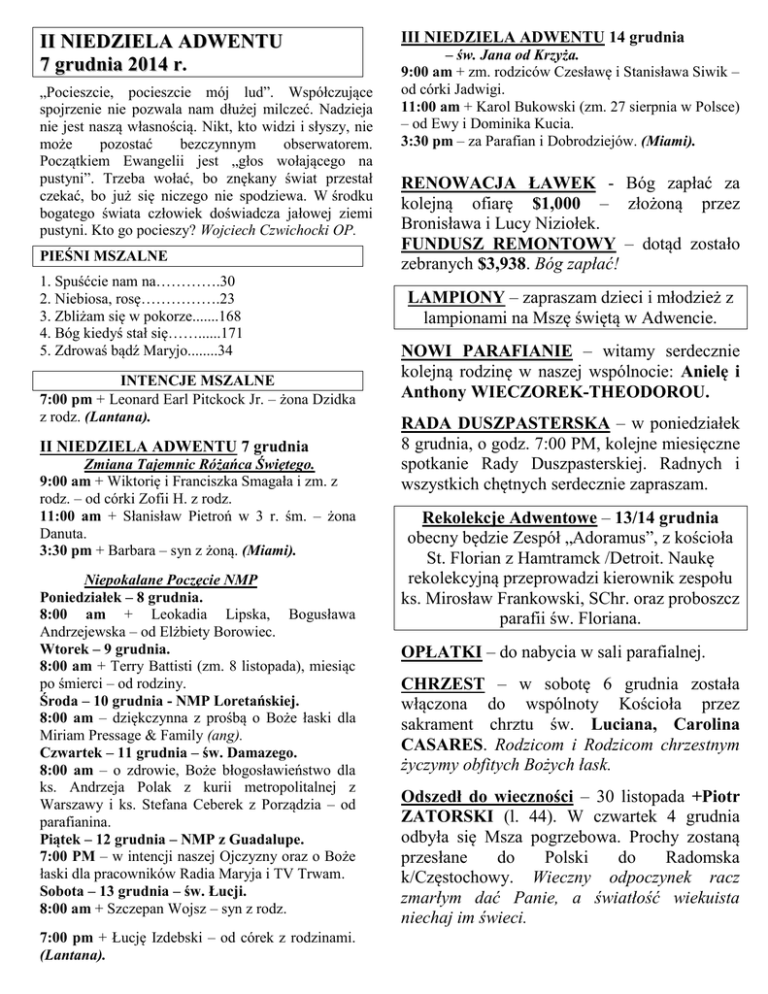 II NIEDZIELA ADWENTU 7 grudnia 2014 r. „Pocieszcie, pocieszcie mój lud”. Współczujące spojrzenie nie pozwala nam dłużej milczeć. Nadzieja nie jest naszą własnością. Nikt, kto widzi i słyszy, nie może pozostać bezczynnym obserwatorem. Początkiem Ewangelii jest „głos wołającego na pustyni”. Trzeba wołać, bo znękany świat przestał czekać, bo już się niczego nie spodziewa. W środku bogatego świata człowiek doświadcza jałowej ziemi pustyni. Kto go pocieszy? Wojciech Czwichocki OP. PIEŚNI MSZALNE 1. Spuśćcie nam na………….30 2. Niebiosa, rosę…………….23 3. Zbliżam się w pokorze.......168 4. Bóg kiedyś stał się……......171 5. Zdrowaś bądź Maryjo........34 INTENCJE MSZALNE 7:00 pm + Leonard Earl Pitckock Jr. – żona Dzidka z rodz. (Lantana). II NIEDZIELA ADWENTU 7 grudnia Zmiana Tajemnic Różańca Świętego. 9:00 am + Wiktorię i Franciszka Smagała i zm. z rodz. – od córki Zofii H. z rodz. 11:00 am + Słanisław Pietroń w 3 r. śm. – żona Danuta. 3:30 pm + Barbara – syn z żoną. (Miami). Niepokalane Poczęcie NMP Poniedziałek – 8 grudnia. 8:00 am + Leokadia Lipska, Bogusława Andrzejewska – od Elżbiety Borowiec. Wtorek – 9 grudnia. 8:00 am + Terry Battisti (zm. 8 listopada), miesiąc po śmierci – od rodziny. Środa – 10 grudnia - NMP Loretańskiej. 8:00 am – dziękczynna z prośbą o Boże łaski dla Miriam Pressage & Family (ang). Czwartek – 11 grudnia – św. Damazego. 8:00 am – o zdrowie, Boże błogosławieństwo dla ks. Andrzeja Polak z kurii metropolitalnej z Warszawy i ks. Stefana Ceberek z Porządzia – od parafianina. Piątek – 12 grudnia – NMP z Guadalupe. 7:00 PM – w intencji naszej Ojczyzny oraz o Boże łaski dla pracowników Radia Maryja i TV Trwam. Sobota – 13 grudnia – św. Łucji. 8:00 am + Szczepan Wojsz – syn z rodz. 7:00 pm + Łucję Izdebski – od córek z rodzinami. (Lantana). III NIEDZIELA ADWENTU 14 grudnia – św. Jana od Krzyża. 9:00 am + zm. rodziców Czesławę i Stanisława Siwik – od córki Jadwigi. 11:00 am + Karol Bukowski (zm. 27 sierpnia w Polsce) – od Ewy i Dominika Kucia. 3:30 pm – za Parafian i Dobrodziejów. (Miami). RENOWACJA ŁAWEK - Bóg zapłać za kolejną ofiarę $1,000 – złożoną przez Bronisława i Lucy Niziołek. FUNDUSZ REMONTOWY – dotąd zostało zebranych $3,938. Bóg zapłać! LAMPIONY – zapraszam dzieci i młodzież z lampionami na Mszę świętą w Adwencie. NOWI PARAFIANIE – witamy serdecznie kolejną rodzinę w naszej wspólnocie: Anielę i Anthony WIECZOREK-THEODOROU. RADA DUSZPASTERSKA – w poniedziałek 8 grudnia, o godz. 7:00 PM, kolejne miesięczne spotkanie Rady Duszpasterskiej. Radnych i wszystkich chętnych serdecznie zapraszam. Rekolekcje Adwentowe – 13/14 grudnia obecny będzie Zespół „Adoramus”, z kościoła St. Florian z Hamtramck /Detroit. Naukę rekolekcyjną przeprowadzi kierownik zespołu ks. Mirosław Frankowski, SChr. oraz proboszcz parafii św. Floriana. OPŁATKI – do nabycia w sali parafialnej. CHRZEST – w sobotę 6 grudnia została włączona do wspólnoty Kościoła przez sakrament chrztu św. Luciana, Carolina CASARES. Rodzicom i Rodzicom chrzestnym życzymy obfitych Bożych łask. Odszedł do wieczności – 30 listopada +Piotr ZATORSKI (l. 44). W czwartek 4 grudnia odbyła się Msza pogrzebowa. Prochy zostaną przesłane do Polski do Radomska k/Częstochowy. Wieczny odpoczynek racz zmarłym dać Panie, a światłość wiekuista niechaj im świeci. ZMIANA ADRESÓW – w tym tygodniu zostało wysłanych 686 listów świątecznych (2011-727; 2012-700; 2013-703). Serdecznie dziękuję za pomoc w przygotowaniu wysyłki Teresie Kołoczek, Barbarze Słabczyńskiej i Zofii Czaczkowskiej. Jeśli ktoś nie otrzymał takiego listu, to znaczy, że Misja nie posiada aktualnego adresu. Osoby, czy rodziny, które zmieniły adres, proszone są o przekazanie adresu do biura Misji. Dziękuję. KOPERTY NA OFIARY – są wyłożone w przedsionku kościoła na niedzielne ofiary na przyszły 2015 rok. SPRZEDAŻ ŚWIĄTECZNA – będzie miała miejsce w IV niedzielę Adwentu - 21 grudnia. Zamówienia można zgłaszać do państwa Otfinowskich tel: (954) 442-5434. Kawiarenka - w ostatnim tygodniu posługiwali: Jadwiga Charkiewicz i Dorota Vorbrodt. Dochód wyniósł $211. * Serdeczne Bóg zapłać za zaangażowanie w życie naszej Wspólnoty! OGŁOSZENIA POLONIJNE Klub ,,Sobieski" w Greenacres (Lake Worth) zaprasza 14 grudnia o godz. 4-tej PM na ''Wieczór Wigilijny''. W programie Jasełka pod tytułem ''Bóg się rodzi'', opłatek oraz kolacja wigilijna. Bilety $20 od osoby dorosłej, $7 dzieci od 7 do 14 lat, dzieci do lat 7 za darmo. Ilość miejsc ograniczona. Rez. Tel: Krystyny (561)601-9845 Klub „POLONEZ” – zaprasza 31 grudnia o godz. 7:30 PM na Bal Sylwestrowy. Cena $100 goście, $90 członkowie. Grać będzie „Roxana Band” i”DJ PIT”. Tel: Jolanta (754) 551-0260 Oferta: kobieta szuka pokoju do wynajęcia. Tel: (773) 507-8020 (2x) Oferta: kobieta poszukuje pracy, opieka nad starszą osobą lub dziećmi, posiadam dyplom USA asystent pielęgniarki. Tel: (954) 404-3603 Antonina (1x) Oferta: mężczyzna w sile wieku szuka pracy w pracach kontraktorskich. Tel: (954) 708-3164 (1x) Oferta: pokój z łazienką do wynajęcia, sauna, basen, w Ft. Lauderdale. Tel: (954) 440-3254 (5x) Oferta: szukam mieszkania 2-sypialniowego na 2 miesiące: styczeń, luty. Tel: (954) 731-6711 (2x) Oferta: Nieruchomości, kupno-sprzedaż, domy, mieszkania (Foreclose-bankowa wyprzedaż lub Short Sale – obniżona cena), biznesy, inwestycje, rental, wynajem, komercjalne budynki, hotele. United Realty, Realtor; Roman Tryndus Tel: (754) 235-0378; www.houseroman.net. (4x) Oferta: do wynajęcia 1 sypialniowy Apartament w West Palm Beach. Tel: (561) 420-4796 (3x) Oferta: potrzebna kobieta do opieki nad starszą osobą w weekendy, łącznie 8 godzin, $15 na/h, wymagany angielski i samochód. Tel: (954) 326-4887 