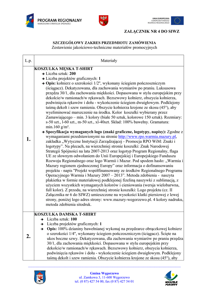 ZAŁĄCZNIK NR 4 DO SIWZ SZCZEGÓŁOWY ZAKRES PRZEDMIOTU ZAMÓWIENIA Zestawienie jakościowo-techniczne materiałów promocyjnych L.p. 1. 2. Materiały KOSZULKA MĘSKA T-SHIRT Liczba sztuk: 200 Liczba projektów graficznych: 1 Opis: kołnierz o szerokości 1/2'', wykonany ściegiem pończoszniczym (ściągacz). Dekatyzowana, dla zachowania wymiarów po praniu. Luksusowa przędza 30/1, dla zachowania miękkości. Dopasowana w stylu europejskim przy dekolcie/w ramionach/w rękawach. Bezszwowy kołnierz, obszycia kołnierza, podwinięcia rękawów i dołu - wykończenie ściegiem dwuigłowym. Podklejony taśmą dekolt i szew ramienia. Obszycie kołnierza krojone ze skosu (45°), aby wyeliminować marszczenie na środku. Kolor koszulki wybierany przez Zamawiającego – min. 3 kolory (białe 50 sztuk, kolorowe 150 sztuk). Rozmiary: s-50 szt., l-60 szt., m-50 szt., xl-40szt. Skład: 100% bawełny. Gramatura: min.160 g/m². Specyfikacja wymaganych logo (znaki graficzne, logotypy, napisy): Zgodne z wymaganiami przedstawionymi na stronie http://www.rpo.warmia.mazury.pl, zakładka „Wytyczne Instytucji Zarządzającej - Promocja RPO WiM: Znaki i logotypy”. Na plecach, na wierzchniej stronie koszulki: Znak Narodowej Strategii Spójności na lata 2007-2013 oraz logotyp Program Regionalny, flaga UE ze słownym odwołaniem do Unii Europejskiej i Europejskiego Funduszu Rozwoju Regionalnego oraz logo Warmii i Mazur. Pod spodem hasło: „Warmia i Mazury regionem zjednoczonej Europy” oraz informacja o dofinansowaniu projektu - napis "Projekt współfinansowany ze środków Regionalnego Programu Operacyjnego Warmia i Mazury 2007 – 2013”. Metoda zdobienia - naszyta plakietka w formie materiałowej podklejonej fizeliną naszywki z sublimacją, z użyciem wszystkich wymaganych kolorów i cieniowania (wersja wielobarwna, full kolor). Z przodu, na wierzchniej stronie koszulki: Logo projektu (cz. II Załącznika nr 6 do SIWZ) umieszczone na wysokości klatki piersiowej z lewej strony, poniżej logo adres strony: www.mazury-wegorzewo.pl. 4 kolory nadruku, metoda zdobienia sitodruk. KOSZULKA DAMSKA T-SHIRT Liczba sztuk: 100 Liczba projektów graficznych: 1 Opis: 100% dzianiny bawełnianej wykonaj na przędzarce obrączkowej kołnierz o szerokości 1/4'', wykonany ściegiem pończoszniczym (ściągacz). Ścięte na ukos boczne szwy. Dekatyzowana, dla zachowania wymiarów po praniu przędza 30/1, dla zachowania miękkości. Dopasowana w stylu europejskim przy dekolcie/w ramionach/w rękawach. Bezszwowy kołnierz, obszycia kołnierza, podwinięcia rękawów i dołu - wykończenie ściegiem dwuigłowym. Podklejony taśmą dekolt i szew ramienia. Obszycie kołnierza krojone ze skosu (45°), aby _______________________________________________________________________________________ Gmina Węgorzewo ul. Zamkowa 3, 11-600 Węgorzewo tel. (0 87) 427 54 00, fax (0 87) 427 54 01 3. wyeliminować marszczenie na środku. Kolor koszulki wybierany przez Zamawiającego – min. 3 kolory (białe 30 sztuk, kolorowe 70 sztuk). Rozmiary: xs-15 szt., s-20 szt., m-30 szt., l-20szt., xl-15 szt. Skład: 100% bawełny. Gramatura: min.160 g/m². Specyfikacja wymaganych logo (znaki graficzne, logotypy, napisy): Zgodne z wymaganiami przedstawionymi na stronie http://www.rpo.warmia.mazury.pl, zakładka „Wytyczne Instytucji Zarządzającej - Promocja RPO WiM: Znaki i logotypy”. Na plecach, na wierzchniej stronie koszulki: Znak Narodowej Strategii Spójności na lata 2007-2013 oraz logotyp Program Regionalny, flaga UE ze słownym odwołaniem do Unii Europejskiej i Europejskiego Funduszu Rozwoju Regionalnego oraz logo Warmii i Mazur. Pod spodem hasło: „Warmia i Mazury regionem zjednoczonej Europy” oraz informacja o dofinansowaniu projektu - napis "Projekt współfinansowany ze środków Regionalnego Programu Operacyjnego Warmia i Mazury 2007 – 2013”. Metoda zdobienia - naszyta plakietka w formie materiałowej podklejonej fizeliną naszywki z sublimacją, z użyciem wszystkich wymaganych kolorów i cieniowania (wersja wielobarwna, full kolor). Z przodu, na wierzchniej stronie koszulki: Logo projektu (cz. II Załącznika nr 6 do SIWZ) umieszczone na wysokości klatki piersiowej z lewej strony, poniżej logo adres strony: www.mazury-wegorzewo.pl. 4 kolory nadruku, metoda zdobienia sitodruk. KAMIZELKA Liczba sztuk: 100 Liczba projektów graficznych: 1 Opis: kamizelka polarowa o klasycznym kroju, unisex, trzy kieszenie. W górnej części kieszonka rozpinana. Po wewnętrznej stronie antypeeling. Dolny ściągacz, zakończenie rękawów i stójka z dodatkowym paskiem z poliestru w celu zwiększenia wytrzymałości kamizelki. Regulowanie dolnego ściągacza metalowym stoperem. Kontrastowy kolor od wewnętrznej strony kołnierza. Kolor i rozmiar kamizelki wybierany przez zamawiającego (z min.3 kolorów). Skład: 100% PES. Gramatura: min. 280g/m² Specyfikacja wymaganych logo (znaki graficzne, logotypy, napisy): Zgodne z wymaganiami przedstawionymi na stronie http://www.rpo.warmia.mazury.pl, zakładka „Wytyczne Instytucji Zarządzającej - Promocja RPO WiM: Znaki i logotypy”. Na plecach, na wierzchniej stronie kamizelki: Znak Narodowej Strategii Spójności na lata 2007-2013 oraz logotyp Program Regionalny, flaga UE ze słownym odwołaniem do Unii Europejskiej i Europejskiego Funduszu Rozwoju Regionalnego oraz logo Warmii i Mazur.Pod spodem hasło: „Warmia i Mazury regionem zjednoczonej Europy” oraz informacja o dofinansowaniu projektu - napis "Projekt współfinansowany ze środków Regionalnego Programu Operacyjnego Warmia i Mazury 2007 – 2013”. Metoda zdobienia - naszyta plakietka w formie materiałowej podklejonej fizeliną naszywki z sublimacją, z użyciem wszystkich wymaganych kolorów i cieniowania (wersja wielobarwna, full kolor). Z przodu, na wierzchniej stronie kamizelki: Logo projektu (cz. II Załącznika nr 6 do SIWZ) umieszczone na wysokości klatki piersiowej z lewej strony, poniżej logo adres strony: 