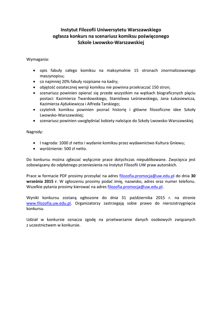 Instytut Filozofii Uniwersytetu Warszawskiego ogłasza konkurs na scenariusz komiksu poświęconego Szkole Lwowsko-Warszawskiej Wymagania: opis fabuły całego komiksu na maksymalnie 15 stronach znormalizowanego maszynopisu; co najmniej 20% fabuły rozpisane na kadry; objętość ostatecznej wersji komiksu nie powinna przekraczać 150 stron; scenariusz powinien opierać się przede wszystkim na wątkach biograficznych pięciu postaci: Kazimierza Twardowskiego, Stanisława Leśniewskiego, Jana Łukasiewicza, Kazimierza Ajdukiewicza i Alfreda Tarskiego; czytelnik komiksu powinien poznać historię i główne filozoficzne idee Szkoły Lwowsko-Warszawskiej; scenariusz powinien uwzględniać kobiety należące do Szkoły Lwowsko-Warszawskiej. Nagrody: I nagroda: 1000 zł netto i wydanie komiksu przez wydawnictwo Kultura Gniewu; wyróżnienie: 500 zł netto. Do konkursu można zgłaszać wyłącznie prace dotychczas niepublikowane. Zwycięzca jest zobowiązany do odpłatnego przeniesienia na Instytut Filozofii UW praw autorskich. Prace w formacie PDF prosimy przesyłać na adres [email protected] do dnia 30 września 2015 r. W zgłoszeniu prosimy podać imię, nazwisko, adres oraz numer telefonu. Wszelkie pytania prosimy kierować na adres [email protected]. Wyniki konkursu zostaną ogłoszone do dnia 31 października 2015 r. na stronie www.filozofia.uw.edu.pl. Organizatorzy zastrzegają sobie prawo do nierozstrzygnięcia konkursu. Udział w konkursie oznacza zgodę na przetwarzanie danych osobowych związanych z uczestnictwem w konkursie.