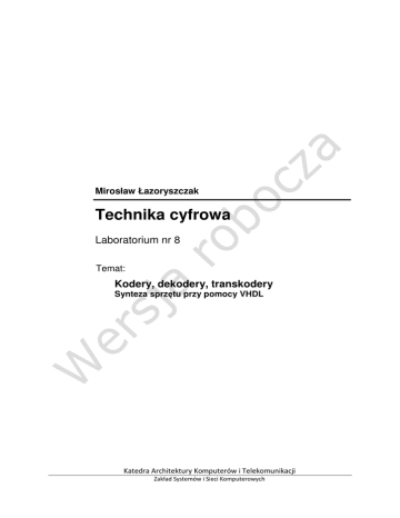 Mirosław Łazoryszczak Technika cyfrowa Laboratorium nr 8 Temat: Kodery, dekodery, transkodery Synteza sprzętu przy pomocy VHDL Katedra Architektury Komputerów i Telekomunikacji Zakład Systemów i Sieci Komputerowych SPIS TREŚCI 1. Wymagania ................................................................................................. 3 2. Przebieg ćwiczenia....................................................................................... 3 2.1. Przykład projektowy ............................................................................. 3 2.2. Realizacja transkodera w języku VHDL .................................................. 5 3. Zadania...................................................................................................... 12 4. Podsumowanie.......................................................................................... 14 5. Literatura................................................................................................... 14 Technika cyfrowa – Laboratorium nr 8 1. W Y M A GAN I A Wykonanie ćwiczenia obejmującego temat koderów, dekoderów oraz transkoderów wymaga od studenta znajomości: • kodów typu „1 z n”, kodu Graya, kodu BCD, • projektowania układów kombinacyjnych przy pomocy znanych metod, • zasad działania wyświetlacza siedmiosegmentowego LED, • podstaw posługiwania się narzędziem Xilinx ISE, a w szczególności tworzenia projektu opartego na schemacie, wykonania operacji implementacji, przeprowadzenia symulacji opartej na jednostce testowej (ang. test bench) implementowanej w języku VHDL. 2. PRZEBI EG ĆW I CZEN I A W warstwie merytorycznej niniejszego ćwiczenia wykorzystywane są ponownie układy kombinacyjne, których przykładem są kodery, dekodery i transkodery. Układy te stanowią istotną podgrupę układów logicznych, która jest szeroko wykorzystywana w różnych obszarach techniki cyfrowej. Kodery oznaczają układy, których zadaniem jest konwersja kodu typu „1 z n” na kod binarny, dekodery zaś pełnią funkcję odwrotną. Zadaniem natomiast transkoderów jest zamiana jednego kodu na inny, przy czym zarówno kod wejściowy jak wyjściowy nie jest kodem typu „1 z n”. Zakres ćwiczenia obejmuje wszystkie etapy projektowania, z którymi uczestnicy laboratoriów mogli zetknąć się do tej pory. Nowym, lecz niezwykle istotnym elementem jest zapis projektu w postaci kodu VHDL oraz synteza i implementacja projektu w konkretnej platformie sprzętowej. 2.1. PRZYKŁAD PROJEKTOWY Zadanie Zaprojektuj, wykonaj symulację oraz zaimplementuj i przetestuj w układzie rzeczywistym czterobitowy transkoder kodu binarnego na kod Graya. Tabela 1: Tablica przejść ilustrująca działanie licznika Liczba x dziesiętna 3 0 0 1 0 2 0 3 0 4 0 5 0 6 0 7 0 8 1 9 1 10 1 11 1 12 1 13 1 14 1 15 1 x2 x1 x0 y3 y2 y1 y0 0 0 0 0 1 1 1 1 0 0 0 0 1 1 1 1 0 0 1 1 0 0 1 1 0 0 1 1 0 0 1 1 0 1 0 1 0 1 0 1 0 1 0 1 0 1 0 1 0 0 0 0 0 0 0 0 1 1 1 1 1 1 1 1 0 0 0 0 1 1 1 1 1 1 1 1 0 0 0 0 0 0 1 1 1 1 0 0 0 0 1 1 1 1 0 0 0 1 1 0 0 1 1 0 0 1 1 0 0 1 1 0 Strona 3 z 14 Technika cyfrowa – Laboratorium nr 8 Tablica prawdy dla jednej z możliwych postaci transkodera kodu binarnego na kod Graya została przedstawiona w tabeli 1. Klasyczne podejście do zagadnienia projektowania układu transkodera jako układu kombinacyjnego wymaga wyznaczenia tylu funkcji logicznych, ile wyjść powinien posiadać projektowany układ. Korzystając z tradycyjnych metod minimalizacji funkcji logicznych można otrzymać zbiór funkcji boolowskich dla poszczególnych wyjść układu transkodera. Tabela 2: Tablica Karnaugh dla funkcji x1x0 00 01 11 10 00 0 0 0 0 01 0 0 0 0 11 1 1 1 1 10 1 1 1 1 x3x2 y3 y3 = x3 Tabela 3: Tablica Karnaugh dla funkcji x1x0 00 01 11 10 00 0 0 0 0 01 1 1 1 1 11 0 0 0 0 10 1 1 1 1 x3x2 y2 y 2 = x3 x 2 ∨ x 3 x 2 = x 2 ⊕ x 3 Tabela 4: Tablica Karnaugh dla funkcji x1x0 00 01 11 10 00 0 0 1 1 01 1 1 0 0 11 1 1 0 0 10 0 0 1 1 x3x2 y1 y1 = x1 x 2 ∨ x1 x 2 = x1 ⊕ x 2 Tabela 5: Tablica Karnaugh dla funkcji x1x0 00 01 11 10 00 0 1 0 1 01 0 1 0 1 11 0 1 0 1 10 0 1 0 1 x3x2 y 0 = x1 x0 ∨ x1 x0 = x 0 ⊕ x1 Strona 4 z 14 y0 Technika cyfrowa – Laboratorium nr 8 Wpisując wartości funkcji z tablicy prawdy do tablic Karnaugh otrzymujemy zestaw tabel oraz odpowiadających im wyrażeń boolowskich przedstawionych w tabelach 2 – 5. Realizacja układowa wynikająca wprost z powyższych równań przedstawiona została na rys. 1. Bufor, który znajduje się pomiędzy sygnałem wyjściowym y3 a sygnałem wejściowym x3 pełni funkcję techniczną (separującą). Rys. 1. Schemat układu realizującego zamianę kodu binarnego na kod Graya 2.2. REALIZACJA TRANSKODERA W JĘZYKU VHDL Projekt transkodera może być równie dobrze zrealizowany nie tylko w postaci schematu, ale także w postaci kodu w języku VHDL. Kod taki jest zresztą ogniwem pośrednim pomiędzy schematem, a postacią wynikową projektu czyli bezpośrednią implementacją w strukturze sprzętowej. Z przeprowadzonych uprzednio ćwiczeń laboratoryjnych wiadomo, w jaki sposób można zapoznać się ze strukturą kodu VHDL, stanowiącą realizację wprowadzonego schematu (rys. 2). Rys. 2. Uruchomienie podglądu kodu VHDL projektowanego układu Fragment kodu odpowiadającego za realizację schematu transkodera przedstawiono na wydruku 1. Styl (sposób) konstrukcji tego kodu określany jest jako strukturalny, ponieważ opisuje precyzyjnie komponenty, które wchodzą w skład projektu oraz definiuje połączenia pomiędzy nimi. Z punktu widzenia zastosowania konstrukcji języka VHDL należy zwrócić uwagę na główne elementy konstrukcji kodu: Strona 5 z 14 Technika cyfrowa – Laboratorium nr 8 • entity – jednostka projektowa, w której zdefiniowany jest interfejs zewnętrzny układu, czyli jego wejścia oraz wyjścia, • architecture – ciało architektury, które określa sposób działania układu o zdefiniowanym wyżej interfejsie. Znajdują się tu