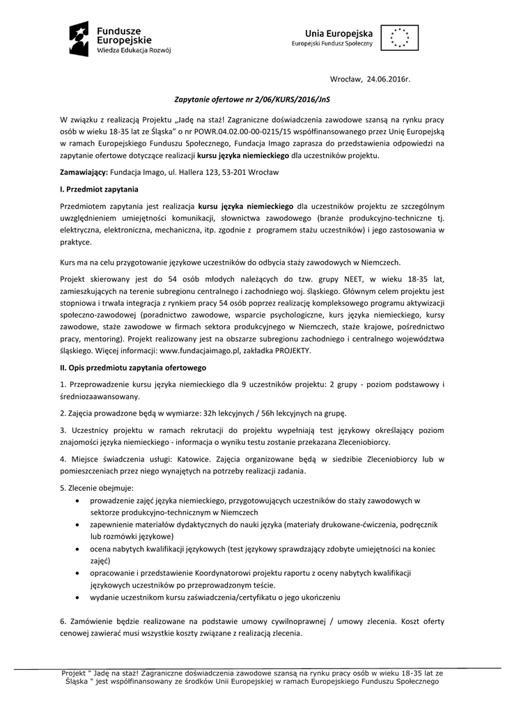 Wrocław, 24.06.2016r. Zapytanie ofertowe nr 2/06/KURS/2016/JnS W związku z realizacją Projektu „Jadę na staż! Zagraniczne doświadczenia zawodowe szansą na rynku pracy osób w wieku 18-35 lat ze Śląska” o nr POWR.04.02.00-00-0215/15 współfinansowanego przez Unię Europejską w ramach Europejskiego Funduszu Społecznego, Fundacja Imago zaprasza do przedstawienia odpowiedzi na zapytanie ofertowe dotyczące realizacji kursu języka niemieckiego dla uczestników projektu. Zamawiający: Fundacja Imago, ul. Hallera 123, 53-201 Wrocław I. Przedmiot zapytania Przedmiotem zapytania jest realizacja kursu języka niemieckiego dla uczestników projektu ze szczególnym uwzględnieniem umiejętności komunikacji, słownictwa zawodowego (branże produkcyjno-techniczne tj. elektryczna, elektroniczna, mechaniczna, itp. zgodnie z programem stażu uczestników) i jego zastosowania w praktyce. Kurs ma na celu przygotowanie językowe uczestników do odbycia staży zawodowych w Niemczech. Projekt skierowany jest do 54 osób młodych należących do tzw. grupy NEET, w wieku 18-35 lat, zamieszkujących na terenie subregionu centralnego i zachodniego woj. śląskiego. Głównym celem projektu jest stopniowa i trwała integracja z rynkiem pracy 54 osób poprzez realizację kompleksowego programu aktywizacji społeczno-zawodowej (poradnictwo zawodowe, wsparcie psychologiczne, kurs języka niemieckiego, kursy zawodowe, staże zawodowe w firmach sektora produkcyjnego w Niemczech, staże krajowe, pośrednictwo pracy, mentoring). Projekt realizowany jest na obszarze subregionu zachodniego i centralnego województwa śląskiego. Więcej informacji: www.fundacjaimago.pl, zakładka PROJEKTY. II. Opis przedmiotu zapytania ofertowego 1. Przeprowadzenie kursu języka niemieckiego dla 9 uczestników projektu: 2 grupy - poziom podstawowy i średniozaawansowany. 2. Zajęcia prowadzone będą w wymiarze: 32h lekcyjnych / 56h lekcyjnych na grupę. 3. Uczestnicy projektu w ramach rekrutacji do projektu wypełniają test językowy określający poziom znajomości języka niemieckiego - informacja o wyniku testu zostanie przekazana Zleceniobiorcy. 4. Miejsce świadczenia usługi: Katowice. Zajęcia organizowane będą w siedzibie Zleceniobiorcy lub w pomieszczeniach przez niego wynajętych na potrzeby realizacji zadania. 5. Zlecenie obejmuje: prowadzenie zajęć języka niemieckiego, przygotowujących uczestników do staży zawodowych w sektorze produkcyjno-technicznym w Niemczech zapewnienie materiałów dydaktycznych do nauki języka (materiały drukowane-ćwiczenia, podręcznik lub rozmówki językowe) ocena nabytych kwalifikacji językowych (test językowy sprawdzający zdobyte umiejętności na koniec zajęć) opracowanie i przedstawienie Koordynatorowi projektu raportu z oceny nabytych kwalifikacji językowych uczestników po przeprowadzonym teście. wydanie uczestnikom kursu zaświadczenia/certyfikatu o jego ukończeniu 6. Zamówienie będzie realizowane na podstawie umowy cywilnoprawnej / umowy zlecenia. Koszt oferty cenowej zawierać musi wszystkie koszty związane z realizacją zlecenia. Projekt " Jadę na staż! Zagraniczne doświadczenia zawodowe szansą na rynku pracy osób w wieku 18-35 lat ze Śląska " jest współfinansowany ze środków Unii Europejskiej w ramach Europejskiego Funduszu Społecznego III. Termin realizacji zlecenia: 04.07.2016-05.08.2016 Zamawiający zastrzega prawo do zmiany terminów zgodnie z aktualnym wnioskiem o dofinansowanie. IV. Dokumenty niezbędne do złożenia odpowiedzi na zapytanie o cenę: formularz oferty (Załącznik nr 1) i oświadczenie (Załącznik 2), dokumenty potwierdzające wymogi określone w pkt. VI. V. Kryteria oceny: 1. Najniższa cena – kwota brutto z Formularza ofertowego za godzinę realizacji zlecenia - 100%. Wykonawca, który poda najniższą cenę brutto za godzinę realizacji zlecenia otrzyma 100 pkt., natomiast pozostałe oferty otrzymają punktację proporcjonalnie na podstawie wzoru: cena najniższej oferty/cena badanej oferty x 100. VI. Wymogi wobec zleceniobiorcy: 1. Zleceniobiorca posiada uprawnienia do wykonywania określonej działalności lub czynności, jeżeli przepisy prawa nakładają obowiązek posiadania takich uprawnień. 2. Zleceniobiorca dysponuje odpowiednim potencjałem technicznym oraz osobami zdolnymi do wykonywania zamówienia: Zleceniodawca uzna ten warunek za spełniony jeżeli Zleceniobiorca wykaże, że dysponuje i/lub będzie dysponował osobami zdolnymi do wykonania zlecenia, poprzez wykazanie minimum 1 lektora, który: a) posiada wykształcenie wyższe, b) posiada doświadczenie w prowadzeniu kursów języka niemieckiego dla osób dorosłych na obszarze realizacji projektu - minimum 480 godzin praktyki w ciągu ostatnich trzech lat kalendarzowych. 3. Zleceniobiorca posiada doświadczenie w realizacji kursów języka niemieckiego na obszarze realizacji projektu (min. 3 letnie doświadczenie w realizacji kursów języka niemieckiego dla osób dorosłych na obszarze realizacji projektu). VII. Informacje nt. zakresu wykluczenia z realizacji zlecenia 1. Wykonawcy podlegający wykluczeniu na podstawie art. 24 ust. 1 ustawy Prawo Zamówień Publicznych 2. Wykonawcy składający ofertę na wykonanie przedmiotu zamówienia, którzy nie spełniają przesłanek określonych w art.24.ust.1 ustawy Prawo Zamówień Publicznych składają oświadczenie, które jest załącznikiem numer 2 do Zapytania Ofertowego. VIII. Termin składania odpowiedzi na zapytanie ofertowe: Do dnia 28.06.2016 roku (data wpływu oferty): a) drogą pocztową/kurierem/osobiście na adres: Fundacja Imago, ul. Hallera 123, 53-201 Wrocław, z dopiskiem Zapytanie o cenę nr 2/06/TEST JĘZYK/2016/JnS b) lub elektronicznie (skan podpisanych dokumentów) na adres: [email protected] IX. Zawarcie umowy: 1. Zamawiający zastrzega sobie prawo do odstąpienia od zawarcia umowy bez podania przyczyny. 2. Zamawiający zastrzega sobie prawo do negocjacji z oferentem, który 