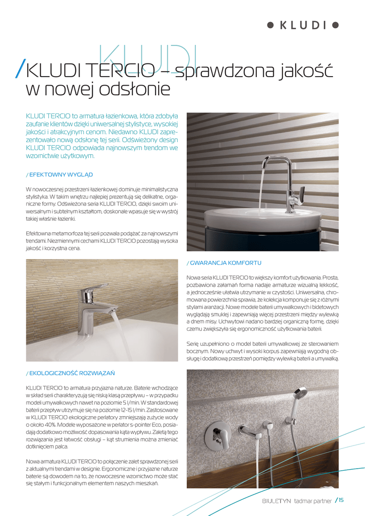 KLUDI / KLUDI TERCIO – sprawdzona jakość w nowej odsłonie KLUDI TERCIO to armatura łazienkowa, która zdobyła zaufanie klientów dzięki uniwersalnej stylistyce, wysokiej jakości i atrakcyjnym cenom. Niedawno KLUDI zaprezentowało nową odsłonę tej serii. Odświeżony design KLUDI TERCIO odpowiada najnowszym trendom we wzornictwie użytkowym. //EFEKTOWNY WYGLĄD W nowoczesnej przestrzeni łazienkowej dominuje minimalistyczna stylistyka. W takim wnętrzu najlepiej prezentują się delikatne, organiczne formy. Odświeżona seria KLUDI TERCIO, dzięki swoim uniwersalnym i subtelnym kształtom, doskonale wpasuje się w wystrój takiej właśnie łazienki. Efektowna metamorfoza tej serii pozwala podążać za najnowszymi trendami. Niezmiennymi cechami KLUDI TERCIO pozostają wysoka jakość i korzystna cena. //GWARANCJA KOMFORTU Nowa seria KLUDI TERCIO to większy komfort użytkowania. Prosta, pozbawiona załamań forma nadaje armaturze wizualną lekkość, a jednocześnie ułatwia utrzymanie w czystości. Uniwersalna, chromowana powierzchnia sprawia, że kolekcja komponuje się z różnymi stylami aranżacji. Nowe modele baterii umywalkowych i bidetowych wyglądają smuklej i zapewniają więcej przestrzeni między wylewką a dnem misy. Uchwytowi nadano bardziej organiczną formę, dzięki czemu zwiększyła się ergonomiczność użytkowania baterii. Serię uzupełniono o model baterii umywalkowej ze sterowaniem bocznym. Nowy uchwyt i wysoki korpus zapewniają wygodną obsługę i dodatkową przestrzeń pomiędzy wylewką baterii a umywalką. //EKOLOGICZNOŚĆ ROZWIĄZAŃ KLUDI TERCIO to armatura przyjazna naturze. Baterie wchodzące w skład serii charakteryzują się niską klasą przepływu – w przypadku modeli umywalkowych nawet na poziomie 5 l/min. W standardowej baterii przepływ utrzymuje się na poziomie 12-15 l/min. Zastosowane w KLUDI TERCIO ekologiczne perlatory zmniejszają zużycie wody o około 40%. Modele wyposażone w perlator s-pointer Eco, posiadają dodatkowo możliwość dopasowania kąta wypływu. Zaletą tego rozwiązania jest łatwość obsługi – kąt strumienia można zmieniać dotknięciem palca. Nowa armatura KLUDI TERCIO to połączenie zalet sprawdzonej serii z aktualnymi trendami w designie. Ergonomiczne i przyjazne naturze baterie są dowodem na to, że nowoczesne wzornictwo może stać się stałym i funkcjonalnym elementem naszych mieszkań. tadmar partner / 15