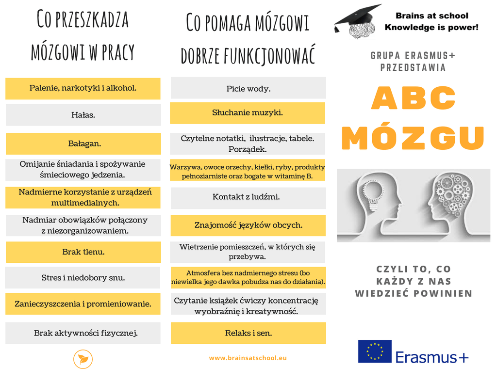 Co przeszkadza mózgowi w pracy Co pomaga mózgowi dobrze funkcjonować Palenie, narkotyki i alkohol. Picie wody. Hałas. Słuchanie muzyki. Bałagan. Czytelne notatki, ilustracje, tabele. Porządek. Omijanie śniadania i spożywanie śmieciowego jedzenia. Nadmierne korzystanie z urządzeń multimedialnych. ABC MÓZGU Warzywa, owoce orzechy, kiełki, ryby, produkty pełnoziarniste oraz bogate w witaminę B. Kontakt z ludźmi. Nadmiar obowiązków połączony z niezorganizowaniem. Znajomość języków obcych. Brak tlenu. Wietrzenie pomieszczeń, w których się przebywa. Stres i niedobory snu. Atmosfera bez nadmiernego stresu (bo niewielka jego dawka pobudza nas do działania). Zanieczyszczenia i promieniowanie. Czytanie książek ćwiczy koncentrację wyobraźnię i kreatywność. Organik is a family owned values based business and we're all about healthy and organic food. Brak aktywności fizycznej. GRUPA ERASMUS+ PRZEDSTAWIA To find out why we crave natural Relaks i sen.food and read our life-long journey in healthy food, visit us at: www.brainsatschool.eu CZYLI TO, CO KAŻDY Z NAS WIEDZIEĆ POWINIEN MÓZG W LICZBACH Twój mózg waży około 1,3 kg. To zaledwie 2% całkowitej wagi ciała. Mózg zużywa 20% energii wytwarzanej przez organizm. Jest najszybszym organem w Twoim ciele i składa się w 60% z tłuszczu. Znajduje się w nim ok. 100 miliardów neuronów. Jeden neuron ma ok. 0,1 mm średnicy. Generuje od 10-23 woltów elektryczności. Może przechowywać do 110 terabajtów informacji. Jest w 30% biały i w 40% szary. Niestety, jeśli Twój mózg przez 5-10 minut nie otrzyma tlenu, uszkodzi się na zawsze. NIESAMOWITE FAKTY Pamięć i osobowość może funkcjonować normalnie nawet po operacyjnym usunięciu połowy mózgu. Za każdym razem, gdy próbujemy sobie coś przypomnieć tworzą się nowe połączenia w mózgu. W mózgu nie ma receptorów bólu, więc nie może on boleć. Nadmierne używanie komórek może powodować raka mózgu. Masz około 70 tysięcy myśli na dzień. Jeśli za mało śpisz, Twój mózg ma problemy z podejmowanie decyzji, przez co wolniej reaguje. Prawa strona mózgu kontroluje lewą stronę ciała i na odwrót. Kiedy uczysz się czegoś nowego, struktury mózgu się zmieniają. Kobiecy mózg jest mniejszy od mózgu mężczyzny, ale nie ma to żadnego wpływu na ich funkcjonowanie. Diety mogą zmusić Twój mózg do autodestrukcji. ZABAWNE FAKTY Kiedy nie spisz Twój mózg produkuje wystarczającą ilość prądu, aby zasilić małą żarówkę. Ludzki mózg ma tę samą konsystencję co ser tofu. Po śmierci Einsteina jego mózg został skradziony przez lekarzy i trzymano go 20 lat w słoiku. Zapach czekolady pomaga zrelaksować się, ponieważ w czasie jej jedzenia mózg wytwarza fale theta. Twój mózg jest bardziej kreatywny kiedy jesteś zmęczony. Zapominanie jest dobre dla mózgu kasowanie nieważnych informacji pomaga mu w byciu bardziej efektywnym. 2-letnie dziecko ma mózg geniusza. Kiedy dorastamy gubimy te świetne możliwości. Nasz mózg składa się w prawie 75% z wody, a ogórek w 90%. Ziewanie podczas lekcji oznacza, że mózg intensywnie pracuje i potrzebuje więcej tlenu, czyli jest zainteresowany lekcją.