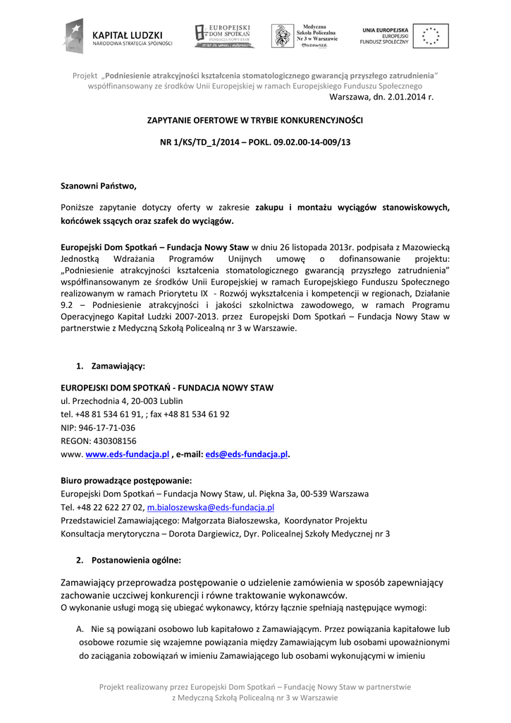 Projekt „Podniesienie atrakcyjności kształcenia stomatologicznego gwarancją przyszłego zatrudnienia” współfinansowany ze środków Unii Europejskiej w ramach Europejskiego Funduszu Społecznego Warszawa, dn. 2.01.2014 r. ZAPYTANIE OFERTOWE W TRYBIE KONKURENCYJNOŚCI NR 1/KS/TD_1/2014 – POKL. 09.02.00-14-009/13 Szanowni Państwo, Poniższe zapytanie dotyczy oferty w zakresie zakupu i montażu wyciągów stanowiskowych, końcówek ssących oraz szafek do wyciągów. Europejski Dom Spotkań – Fundacja Nowy Staw w dniu 26 listopada 2013r. podpisała z Mazowiecką Jednostką Wdrażania Programów Unijnych umowę o dofinansowanie projektu: „Podniesienie atrakcyjności kształcenia stomatologicznego gwarancją przyszłego zatrudnienia” współfinansowanym ze środków Unii Europejskiej w ramach Europejskiego Funduszu Społecznego realizowanym w ramach Priorytetu IX - Rozwój wykształcenia i kompetencji w regionach, Działanie 9.2 – Podniesienie atrakcyjności i jakości szkolnictwa zawodowego, w ramach Programu Operacyjnego Kapitał Ludzki 2007-2013. przez Europejski Dom Spotkań – Fundacja Nowy Staw w partnerstwie z Medyczną Szkołą Policealną nr 3 w Warszawie. 1. Zamawiający: EUROPEJSKI DOM SPOTKAŃ - FUNDACJA NOWY STAW ul. Przechodnia 4, 20-003 Lublin tel. +48 81 534 61 91, ; fax +48 81 534 61 92 NIP: 946-17-71-036 REGON: 430308156 www. www.eds-fundacja.pl , e-mail: [email protected]. Biuro prowadzące postępowanie: Europejski Dom Spotkań – Fundacja Nowy Staw, ul. Piękna 3a, 00-539 Warszawa Tel. +48 22 622 27 02, [email protected] Przedstawiciel Zamawiającego: Małgorzata Białoszewska, Koordynator Projektu Konsultacja merytoryczna – Dorota Dargiewicz, Dyr. Policealnej Szkoły Medycznej nr 3 2. Postanowienia ogólne: Zamawiający przeprowadza postępowanie o udzielenie zamówienia w sposób zapewniający zachowanie uczciwej konkurencji i równe traktowanie wykonawców. O wykonanie usługi mogą się ubiegać wykonawcy, którzy łącznie spełniają następujące wymogi: A. Nie są powiązani osobowo lub kapitałowo z Zamawiającym. Przez powiązania kapitałowe lub osobowe rozumie się wzajemne powiązania między Zamawiającym lub osobami upoważnionymi do zaciągania zobowiązań w imieniu Zamawiającego lub osobami wykonującymi w imieniu Projekt realizowany przez Europejski Dom Spotkań – Fundację Nowy Staw w partnerstwie z Medyczną Szkołą Policealną nr 3 w Warszawie Projekt „Podniesienie atrakcyjności kształcenia stomatologicznego gwarancją przyszłego zatrudnienia” współfinansowany ze środków Unii Europejskiej w ramach Europejskiego Funduszu Społecznego Zamawiającego czynności związanych z przygotowaniem i przeprowadzeniem procedury wyboru wykonawcy a Wykonawcą, polegające w szczególności na: uczestniczeniu w spółce jako wspólnik spółki cywilnej lub spółki osobowej; posiadaniu co najmniej 10 % udziałów lub akcji; pełnieniu funkcji członka organu nadzorczego lub zarządzającego, prokurenta, pełnomocnika; pozostawaniu w związku małżeńskim, w stosunku pokrewieństwa lub powinowactwa w linii prostej, pokrewieństwa lub powinowactwa w linii bocznej do drugiego stopnia lub w stosunku przysposobienia, opieki lub kurateli. B. Posiadają uprawnienia do wykonywania działalności zgodnie z przedmiotem zamówienia. C. Znajduję się w sytuacji ekonomicznej i finansowej pozwalającej na wykonanie zamówienia zgodnie ze szczegółowym opisem przedmiotu zamówienia z punktu 3 niniejszego zapytania. D. Posiadają niezbędną wiedzę, doświadczenie i zaplecze techniczne. E. Brak jest podstaw do wykluczenia tj: W ciągu ostatnich 3 lat przed wszczęciem postępowania nie wyrządziłem szkody, nie wykonując zamówienia lub wykonując je nienależycie Nie otwarto wobec mnie likwidacji ani nie ogłoszono upadłości. Nie zalegam z uiszczeniem podatków, opłat lub składek na ubezpieczenia społeczne lub zdrowotne Nie zostałem prawomocnie skazany za przestępstwo popełnione w związku z postępowaniem o udzielenie zamówienia, przestępstwo przekupstwa, przestępstwo przeciwko obrotowi gospodarczemu lub inne przestępstwo popełnione w celu osiągnięcia korzyści majątkowych Jako podmiot zbiorowy sąd nie orzekł wobec mnie zakazu ubiegania się o zamówienia, na podstawie przepisów o odpowiedzialności podmiotów zbiorowych za czyny zabronione pod groźbą kary. 3. Szczegółowy opis przedmiotu zamówienia: Przedmiotem zamówienia jest zakup i dostarczenie sprzętu niezbędnego do prowadzenia szkolenia „Metoda termoformowalna” dla techników dentystycznych, zgodnie z poniższą specyfikacją: ARTYKUŁ Wyciągi stanowiskowe Ilość 15 Specyfikacja (wymagania techniczne) Wyciągi mają być dostosowane do obsłużenia biurek protetycznych firmy ROKO zestawionych w formie wysp. Biurka są ustawione w dwuszereg po 3szt. wyciągi są planowane w układzie 1 wyciąg 1 szafka, w 7 rzędach po 2 wyciągi w jednym rzędzie 1 wyciąg. Na ustawienie wyciągów w szafkach jest przewidziana przestrzeń na Projekt realizowany przez Europejski Dom Spotkań – Fundację Nowy Staw w partnerstwie z Medyczną Szkołą Policealną nr 3 w Warszawie Projekt „Podniesienie atrakcyjności kształcenia stomatologicznego gwarancją przyszłego zatrudnienia” współfinansowany ze środków Unii Europejskiej w ramach Europejskiego Funduszu Społecznego szczycie wyspy w wymiarze: szer. do 50cm, gł. do 120cm, wys. do 70cm. (między początkiem każdego rzędu stołów a ścianą z oknem) przewidziano tam postawienie 2 szafek danego rzędu stołów. Podłączenie od wyciągu do stołów: w obszarze pomiędzy zestawionymi biurkami, przewodem (wężem) giętkim lub sztywnym o długości max do 3,5m wraz z kolankami i rozgałęziaczami. Zamontowanie do biurek z możliwością oddzielnego włączania stanowiskowego i regulowania siły ciągu. Urządzenie do zamontowania do istniejących biurek protetycznych bez zajmowania przestrzeni pod biurkiem