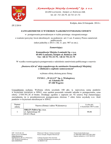„Komunikacja Miejska Łomianki” Sp. z o.o. 05-092 Łomianki, Kiełpin ul. Rolnicza 248, tel. 22 751-33-79, 22 751-21-75 Kiełpin, dnia 24 listopada 2014 r. ZP.2/2014 ZAWIADOMIENIE O WYBORZE NAJKORZYSTNIEJSZEJ OFERTY w postępowaniu prowadzonym w trybie przetargu nieograniczonego o wartości powyżej kwot określonych na podstawie art.11 ust. 8 ustawy Prawo zamówień publicznych (tekst jednolity z 2013 r. Dz. U. poz. 907 ze zm.). Zamawiający Komunikacja Miejska Łomianki Sp. z o.o. 05-092 Łomianki, Kiełpin ul. Rolnicza 248 Tel. +48 22 751-33-79, +48 22 751-21-75 W wyniku rozstrzygnięcia postępowania o udzielenie zamówienia publicznego o nazwie: „Dostawa 624 m3 oleju napędowego do autobusów Komunikacji Miejskiej z silnikami o zapłonie samoczynnym” wybrano ofertę złożoną przez firmę: P.P.H.U. „WAGAT” Sp. j. Wielogórscy ul. Gdańska 95 07-100 Węgrów Uzasadnienie wyboru: Wybrana oferta uzyskała 100 pkt, tj. najwyższą sumę punktów w kryterium zawartym w SIWZ, oraz spełnia pozostałe warunki udziału w postępowaniu, cena oferty: 2 930 391,36 zł brutto. Działając zgodnie z zapisem art. 92 ustawy Pzp Zamawiający zawiadamia, że w przedmiotowym postępowaniu złożono 7 ofert, które uzyskały n.w. ilość punktów w kryterium określonym w SIWZ. Numer oferty 1 Nazwa (firma) i adres Wykonawcy ORLEN Paliwa Sp. z o.o. ul. Zglenickiego 44 09-411 Płock NIP: 118-07-46-143 Regon: 01227136200000 Organ Rejestrowy Sąd Rejonowy dla m-ta Warszawy XIV Wydział Gospodarczy KRS 0000099681 Właściciel: Miasto i Gmina Łomianki Prezes Zarządu: Bogdan Marcińczyk Członek Zarządu: Piotr Nowicki Certyfikat Kompetencji Zawodowych Nr 00809/F1/04 Liczba pkt. w kryterium 100 % cena 99,90 Numer konta bankowego: 81 8009 0007 0004 9184 2001 0001 Kapitał zakładowy: 6 819 500 PLN „Komunikacja Miejska Łomianki” Sp. z o.o. 05-092 Łomianki, Kiełpin ul. Rolnicza 248, tel. 22 751-33-79, 22 751-21-75 2 3 4 5 6 7 Przedsiębiorstwo Budowlano – Handlowe „Z. Niziński” ul. Serocka 11 A 07-200 Wyszków PETRODOM Venna Sp. z o.o., Sp. k. ul. Sidorska 61 21-500 Biała Podlaska P.P.H.U. „WAGAT” Sp. j. Wielogórscy ul. Gdańska 95 07-100 Węgrów Przedsiębiorstwo Handlowo Usługowe ŻAR Arkadiusz Saczewski ul. Sokołowska 159 A 08-110 Siedlce Konsorcjum firm: PETROJET Sp. z o.o. – lider Konsorcjum Kieszek 52 26-670 Pionki PETROLIS Sp. z o.o. – partner Konsorcjum ul. Władysława Jagiełły 10 a/204 26-700 Zwoleń TRANSOIL ENERGY Sp. z o.o. ul. S. Kazury 22/9 02-795 Warszawa NIP: 118-07-46-143 Regon: 01227136200000 Organ Rejestrowy Sąd Rejonowy dla m-ta Warszawy XIV Wydział Gospodarczy KRS 0000099681 Właściciel: Miasto i Gmina Łomianki Prezes Zarządu: Bogdan Marcińczyk Członek Zarządu: Piotr Nowicki Certyfikat Kompetencji Zawodowych Nr 00809/F1/04 99,91 99,63 100,00 99,40 99,64 99,65 Numer konta bankowego: 81 8009 0007 0004 9184 2001 0001 Kapitał zakładowy: 6 819 500 PLN