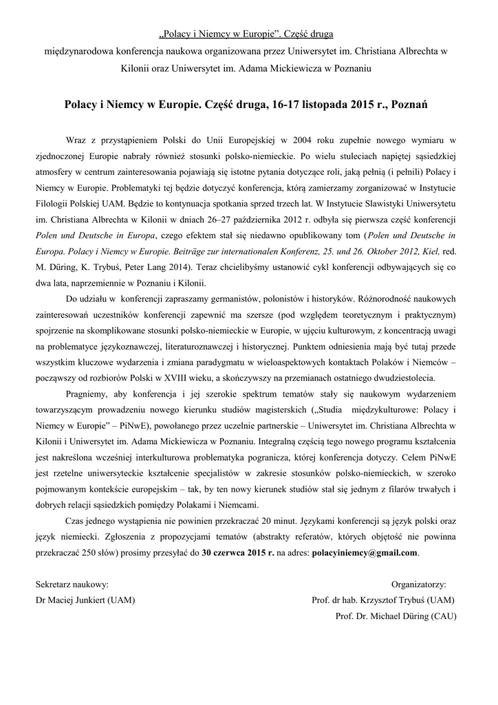 „Polacy i Niemcy w Europie”. Część druga międzynarodowa konferencja naukowa organizowana przez Uniwersytet im. Christiana Albrechta w Kilonii oraz Uniwersytet im. Adama Mickiewicza w Poznaniu Polacy i Niemcy w Europie. Część druga, 16-17 listopada 2015 r., Poznań Wraz z przystąpieniem Polski do Unii Europejskiej w 2004 roku zupełnie nowego wymiaru w zjednoczonej Europie nabrały również stosunki polsko-niemieckie. Po wielu stuleciach napiętej sąsiedzkiej atmosfery w centrum zainteresowania pojawiają się istotne pytania dotyczące roli, jaką pełnią (i pełnili) Polacy i Niemcy w Europie. Problematyki tej będzie dotyczyć konferencja, którą zamierzamy zorganizować w Instytucie Filologii Polskiej UAM. Będzie to kontynuacja spotkania sprzed trzech lat. W Instytucie Slawistyki Uniwersytetu im. Christiana Albrechta w Kilonii w dniach 26–27 października 2012 r. odbyła się pierwsza część konferencji Polen und Deutsche in Europa, czego efektem stał się niedawno opublikowany tom (Polen und Deutsche in Europa. Polacy i Niemcy w Europie. Beiträge zur internationalen Konferenz, 25. und 26. Oktober 2012, Kiel, red. M. Düring, K. Trybuś, Peter Lang 2014). Teraz chcielibyśmy ustanowić cykl konferencji odbywających się co dwa lata, naprzemiennie w Poznaniu i Kilonii. Do udziału w konferencji zapraszamy germanistów, polonistów i historyków. Różnorodność naukowych zainteresowań uczestników konferencji zapewnić ma szersze (pod względem teoretycznym i praktycznym) spojrzenie na skomplikowane stosunki polsko-niemieckie w Europie, w ujęciu kulturowym, z koncentracją uwagi na problematyce językoznawczej, literaturoznawczej i historycznej. Punktem odniesienia mają być tutaj przede wszystkim kluczowe wydarzenia i zmiana paradygmatu w wieloaspektowych kontaktach Polaków i Niemców – począwszy od rozbiorów Polski w XVIII wieku, a skończywszy na przemianach ostatniego dwudziestolecia. Pragniemy, aby konferencja i jej szerokie spektrum tematów stały się naukowym wydarzeniem towarzyszącym prowadzeniu nowego kierunku studiów magisterskich („Studia międzykulturowe: Polacy i Niemcy w Europie” – PiNwE), powołanego przez uczelnie partnerskie – Uniwersytet im. Christiana Albrechta w Kilonii i Uniwersytet im. Adama Mickiewicza w Poznaniu. Integralną częścią tego nowego programu kształcenia jest nakreślona wcześniej interkulturowa problematyka pogranicza, której konferencja dotyczy. Celem PiNwE jest rzetelne uniwersyteckie kształcenie specjalistów w zakresie stosunków polsko-niemieckich, w szeroko pojmowanym kontekście europejskim – tak, by ten nowy kierunek studiów stał się jednym z filarów trwałych i dobrych relacji sąsiedzkich pomiędzy Polakami i Niemcami. Czas jednego wystąpienia nie powinien przekraczać 20 minut. Językami konferencji są język polski oraz język niemiecki. Zgłoszenia z propozycjami tematów (abstrakty referatów, których objętość nie powinna przekraczać 250 słów) prosimy przesyłać do 30 czerwca 2015 r. na adres: [email protected]. Sekretarz naukowy: Dr Maciej Junkiert (UAM) Organizatorzy: Prof. dr hab. Krzysztof Trybuś (UAM) Prof. Dr. Michael Düring (CAU)