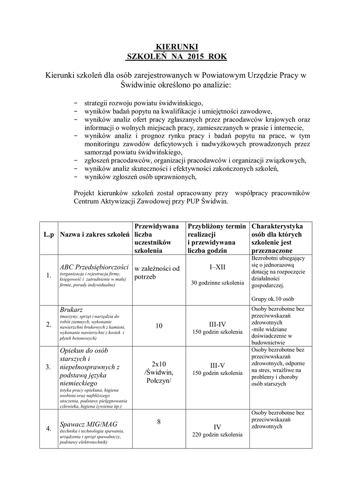 KIERUNKI SZKOLEŃ NA 2015 ROK Kierunki szkoleń dla osób zarejestrowanych w Powiatowym Urzędzie Pracy w Świdwinie określono po analizie: − strategii rozwoju powiatu świdwińskiego, − wyników badań popytu na kwalifikacje i umiejętności zawodowe, − wyników analiz ofert pracy zgłaszanych przez pracodawców krajowych oraz informacji o wolnych miejscach pracy, zamieszczanych w prasie i internecie, − wyników analiz i prognoz rynku pracy i badań popytu na prace, w tym monitoringu zawodów deficytowych i nadwyżkowych prowadzonych przez samorząd powiatu świdwińskiego, − zgłoszeń pracodawców, organizacji pracodawców i organizacji związkowych, − wyników analiz skuteczności i efektywności zakończonych szkoleń, − wyników zgłoszeń osób uprawnionych, Projekt kierunków szkoleń został opracowany przy współpracy pracowników Centrum Aktywizacji Zawodowej przy PUP Świdwin. Przewidywana L.p Nazwa i zakres szkoleń liczba uczestników szkolenia 1. ABC Przedsiębiorczości w zależności od (organizacja i rejestracja firmy, potrzeb księgowość i zatrudnienie w małej firmie, porady indywidualne) Przybliżony termin realizacji i przewidywana liczba godzin I–XII 30 godzinne szkolenia Charakterystyka osób dla których szkolenie jest przeznaczone Bezrobotni ubiegający się o jednorazową dotację na rozpoczęcie działalności gospodarczej. Grupy ok.10 osób Brukarz 2. 3. (maszyny, sprzęt i narzędzia do robót ziemnych, wykonanie nawierzchni brukowych z kamieni, wykonanie nawierzchni z kostek i płytek betonowych) Opiekun do osób starszych i niepełnosprawnych z podstawą języka niemieckiego 10 III-IV 150 godzin szkolenia 2x10 /Świdwin, Połczyn/ III-V 150 godzin szkolenia Osoby bezrobotne bez przeciwwskazań zdrowotnych -mile widziane doświadczenie w budownictwie Osoby bezrobotne bez przeciwwskazań zdrowotnych, odporne na stres, wrażliwe na problemy i choroby osób starszych (etyka pracy opiekuna, higiena osobista oraz najbliższego otoczenia, podstawy pielęgnowania człowieka, higiena żywienia itp.) 4. Spawacz MIG/MAG (technika i technologia spawania, urządzenia i sprzęt spawalniczy, podstawy elektrotechnik) 8 IV 220 godzin szkolenia Osoby bezrobotne bez przeciwwskazań zdrowotnych Pilarz – Drwal 5. 6. (charakterystyka pilarek używanych w leśnictwie , zasady pracy pilarki techniki ścinki i obalania drzew, zajęcia praktyczne z pilarką) Obsługa obrabiarek sterowanych numerycznie CNC IV-V 10 144 godzin szkolenia V-VI 8 150 godzin szkolenia (uzyskanie kwalifikacji do obsługi i programowania maszyn CNC) Konserwator terenów zielonych 7. 8. 9. (celem szkolenia jest nabycie przez uczestników kursu podstawowej wiedzy i umiejętności praktycznych w zakresie konserwacji i pielęgnacji terenów zieleni) Szkolenia indywidualne wskazane przez bezrobotnego jeżeli uprawdopodobni zatrudnienie Szkolenia z zakresu aktywnego poszukiwania pracy – zajęcia w klubie pracy (analiza niepowodzeń w poszukiwaniu pracy, reakcje na utratę pracy, odkrywanie własnych możliwości i umiejętności, dokumenty aplikacyjne, metody poszukiwania pracy, rozmowy kwalifikacyjne) V 10 150 godzin szkolenia w zależności od potrzeb I-XII w zależności od potrzeb Osoby bezrobotne bez przeciwwskazań zdrowotnych Osoby bezrobotne posiadające wiadomości z podstawowej obsługi komputera Osoby bezrobotne Według wskazań pracodawców Osoby bezrobotne w szczególności: - nie posiadające I–XII doświadczenia w poszukiwaniu pracy, - zajęcia w jednej grupie - chcące powrócić po trwają 80 godzin długim okresie braku aktywności zawodowej na rynek pracy. Wszystkie szkolenia będą kończyć się wydaniem zaświadczeń zgodnych z rozporządzeniem Ministra Edukacji i Nauki. UWAGA: Zaopiniowane przez Powiatową Radę Zatrudnienia kierunki szkoleń będą podstawą do aplikowania o środki na realizację programów aktywizujących lokalny rynek pracy. Rodzaje i terminy szkoleń będą weryfikowane w ciągu roku w zależności od potrzeb lokalnego rynku pracy i pozyskanych środków finansowych z Funduszu Pracy Zgodnie z ustawą z dnia 20.04.2004r. o promocji zatrudnienia i instytucjach rynku pracy (Dz. U. 2013. 674 z późn. zm.). Świdwin; dn 09.01.2015r. Sporządził: Mirosław Garbaciuk