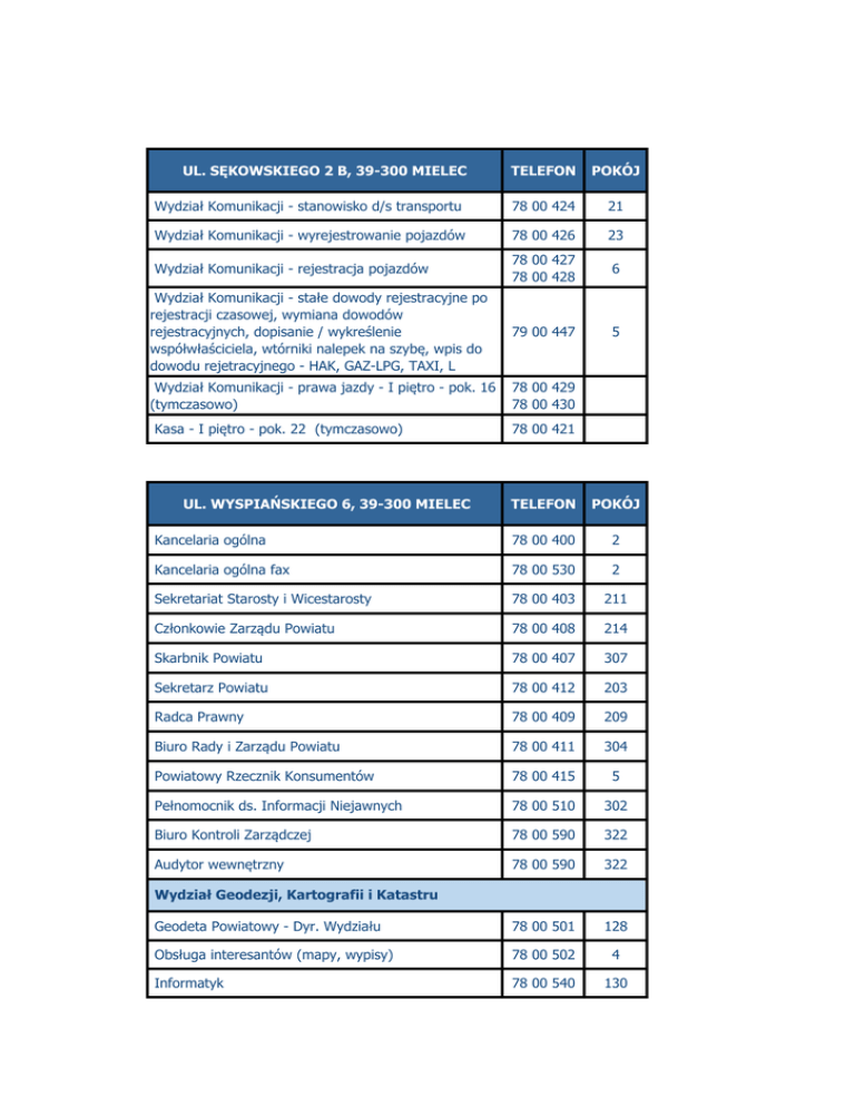UL. SĘKOWSKIEGO 2 B, 39-300 MIELEC TELEFON POKÓJ Wydział Komunikacji - stanowisko d/s transportu 78 00 424 21 Wydział Komunikacji - wyrejestrowanie pojazdów 78 00 426 23 Wydział Komunikacji - rejestracja pojazdów 78 00 427 78 00 428 6 Wydział Komunikacji - stałe dowody rejestracyjne po rejestracji czasowej, wymiana dowodów rejestracyjnych, dopisanie / wykreślenie współwłaściciela, wtórniki nalepek na szybę, wpis do dowodu rejetracyjnego - HAK, GAZ-LPG, TAXI, L 79 00 447 5 Wydział Komunikacji - prawa jazdy - I piętro - pok. 16 78 00 429 (tymczasowo) 78 00 430 Kasa - I piętro - pok. 22 (tymczasowo) UL. WYSPIAŃSKIEGO 6, 39-300 MIELEC 78 00 421 TELEFON POKÓJ Kancelaria ogólna 78 00 400 2 Kancelaria ogólna fax 78 00 530 2 78 00 403 211 78 00 408 214 Skarbnik Powiatu 78 00 407 307 Sekretarz Powiatu 78 00 412 203 Radca Prawny 78 00 409 209 Biuro Rady i Zarządu Powiatu 78 00 411 304 Powiatowy Rzecznik Konsumentów 78 00 415 5 Pełnomocnik ds. Informacji Niejawnych 78 00 510 302 Biuro Kontroli Zarządczej 78 00 590 322 Audytor wewnętrzny 78 00 590 322 Geodeta Powiatowy - Dyr. Wydziału 78 00 501 128 Obsługa interesantów (mapy, wypisy) 78 00 502 4 78 00 540 130 Sekretariat Starosty i Wicestarosty Członkowie Zarządu Powiatu Wydział Geodezji, Kartografii i Katastru Informatyk Powiatowy Ośrodek Dokumentacji Geodezyjnej i Kartograficznej Kierownik 78 00 514 102 Obsługa geodetów 78 00 522 110 Pracownie 78 00 515 78 00 520 103-110 Oddział Geodezji i Katastru - Ewidencja, klasyfikacja gruntów Kierownik 78 00 503 129 Obsługa klasyfikacji gruntów 78 00 504 311 Obsługa ewidencji gruntów i budynków – gmina: Borowa, Czermin, Gawłuszowice, Radomyśl Wielki, Wadowice Górne 78 00 524 112 Obsługa ewidencji gruntów i budynków – gmina: Mielec, Przecław, Padew Narodowa, Tuszów Narodowy 78 00 525 113 Obsługa ewidencji gruntów i budynków – miasto Mielec 78 00 526 114 Kierownik 78 00 508 8 Przyjmowanie i wydawanie projektów 78 00 507 8 Dyrektor 78 00 460 6 Sprawy z terenu obręb Stary Mielec 78 00 463 10 Sprawy z terenu gmina Tuszów Narodowy, gmina Wadowice Górne 78 00 453 10 Sprawy z terenu miasto Mielec - Smoczka 78 00 461 11 Sprawy z terenu miasta i gminy Radomyśl Wielki, gmina Wadowice Górne 78 00 488 11 Sprawy z terenu gmina Mielec, gmina Borowa 78 00 481 12 Sprawy z terenu gmina Gawłuszowice, gmina Czermin 78 00 464 12 Sprawy z terenu miasta i gminy Przecław, gmina Padew Narodowa 78 00 480 13 Sprawy z terenu miasto Mielec - Osiedle 78 00 462 13 Rejestry, dzienniki budowy 78 00 465 14 Oddział Uzgadniania Dokumentacji Projektowej Wydział Architektury i Budownictwa Wydział Funduszy, Inwestycji i Gospodarki Nieruchomościami Dyrektor 78 00 454 318 Fundusze i Inwestycje Fundusze 78 00 483 320 Inwestycje 78 00 466 319 Kierownik Oddziału 78 00 511 316 Gospodarka i zarządzanie Mieniem Powiatu 78 00 455 312 Gospodarka i zarządzanie Mieniem Powiatu 78 00 414 313 Zbywanie, nabywanie, wywłaszczenia, zwroty wywłaszczonych nieruchomości, odszkodowania i udostępnianie nieruchomości Skarbu Państwa 78 00 492 314 Użytkowanie wieczyste gruntów Skarbu Państwa, zezwolenia na wejście w teren i umowy udostępniania nieruchomości Skarbu Państwa dla celów budowlanych, scalenia i wymiana gruntów, ochrona gruntów, zwroty działek dożywotnich i siedliskowych, opiniowanie projektów decyzji o warunkach zabudowy 78 00 512 315 Gospodarka i zarządzanie Mieniem Powiatu 78 00 562 317 78 00 457 216 Oddział Gospodarki Nieruchomościami Wydział Ochrony Środowiska Dyrektor Emisje substancji lub energii do środowiska, 78 00 458 gospodarka odpadami Gosp. wodno-ściekowa, rybactwo, łowiectwo, ochrona 78 00 459 przyrody 217 219 Geologia, ustalanie linii brzegu 78 00 467 218 Wydawanie zaświadczeń dot. lasów 78 00 468 215 78 00 413 204 Główny specjalista ds. zamówień publicznych 78 00 406 202 Zapytania ofertowe do 30.000 Euro 78 00 494 202 Główny księgowy 78 00 420 308 Wydział Finansowy 78 00 418 309 Wydział Finansowy 78 00 456 310 Kasa 78 00 445 PARTER 78 00 435 305 Wydział Administracyjny Kadry Starostwa Wydział Finansowy Biuro Zarządzania Kryzysowego Koordynator Biura - Główny specjalista ds. obrony cywilnej Zarządzanie kryzysowe 78 00 434 305 Biuro Zarządzania Kryzysowego fax 78 00 436 305 Dyżurny PCZK | Tel 78 00 440 305 78 00 493 321 78 00 484 321 A Organizacja pozarządowe 78 00 416 205 Ochrona zdrowia, współpraca z organizacjami pozarządowymi 78 00 548 205 Stowarzyszenia i oświata 78 00 417 206 Kultura, sport i oświata 78 00 549 207 Biuro Promocji i Informacji Promocja i Informacja Asystent Starosty Biuro Edukacji, Zdrowia i Spraw Społecznych Biuro Informatyki Informatycy 78 00 452 78 00 451 335