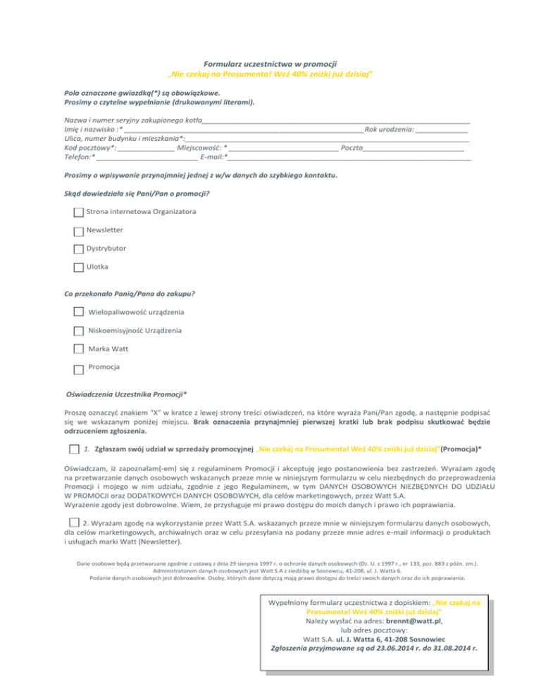 Formularz uczestnictwa w promocji „Nie czekaj na Prosumenta! Weź 40% zniżki już dzisiaj” Pola oznaczone gwiazdką(*) są obowiązkowe. Prosimy o czytelne wypełnianie (drukowanymi literami). Nazwa i numer seryjny zakupionego kotła__________________________________________________________________ Imię i nazwisko :* ___________________________________________________________Rok urodzenia: _____________ Ulica, numer budynku i mieszkania*:______________________________________________________________________ Kod pocztowy*: ______________ Miejscowość: * ___________________________ Poczta_________________________ Telefon:* _________________________ E-mail:*____________________________________________________________ Prosimy o wpisywanie przynajmniej jednej z w/w danych do szybkiego kontaktu. Skąd dowiedziała się Pani/Pan o promocji? Strona internetowa Organizatora Newsletter Dystrybutor Ulotka Co przekonało Panią/Pana do zakupu? Wielopaliwowość urządzenia Niskoemisyjność Urządzenia Marka Watt Promocja Oświadczenia Uczestnika Promocji* Proszę oznaczyć znakiem "X" w kratce z lewej strony treści oświadczeń, na które wyraża Pani/Pan zgodę, a następnie podpisać się we wskazanym poniżej miejscu. Brak oznaczenia przynajmniej pierwszej kratki lub brak podpisu skutkować będzie odrzuceniem zgłoszenia. 1. Zgłaszam swój udział w sprzedaży promocyjnej „Nie czekaj na Prosumenta! Weź 40% zniżki już dzisiaj”(Promocja)* Oświadczam, iż zapoznałam(-em) się z regulaminem Promocji i akceptuję jego postanowienia bez zastrzeżeń. Wyrażam zgodę na przetwarzanie danych osobowych wskazanych przeze mnie w niniejszym formularzu w celu niezbędnych do przeprowadzenia Promocji i mojego w nim udziału, zgodnie z jego Regulaminem, w tym DANYCH OSOBOWYCH NIEZBĘDNYCH DO UDZIAŁU W PROMOCJI oraz DODATKOWYCH DANYCH OSOBOWYCH, dla celów marketingowych, przez Watt S.A. Wyrażenie zgody jest dobrowolne. Wiem, że przysługuje mi prawo dostępu do moich danych i prawo ich poprawiania. 2. Wyrażam zgodę na wykorzystanie przez Watt S.A. wskazanych przeze mnie w niniejszym formularzu danych osobowych, dla celów marketingowych, archiwalnych oraz w celu przesyłania na podany przeze mnie adres e-mail informacji o produktach i usługach marki Watt (Newsletter). Dane osobowe będą przetwarzane zgodnie z ustawą z dnia 29 sierpnia 1997 r. o ochronie danych osobowych (Dz. U. z 1997 r., nr 133, poz. 883 z późn. zm.). Administratorem danych osobowych jest Watt S.A z siedzibą w Sosnowcu, 41-208, ul. J. Watta 6. Podanie danych osobowych jest dobrowolne. Osoby, których dane dotyczą mają prawo dostępu do treści swoich danych oraz do ich poprawiania. Wypełniony formularz uczestnictwa z dopiskiem: „Nie czekaj na Prosumenta! Weź 40% zniżki już dzisiaj” Należy wysłać na adres: [email protected], lub adres pocztowy: Watt S.A. ul. J. Watta 6, 41-208 Sosnowiec Zgłoszenia przyjmowane są od 23.06.2014 r. do 31.08.2014 r.