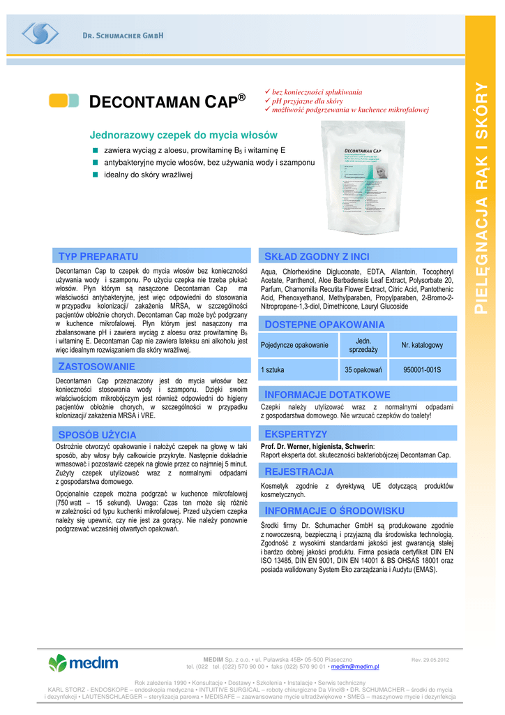 bez konieczności spłukiwania pH przyjazne dla skóry możliwość podgrzewania w kuchence mikrofalowej Jednorazowy czepek do mycia włosów zawiera wyciąg z aloesu, prowitaminę B5 i witaminę E antybakteryjne mycie włosów, bez używania wody i szamponu idealny do skóry wrażliwej TYP PREPARATU SKŁAD ZGODNY Z INCI Decontaman Cap to czepek do mycia włosów bez konieczności używania wody i szamponu. Po użyciu czepka nie trzeba płukać włosów. Płyn którym są nasączone Decontaman Cap ma właściwości antybakteryjne, jest więc odpowiedni do stosowania w przypadku kolonizacji/ zakażenia MRSA, w szczególności pacjentów obłożnie chorych. Decontaman Cap może być podgrzany w kuchence mikrofalowej. Płyn którym jest nasączony ma zbalansowane pH i zawiera wyciąg z aloesu oraz prowitaminę B5 i witaminę E. Decontaman Cap nie zawiera lateksu ani alkoholu jest więc idealnym rozwiązaniem dla skóry wrażliwej. ZASTOSOWANIE Aqua, Chlorhexidine Digluconate, EDTA, Allantoin, Tocopheryl Acetate, Panthenol, Aloe Barbadensis Leaf Extract, Polysorbate 20, Parfum, Chamomilla Recutita Flower Extract, Citric Acid, Pantothenic Acid, Phenoxyethanol, Methylparaben, Propylparaben, 2-Bromo-2Nitropropane-1,3-diol, Dimethicone, Lauryl Glucoside DOSTĘPNE OPAKOWANIA Pojedyncze opakowanie 1 sztuka Decontaman Cap przeznaczony jest do mycia włosów bez konieczności stosowania wody i szamponu. Dzięki swoim właściwościom mikrobójczym jest również odpowiedni do higieny pacjentów obłożnie chorych, w szczególności w przypadku kolonizacji/ zakażenia MRSA i VRE. Jedn. sprzedaży Nr. katalogowy 35 opakowań 950001-001S INFORMACJE DOTATKOWE Czepki należy utylizować wraz z normalnymi odpadami z gospodarstwa domowego. Nie wrzucać czepków do toalety! EKSPERTYZY SPOSÓB UŻYCIA Ostrożnie otworzyć opakowanie i nałożyć czepek na głowę w taki sposób, aby włosy były całkowicie przykryte. Następnie dokładnie wmasować i pozostawić czepek na głowie przez co najmniej 5 minut. Zużyty czepek utylizować wraz z normalnymi odpadami z gospodarstwa domowego. Opcjonalnie czepek można podgrzać w kuchence mikrofalowej (750 watt – 15 sekund). Uwaga: Czas ten może się różnić w zależności od typu kuchenki mikrofalowej. Przed użyciem czepka należy się upewnić, czy nie jest za gorący. Nie należy ponownie podgrzewać wcześniej otwartych opakowań. Prof. Dr. Werner, higienista, Schwerin: Raport eksperta dot. skuteczności bakteriobójczej Decontaman Cap. REJESTRACJA Kosmetyk zgodnie z kosmetycznych. dyrektywą UE dotyczącą produktów INFORMACJE O ŚRODOWISKU Środki firmy Dr. Schumacher GmbH są produkowane zgodnie z nowoczesną, bezpieczną i przyjazną dla środowiska technologią. Zgodność z wysokimi standardami jakości jest gwarancją stałej i bardzo dobrej jakości produktu. Firma posiada certyfikat DIN EN ISO 13485, DIN EN 9001, DIN EN 14001 & BS OHSAS 18001 oraz posiada walidowany System Eko zarządzania i Audytu (EMAS). MEDIM Sp. z o.o. • ul. Puławska 45B• 05-500 Piaseczno tel. (022 tel. (022) 570 90 00 • faks (022) 570 90 01 • [email protected] Rev. 29.05.2012 Rok założenia 1990 • Konsultacje • Dostawy • Szkolenia • Instalacje • Serwis techniczny KARL STORZ - ENDOSKOPE – endoskopia medyczna • INTUITIVE SURGICAL – roboty chirurgiczne Da Vinci® • DR. SCHUMACHER – środki do mycia i dezynfekcji • LAUTENSCHLAEGER – sterylizacja parowa • MEDISAFE – zaawansowane mycie ultradźwiękowe • SMEG – maszynowe mycie i dezynfekcja P IELĘGNACJA RĄK I SKÓRY DECONTAMAN CAP ®