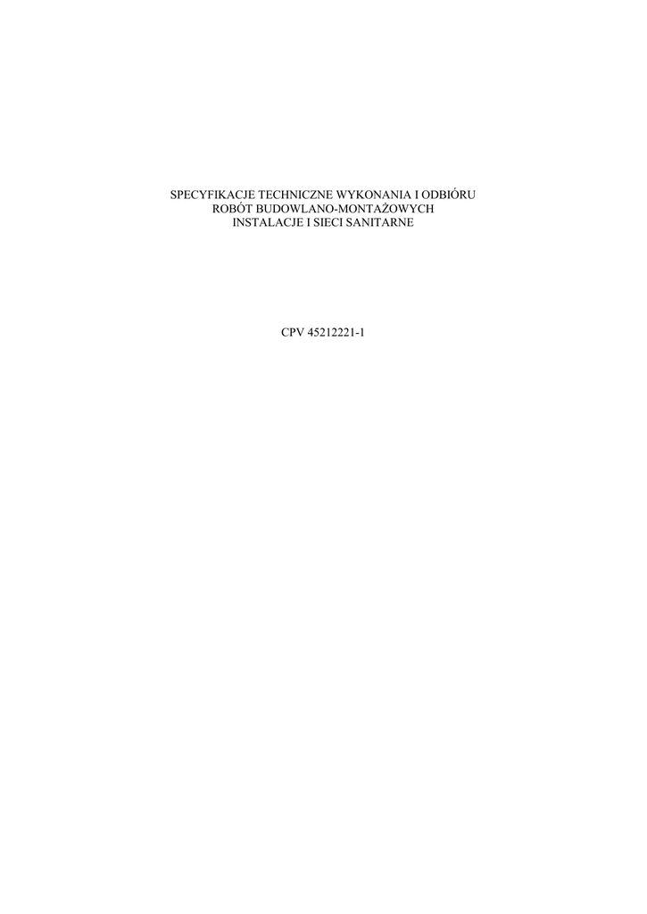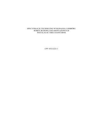 SPECYFIKACJE TECHNICZNE WYKONANIA I ODBIÓRU ROBÓT BUDOWLANO-MONTAŻOWYCH INSTALACJE I SIECI SANITARNE CPV 45212221-1 S.0 CPV 45212221-1 OGÓLNE WARUNKI TECHNICZNE WYKONANIA O ODBIORU ROBÓT INSTALACYJNYCH S.0.1. WSTEP 1. Przedmiot Specyfikacji Technicznych (ST) Przedmiotem niniejszych Specyfikacji Technicznych (ST) sa wymagania techniczne wykonania i odbioru robót przyłączy zewnętrznych i wewnętrznych instalacji sanitarnych związanych z robotami budowlanymi ADAPTACJA PROJEKTU TYPOWEGO "MOJE BOISKO ORLIK 2012" W STRZYBODZE NR EWID 194 OBRĘB 30 GMINA NOWY KAWĘCZYN 2. Zakres stosowania ST Specyfikacje Techniczne (ST) dla odbioru i wykonania instalacji sanitarnych stanowią zbiór wymagań technicznych i organizacyjnych dotyczących procesu realizacji i kontroli i jakości robót. Są one podstawa, której spełnienie warunkuje uzyskanie odpowiednich cech eksploatacyjnych budowli. * ST uwzględniają wymagania Zamawiającego i możliwość Wykonawcy w krajowych warunkach wykonawstwa robót. * ST opracowane są w oparciu o obowiązujące normy, normatywy i wytyczne PN 92/B-l0735 Kanalizacja. Przewody kanalizacyjne. Wymagania i badania przy odbiorze. PN-92/B-10729 Kanalizacja. Studzienki kanalizacyjne. PN-92/B-1707 Instalacje kanalizacyjne. Wymagania w projektowaniu. PN-EN 476:2001 Wymagania ogólne dotyczące elementów stosowanych w systemach kanalizacji grawitacyjnej. PN-EN 1401-1:1995 Systemy przewodowe z tworzyw sztucznych. Podziemne bezciśnieniowe systemy przewodowe z niezmiękczonego polichlorku winylu (PVC-U) do odwadniania i kanalizacji. Wymagania dotyczące rur, kształtek i systemu. PN-EN 1610:2002 Budowa i badania przewodów kanalizacyjnych. PN-B-10736:1999 Roboty ziemne. Wykopy otwarte dla przewodów wodociągowych i kanalizacyjnych. Warunki techniczne wykonania. PN-EN 752-1:2000 Zewnętrzne systemy kanalizacyjne. Pojęcia ogólne i definicje. PN-80/B-01800 Antykorozyjne zabezpieczenia w budownictwie. Konstrukcje betonowe i żelbetowe. Klasyfikacja i określenia. PN-74/B-24620 Lepik asfaltowy stosowany na zimno. PN-83/H-02651 Armatura i rurociągi. Średnice nominalne. PN-89/H-02650 Armatura i rurociągi. Ciśnienia i temperatury. PN-70/N/01270.01 Wytyczne znakowania rurociągów. Postanowienia ogólne. PN-70/N01270.03 Wytyczne znakowania rurociągów. Kod barw rozpoznawczych dla przesyłanych czynników. PN-70/N-01270.04 Wytyczne znakowania rurociągów. Podstawowe wymagania. - Rozporządzenie Ministra Infrastruktury z dnia 03.07.2003r. w sprawie szczegółowego zakresu i formy projektu budowlanego /Dz.U. Nr. 120 , poz.1133/ Wszelkie stosowane materiały powinny być nowe, odpowiadać polskim normom oraz posiadać dopuszczenie do stosowania w budownictwie jak również co najmniej jeden z niżej wymienionych dokumentów: * atest * certyfikat * aprobatę techniczna ITB * certyfikat zgodności. 3. Zakres Robót objętych ST Ustalenia zawarte w niniejsze Specyfikacji Technicznej obejmują wymagania ogólne wspólne dla robót objętych niżej wymienionymi specyfikacjami: * S.0. - Ogólne warunki techniczne wykonania o odbioru robót instalacyjnych * S.1. - Odwodnienie projektowanych obiektów sportowych * S.2. - Zabezpieczenia antykorozyjne 4. Definicje i pojęcia Użyte w ST, wymienione poniżej definicje i pojęcia, należy rozumieć następująco: aprobata techniczna - pozytywna ocena techniczna wyrobu, stwierdzająca jego przydatność do stosowania w budownictwie, wydana przez upoważniona do tego jednostkę; certyfikacja zgodności - działanie trzeciej strony (jednostki niezależnej od dostawcy i odbiorcy) wykazujące, że zapewniono odpowiedni stopień zaufania, i należycie zidentyfikowany wyrób, proces lub usługa są zgodne z określona norma lub z właściwymi przepisami prawnymi deklaracja zgodności - oświadczenie dostawcy, stwierdzające na jego wyłączną odpowiedzialność, że wyrób, proces lub usługa sa zgodne z norma lub aprobata techniczna; dokumentacja powykonawcza - dokumentacja techniczna wraz z naniesionymi zmianami i uzupełnieniami w trakcie realizacji robót (budowy); Dziennik Budowy - opatrzony pieczecią Zamawiającego zeszyt z ponumerowanymi stronami, służący do notowania wydarzeń zaistniałych w czasie wykonywania zadania budowlanego, rejestrowania dokonywanych odbiorów Robót, przekazywania poleceń i innej korespondencji technicznej pomiędzy Inżynierem, Wykonawca i Projektantem. kanał sciekowy - kanał przeznaczony do odprowadzenia ścieków gospodarczo-bytowych i przemysłowych; Kierownik Budowy - osoba wyznaczona przez Wykonawcę, upoważniona do kierowania Robotami i do występowania w jego imieniu w sprawach realizacji kontraktu. Księga Obmiarów - akceptowany przez Inspektora Nadzoru zeszyt z ponumerowanymi stronami służący do wpisywania przez Wykonawcę obmiaru wykonywanych Robót w formie wyliczeń, szkiców i ewentualnych dodatkowych załączników. Wpisy w Księdze Obmiarów podlegają potwierdzeniu przez Inspektora Nadzoru. Materiały - wszelkie tworzywa niezbędne do wykonania robót, zgodne z dokumentacja projektowa i specyfikacjami technicznymi, zaakceptowane przez Inżyniera. polecenie Inspektora Nadzoru - wszelkie polecenia przekazywane Wykonawcy przez Inspektora Nadzoru w formie pisemnej, dotyczące sposobu realizacji Robót lub innych spraw związanych z prowadzeniem Budowy. projektant - uprawniona osoba prawna lub fizyczna będąca autorem Dokumentacji Projektowej; rysunki -część Dokumentacji Projektowej, która wskazuje lokalizacje, charakterystykę i wymiary obiektu będącego przedmiotem Robót. siec kanalizacyjna deszczowa; kanalizacja deszczowa - siec kanalizacyjna zewnętrzna przeznaczona do odprowadzania ścieków opadowych; wylot scieków - obiekt na końcu kanału odprowadzającego ścieki do odbiornika; 5. Specyfikacje techniczne podane w następnych rozdziałach, dotyczące poszczególnych rodzajów instalacji sanitarnych należy stosować łącznie z warunkami ogólnymi podanymi w niniejsz