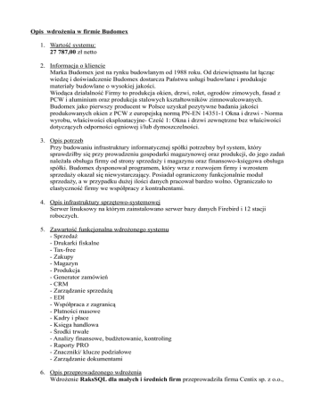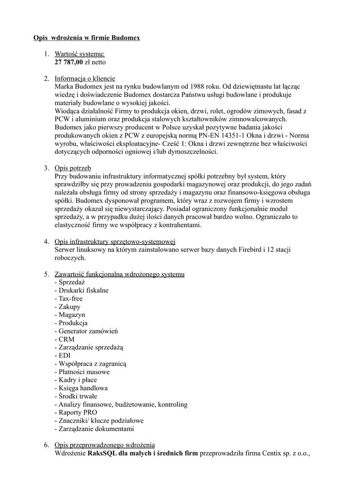 Opis wdrożenia w firmie Budomex 1. Wartość systemu: 27 787,00 zł netto 2. Informacja o kliencie Marka Budomex jest na rynku budowlanym od 1988 roku. Od dziewiętnastu lat łącząc wiedzę i doświadczenie Budomex dostarcza Państwu usługi budowlane i produkuje materiały budowlane o wysokiej jakości. Wiodąca działalność Firmy to produkcja okien, drzwi, rolet, ogrodów zimowych, fasad z PCW i aluminium oraz produkcja stalowych kształtowników zimnowalcowanych. Budomex jako pierwszy producent w Polsce uzyskał pozytywne badania jakości produkowanych okien z PCW z europejską normą PN-EN 14351-1 Okna i drzwi - Norma wyrobu, właściwości eksploatacyjne- Cześć 1: Okna i drzwi zewnętrzne bez właściwości dotyczących odporności ogniowej i/lub dymoszczelności. 3. Opis potrzeb Przy budowaniu infrastruktury informatycznej spółki potrzebny był system, który sprawdziłby się przy prowadzeniu gospodarki magazynowej oraz produkcji, do jego zadań należała obsługa firmy od strony sprzedaży i magazynu oraz finansowo-księgowa obsługa spółki. Budomex dysponował programem, który wraz z rozwojem firmy i wzrostem sprzedaży okazał się niewystarczający. Posiadał ograniczony funkcjonalnie moduł sprzedaży, a w przypadku dużej ilości danych pracował bardzo wolno. Ograniczało to elastyczność firmy we współpracy z kontrahentami. 4. Opis infrastruktury sprzętowo-systemowej Serwer linuksowy na którym zainstalowano serwer bazy danych Firebird i 12 stacji roboczych. 5. Zawartość funkcjonalna wdrożonego systemu - Sprzedaż - Drukarki fiskalne - Tax-free - Zakupy - Magazyn - Produkcja - Generator zamówień - CRM - Zarządzanie sprzedażą - EDI - Współpraca z zagranicą - Płatności masowe - Kadry i płace - Księga handlowa - Środki trwałe - Analizy finansowe, budżetowanie, kontroling - Raporty PRO - Znaczniki/ klucze podziałowe - Zarządzanie dokumentami 6. Opis przeprowadzonego wdrożenia Wdrożenie RaksSQL dla małych i średnich firm przeprowadziła firma Centix sp. z o.o., która jest dystrybutorem firmy MSM i ma doświadczenie we wdrażaniu programów w dużych przedsiębiorstwach. We wdrożeniu wziął udział także wewnętrzny dział IT. Kluczowym elementem było sprzegniecie programu Stolcad (program służy do projektowania okien i daje zapotrzebowanie do magazynu na elementy składowe wytworzonego produktu) z systemem magazynowym RaksSQL. Operacja ta zdecydowanie zmniejszyła zakres prac związanych z wprowadzeniem danych, jak również umożliwiła bezproblemową kontynuację wszelkich. Dodatkowo przy wdrożeniu zaprojektowane zostały liczne zestawienia magazynowe, sprzedażowe oraz księgowe. 7. Korzyści z wdrożenie Wdrożenie RaksSQL dla małych i średnich firm znacznie przyspieszyło pracę wszystkich działów firmy. Poczawszy od działu sprzedaży, gdzie system poprawia pracę wielostanowiskową co ma przełożenie na bardziej efektywną pracę z systemem. Poprzez dział księgowości, gdzie udoskonalono system raportowania i analiz. Skończywszy na kadrach, gdzie dane płacowe mogą być wprowadzane zbiorczo, a obliczenia wypłaty system wykonuje w bardzo krótkim czasie.