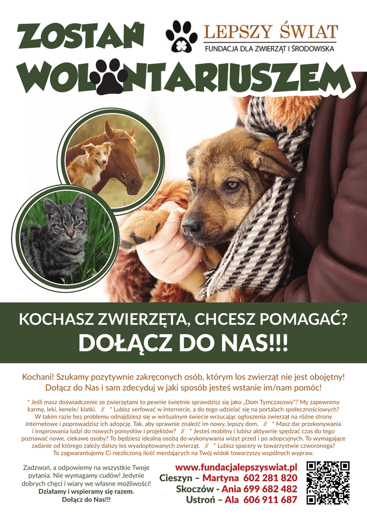 KOCHASZ ZWIERZĘTA, CHCESZ POMAGAĆ? DOŁĄCZ DO NAS!!! Kochani! Szukamy pozytywnie zakręconych osób, którym los zwierząt nie jest obojętny! Dołącz do Nas i sam zdecyduj w jaki sposób jesteś wstanie im/nam pomóc! * Jeśli masz doświadczenie ze zwierzętami to pewnie świetnie sprawdzisz się jako „Dom Tymczasowy”? My zapewnimy karmę, leki, kenele/ klatki. // * Lubisz serfować w Internecie, a do tego udzielać się na portalach społecznościowych? W takim razie bez problemu odnajdziesz się w wirtualnym świecie wrzucając ogłoszenia zwierząt na różne strony internetowe i poprowadzisz ich adopcję. Tak, aby sprawnie znaleźć im nowy, lepszy dom. // * Masz dar przekonywania i inspirowania ludzi do nowych pomysłów i projektów? // * Jesteś mobilny i lubisz aktywnie spędzać czas do tego poznawać nowe, ciekawe osoby? To będziesz idealną osobą do wykonywania wizyt przed i po adopcyjnych. To wymagające zadanie od którego zależy dalszy los wyadoptowanych zwierząt. // * Lubisz spacery w towarzystwie czworonoga? To zagwarantujemy Ci niezliczoną ilość merdających na Twój widok towarzyszy wspólnych wypraw. Zadzwoń, a odpowiemy na wszystkie Twoje pytania. Nie wymagamy cudów! Jedynie dobrych chęci i wiary we własne możliwości! Działamy i wspieramy się razem. Dołącz do Nas!!! www.fundacjalepszyswiat.pl Cieszyn – Martyna 602 281 820 Skoczów - Ania 699 682 482 Ustroń – Ala 606 911 687
