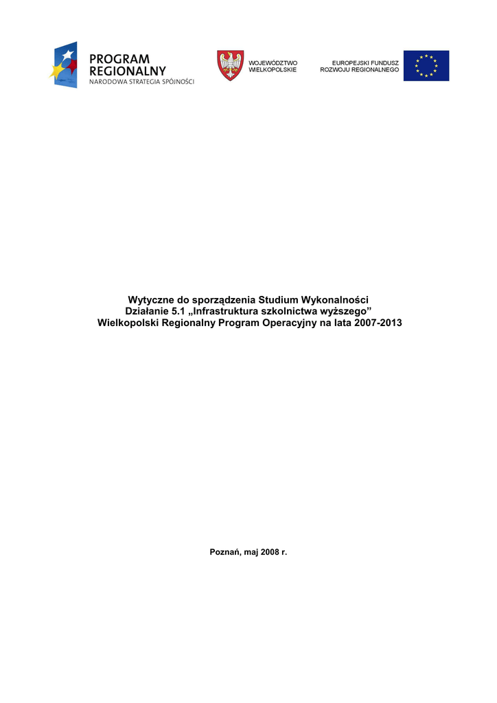 Wytyczne do sporządzenia Studium Wykonalności Działanie 5.1 „Infrastruktura szkolnictwa wyŜszego” Wielkopolski Regionalny Program Operacyjny na lata 2007-2013 Poznań, maj 2008 r. Spis treści: I. Wnioski ze Studium Wykonalności II. Charakterystyka projektu III. Opis bieŜącej sytuacji Beneficjenta oraz analiza otoczenia projektu IV. Logika interwencji V. Analiza instytucjonalna i prawna inwestycji VI. Analiza techniczna / technologiczna VII. Analiza specyficzna dla sektora VIII. Analiza finansowa i ekonomiczna IX. Analiza oddziaływania na środowisko X. Zgodność z politykami i prawem wspólnotowym XI. Promocja i informacja XII. Załączniki do Studium Wykonalności XIII. Oświadczenie Wnioskodawcy 2 Dla kaŜdego projektu inwestycyjnego Wnioskodawca ubiegający się o dofinansowanie z funduszy Unii Europejskiej powinien przedstawić Studium Wykonalności, umoŜliwiające dokonanie oceny projektu. Niniejsze wytyczne są skierowane do wszystkich podmiotów ubiegających się o wsparcie w ramach Wielkopolskiego Regionalnego Programu Operacyjnego na lata 2007- 2013 w ramach Działania 5.1 „Infrastruktura szkolnictwa wyŜszego”. Przygotowując Studium Wykonalności naleŜy mieć na uwadze następujące zasady: 1. Dane przedstawione w Studium Wykonalności muszą być zgodne z danymi zawartymi we wniosku o dofinansowanie. 2. Studium musi być aktualne na dzień składania wniosku. 3. Studium Wykonalności musi być zgodne z: • Wielkopolskim Regionalnym Programem Operacyjnym na lata 2007-2013, • Szczegółowym opisem priorytetów Wielkopolskiego Regionalnego Programu Operacyjnego na lata 2007-2013, • Wytycznymi Instytucji Zarządzającej Wielkopolskim Regionalnym Programem Operacyjnym na lata 2007-2013 w sprawie kwalifikowalności kosztów w ramach Priorytetu I – działanie 1.7 oraz Priorytetów II-VI, • Przewodnikiem – Analiza kosztów i korzyści projektów inwestycyjnych (Fundusz Strukturalny - EFRR, Fundusz Spójności i ISPA), Komisja Europejska, • Wytycznymi dotyczącymi metodologii przeprowadzania analizy kosztów i korzyści. Nowy okres programowania 2007-2013. Dokument roboczy nr 4, Komisja Europejska, Dyrekcja Generalna ds. Polityki Regionalnej, 08/2006, • Wytycznymi w zakresie wybranych zagadnień związanych z przygotowaniem projektów inwestycyjnych, w tym projektów generujących dochód, opracowanymi przez Ministerstwo Rozwoju Regionalnego. 4. Analizę naleŜy przeprowadzać w odniesieniu do istniejącego stanu, a nie stanu „0”, czyli metodą przyrostu. Przedstawić naleŜy wariant bezinwestycyjny, wariant uwzględniający realizację wnioskowanego projektu w połączeniu ze stanem obecnym oraz projekt jako ujęcie róŜnicowe (wnioskowany projekt = wariant inwestycyjny – wariant bezinwestycyjny). W przypadku gdy stan istniejący jest toŜsamy ze stanem zerowym lub istnieje moŜliwość jednoznacznego oddzielenia przepływów finansowych z inwestycji od ogólnych przepływów Beneficjenta, analiza moŜe być prowadzona z punktu widzenia projektu (szczegóły w dalszej części) 5. NaleŜy wskazać wszystkie źródła pozyskania danych (zarówno liczbowych, jak i nieliczbowych) oraz okres, którego dotyczą. Dane muszą być wiarygodne i realne. Dane statystyczne powinny być nie starsze niŜ 2 lata, natomiast źródła danych finansowych (np. kosztorysy) nie mogą być starsze niŜ 1 rok. Jeśli w momencie składania Wniosku o dofinansowanie projekt jest w trakcie realizacji (zakończony) – zostały zlecone działania zakładane do realizacji w ramach projektu – do analizy muszą zostać przyjęte wartości rzeczywiste wynikające z zaakceptowanych warunków/podpisanych umów. Wszyscy Beneficjenci zobowiązani są do sporządzenia studiów wykonalności w formie tabelarycznej, zgodnie z przedstawionym schematem. Sporządzając Studium Wykonalności naleŜy stosować czcionkę Arial, rozmiar 10, z pojedynczymi odstępami pomiędzy wierszami. 3 I. Wnioski ze Studium Wykonalności Krótkie wprowadzenie do projektu, które jest jednocześnie streszczeniem całego opracowania i przedstawieniem wniosków z przeprowadzanych w całym studium analiz. Wstęp jest więc elementem wtórnym, którego sporządzanie naleŜy rozpocząć po przygotowaniu całego Studium Wykonalności. Obligatoryjne jest wypełnienie poniŜszej tabeli Wyszczególnienie 1. 8. Nazwa Programu Operacyjnego Numer i nazwa Priorytetu w ramach Programu Operacyjnego Numer i nazwa Działania w ramach Priorytetu Programu Operacyjnego Numer Schematu w ramach Działania (jeśli dotyczy) Nazwa Wnioskodawcy Tytuł projektu Daty rozpoczęcia i zakończenia realizacji projektu Krótki opis przedmiotu projektu oraz jego odbiorców. 9. Cele projektu 2. 3. 4. 5. 6. 7. 10. Skwantyfikowane wskaźniki rezultatu i produktu 11. Całkowity koszt projektu z podziałem na koszty kwalifikowalne i niekwalifikowalne Okres odniesienia (referencyjny) stosowany w analizie finansowej (w latach) Finansowa stopa dyskontowa (w %) Łączny koszt inwestycji (PLN) Wartość rezydualna – liczona metodą księgową (PLN) Luka w finansowaniu (w %) Rzeczywisty poziom dofinansowania (w %) Kwota rzeczywistego poziomu dofinansowania (PLN) Wnioski z analizy finansowej i ekonomicznej (łącznie z podaniem podstawowych wskaźników) 12. 13. 14. 15. 16. 17. 18. 19. 4 II. Charakterystyka projektu Pełna nazwa Wnioskodawcy (lidera wiodącego projektu) Adres Wnioskodawcy Numer telefonu Numer faksu Adres e-mail Adres do korespondencji Numer NIP Numer REGON Status prawny Dane osoby wyznaczonej do kontaktu Krótka charakterystyka działalności Wnioskodawcy (w przypadku partnerstwa projektowego wszystkich zaangaŜowanych podmiotów) Doświadczenie Beneficjenta we wdraŜaniu projektów współfinansowanych ze środków europejskich NaleŜy podać w skrócie m.in.: program w ramach którego realizowane było/jest zadanie, tytuł projektu, wartość, podmioty zaangaŜowane, stan realizacji inwestycji (czy projekt jest przed podpi