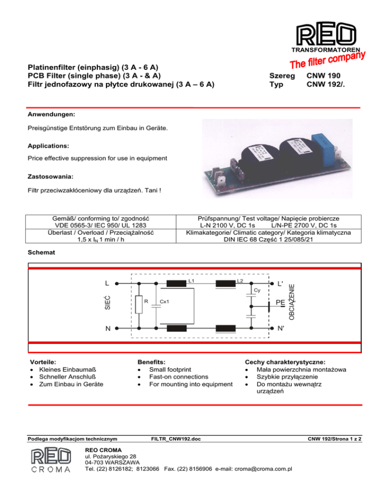 TRANSFORMATOREN Platinenfilter (einphasig) (3 A - 6 A) PCB Filter (single phase) (3 A - & A) Filtr jednofazowy na płytce drukowanej (3 A – 6 A) Szereg Typ CNW 190 CNW 192/. Anwendungen: Preisgünstige Entstörung zum Einbau in Geräte. Applications: Price effective suppression for use in equipment Zastosowania: Filtr przeciwzakłóceniowy dla urządzeń. Tani ! Gemäß/ conforming to/ zgodność VDE 0565-3/ IEC 950/ UL 1283 Überlast / Overload / Przeciążalność 1,5 x IN 1 min / h Prüfspannung/ Test voltage/ Napięcie probiercze L-N 2100 V, DC 1s L/N-PE 2700 V, DC 1s Klimakategorie/ Climatic category/ Kategoria klimatyczna DIN IEC 68 Część 1 25/085/21 L1 L L2 L' SIEĆ Cy R Cx1 N' N Vorteile: • Kleines Einbaumaß • Schneller Anschluß • Zum Einbau in Geräte Podlega modyfikacjom technicznym PE OBCIĄŻENIE Schemat Benefits: • Small footprint • Fast-on connections • For mounting into equipment Cechy charakterystyczne: • Mała powierzchnia montażowa • Szybkie przyłączenie • Do montażu wewnątrz urządzeń FILTR_CNW192.doc REO CROMA ul. Pożaryskiego 28 04-703 WARSZAWA Tel. (22) 8126182; 8123066 Fax. (22) 8156906 e-mail: [email protected] CNW 192/Strona 1 z 2 TRANSFORMATOREN Technische Daten • Technical data • Dane techniczne Typ Nennspannung Rated voltage Napięcie znamionowe [V] Nennstrom Rated current Prąd znamionowy [A] Anschluß Connection Przyłączenie 250 250 3 6 Flachstecker / Fast-on/ konektory Flachstecker / Fast-on/konektory CNW 192/3 CNW 192/6 Frequenz: 50/60 Hz Frequency: 50/60 Hz Durch einen EMV günstigen Einbau kann die Filterwirkung im hohen Frequenzbereich verbessert werden. By using an EMC favorable construction, the filtering operation is improved at higher frequencies. 1. Ein Metallwinkel als Abschirmung zwischen der Elektronik und dem Filter. 1. Zwei der Befestigungen können über Metallabos flächig mit der Erde verbunden werden. 2. 2. Angled metal serves as a screen between the electronics and filter. A bonding to earth is made by fixing, using metal pillars. Dzięki konstrukcji zgodnej z zaleceniami EMC poprawia się filtracja wyższych częstotliwości. 1. Metalowa kształtka stosowana jest jako ekran między filtrem i układem elektronicznym Częstotliwość: 50/60 Hz CNW 192/. Schirm Elektronik 2. Połączenie z potencjałem ziemi uzyskiwane jest poprzez zastosowanie metalowych słupków Maßbild • Dimension Drawing • Wymiary Podlega modyfikacjom technicznym FILTR_CNW192.doc CNW 192/Strona 2 z 2