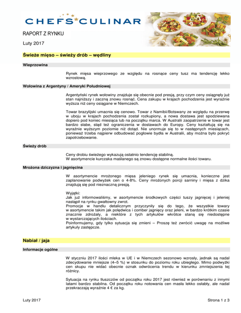RAPORT Z RYNKU Luty 2017 Świeże mięso – świeży drób – wędliny Wieprzowina Rynek mięsa wieprzowego ze względu na rosnące ceny tusz ma tendencję lekko wzrostową. Wołowina z Argentyny / Ameryki Południowej Argentyński rynek wołowiny znajduje się obecnie pod presją, przy czym ceny osiągnęły już stan najniższy i zaczną znowu rosnąć. Cena zakupu w krajach pochodzenia jest wyraźnie wyższa niż ceny osiągane w Niemczech. Towar brazylijski umacnia się cenowo. Towar z Namibii/Botswany ze względu na przerwę w uboju w krajach pochodzenia został rozkupiony, a nowa dostawa jest spodziewana dopiero pod koniec miesiąca lub na początku marca. W Australii zaopatrzenie w towar jest bardzo słabe, stąd też ograniczenia w dostawach do Europy. Ceny kształtują się na wyraźnie wyższym poziomie niż dotąd. Nie unormuje się to w następnych miesiącach, ponieważ trzeba najpierw odbudować pogłowie bydła w Australii, aby można było pokryć zapotrzebowanie. Świeży drób Ceny drobiu świeżego wykazują ostatnio tendencję stabilną. W asortymencie kurczaka maślanego są znowu dostępne normalne ilości towaru. Mrożona dziczyzna i jagnięcina W asortymencie mrożonego mięsa jeleniego rynek się umacnia, konieczne jest zaplanowanie podwyżek cen o 4-8%. Ceny mrożonych porcji sarniny i mięsa z dzika znajdują się pod nieznaczną presją. Wyjątki: Jak już informowaliśmy, w asortymencie środkowych części tuszy jagnięcej i jeleniej nastąpił na rynku gwałtowny zwrot. Promocje w handlu detalicznym przyczyniły się do tego, że wszystkie towary w asortymencie takim jak polędwica i comber jagnięcy oraz jeleni, w bardzo krótkim czasie znacznie zdrożały, a niektóre z tych artykułów wkrótce staną się niedostępne w wystarczających ilościach. Poinformujemy, gdy tylko sytuacja się zmieni – Proszę też zwrócić uwagę na możliwe artykuły zastępcze. Nabiał / jaja Informacje ogólne W styczniu 2017 ilości mleka w UE i w Niemczech sezonowo wzrosły, jednak są nadal zdecydowanie mniejsze (4–5 %) w stosunku do poziomu roku ubiegłego. Mimo podwyżki cen skupu nie widać obecnie oznak odwrócenia trendu w kierunku zmniejszenia tej różnicy. Sytuacja na rynku tłuszczów od początku roku 2017 jest również w porównaniu z innymi latami bardzo stabilna. Od początku roku notowania cen masła lekko osłabły, ale nadal przekraczają wyraźnie 4 € za kg. Luty 2017 Strona 1 z 3 RAPORT Z RYNKU Luty 2017 Masło Umowy trwają jeszcze do końca lutego. W marcu oczekuje się lekkiego odprężenia sytuacji cenowej. Sery Ogólna sytuacja nie zmieniła się w porównaniu z ubiegłym miesiącem. Rynek wewnętrzny w drugiej połowie miesiąca nieco się ożywił wskutek lekkiego wzrostu zakupów dla handlu detalicznego. Silniejsze impulsy napłynęły jednak spoza UE, gdzie nadal niski kurs euro przyczynia się do wysokiej konkurencyjności towarów z Unii na rynku światowym. W pojedynczych przypadkach mimo stabilnej sytuacji rynkowej doszło do obniżek cen, zwłaszcza towaru z Holandii. My również mamy w perspektywie negocjacje z niemieckimi dostawcami, informacje podamy wkrótce. Jaja Ptasia grypa odciska wyraźne piętno na sytuacji rynkowej. W Niemczech i w innych krajach europejskich zarządzono trzymanie w zamknięciu niosek z wolnego wybiegu. Oznacza to, że kury nie mogą wychodzić na zewnątrz, aby nie zarazić się przez kontakt z odchodami dzikiego ptactwa. Wskutek tego od 6 tygodnia roku z powodu siły wyższej nie będą dostępne jaja z wolnego wybiegu. Wobec ich wycofania z rynku zostaną zastąpione przez jaja z chowu ściółkowego. Nie można przewidzieć, jak długo potrwa ta sytuacja. Ważna jest otwarta komunikacja z klientami, aby poznali obecny stan rzeczy, co pozwoli uniknąć nieporozumień. Sytuację wyjaśnia poniższe stanowisko niemieckiego związku hodowców drobiu Zentralverband der Deutschen Geflügelwirtschaft e.V. : Wpływ ptasiej grypy na podaż jaj z wolnego wybiegu Szanowni Państwo, od połowy listopada 2016 wiele mówi się o ptasiej grypie, zwanej inaczej influenza ptaków. Jest to choroba zwierzęca o poważnie zwiększającej się zachorowalności, wywoływana przez wirusy grypy typu H5N8 i H5N5, rozpowszechnione wśród populacji dzikiego ptactwa. Najpilniejszym zadaniem dla wszystkich jest przeciwdziałanie przenoszeniu się infekcji na stada drobiu hodowlanego. Niemiecka gospodarka hodowlana zobowiązuje się do konsekwentnego przestrzegania środków bezpieczeństwa biologicznego. Należą do nich różne stosowane wewnętrznie środki higieny zakładowej i osobistej, takie jak zmiana odzieży i butów przy wejściu do kurników oraz ograniczenie wchodzenia do kurników do bezwzględnie koniecznego minimum. Jednym z środków zapobiegawczych uznanym przez specjalistów i zalecanym w aktualnym przebiegu choroby jest administracyjne zarządzenie trzymania drobiu w zamknięciu. Oznacza to, że na czas określony lub nieokreślony należy umieścić drób w kurnikach lub zabezpieczonych pomieszczeniach, aby uniemożliwić kontakt z dzikim ptactwem i ich wydzielinami. Ten środek bezpieczeństwa biologicznego nie jest działaniem ograniczonym do terytorium Niemiec, trzymanie drobiu w kurnikach przy rozszerzaniu się zasięgu ptasiej grypy jest praktykowane w całej Europie i na świecie. Nawet jeśli nie ma ogólnopaństwowego obowiązku na podstawie rozporządzenia Federalnego Ministerstwa Wyżywienia i Rolnictwa, obowiązek trzymania drobiu w zamknięciu obejmuje prawie cały obszar Niemiec na podstawie regionalnych zarządzeń ogłaszanych przez władze krajów związkowych lub komunalne służby weterynaryjne. Luty 2017 Strona 2 z 3 RAPORT Z RYNKU Luty 2017 Ze względu na długotrwały obowiązek przetrzymywania drobiu w zamknięciu zaistniała dla hodowców niosek bardzo trudna sytuacja w związku ze sprzedażą jaj określanych jako „jaja z wolnego wybiegu”. Stosowane w całej Europie normy unij