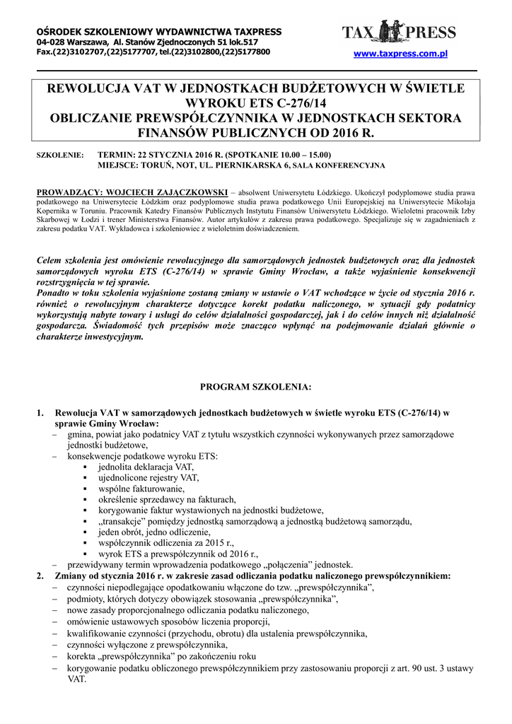 OŚRODEK SZKOLENIOWY WYDAWNICTWA TAXPRESS 04-028 Warszawa, Al. Stanów Zjednoczonych 51 lok.517 Fax.(22)3102707,(22)5177707, tel.(22)3102800,(22)5177800 www.taxpress.com.pl REWOLUCJA VAT W JEDNOSTKACH BUDŻETOWYCH W ŚWIETLE WYROKU ETS C-276/14 OBLICZANIE PREWSPÓŁCZYNNIKA W JEDNOSTKACH SEKTORA FINANSÓW PUBLICZNYCH OD 2016 R. SZKOLENIE: TERMIN: 22 STYCZNIA 2016 R. (SPOTKANIE 10.00 – 15.00) MIEJSCE: TORUŃ, NOT, UL. PIERNIKARSKA 6, SALA KONFERENCYJNA PROWADZĄCY: WOJCIECH ZAJĄCZKOWSKI – absolwent Uniwersytetu Łódzkiego. Ukończył podyplomowe studia prawa podatkowego na Uniwersytecie Łódzkim oraz podyplomowe studia prawa podatkowego Unii Europejskiej na Uniwersytecie Mikołaja Kopernika w Toruniu. Pracownik Katedry Finansów Publicznych Instytutu Finansów Uniwersytetu Łódzkiego. Wieloletni pracownik Izby Skarbowej w Łodzi i trener Ministerstwa Finansów. Autor artykułów z zakresu prawa podatkowego. Specjalizuje się w zagadnieniach z zakresu podatku VAT. Wykładowca i szkoleniowiec z wieloletnim doświadczeniem. Celem szkolenia jest omówienie rewolucyjnego dla samorządowych jednostek budżetowych oraz dla jednostek samorządowych wyroku ETS (C-276/14) w sprawie Gminy Wrocław, a także wyjaśnienie konsekwencji rozstrzygnięcia w tej sprawie. Ponadto w toku szkolenia wyjaśnione zostaną zmiany w ustawie o VAT wchodzące w życie od stycznia 2016 r. również o rewolucyjnym charakterze dotyczące korekt podatku naliczonego, w sytuacji gdy podatnicy wykorzystują nabyte towary i usługi do celów działalności gospodarczej, jak i do celów innych niż działalność gospodarcza. Świadomość tych przepisów może znacząco wpłynąć na podejmowanie działań głównie o charakterze inwestycyjnym. PROGRAM SZKOLENIA: 1. Rewolucja VAT w samorządowych jednostkach budżetowych w świetle wyroku ETS (C-276/14) w sprawie Gminy Wrocław: gmina, powiat jako podatnicy VAT z tytułu wszystkich czynności wykonywanych przez samorządowe jednostki budżetowe, konsekwencje podatkowe wyroku ETS: jednolita deklaracja VAT, ujednolicone rejestry VAT, wspólne fakturowanie, określenie sprzedawcy na fakturach, korygowanie faktur wystawionych na jednostki budżetowe, „transakcje” pomiędzy jednostką samorządową a jednostką budżetową samorządu, jeden obrót, jedno odliczenie, współczynnik odliczenia za 2015 r., wyrok ETS a prewspółczynnik od 2016 r., przewidywany termin wprowadzenia podatkowego „połączenia” jednostek. 2. Zmiany od stycznia 2016 r. w zakresie zasad odliczania podatku naliczonego prewspółczynnikiem: czynności niepodlegające opodatkowaniu włączone do tzw. „prewspółczynnika”, podmioty, których dotyczy obowiązek stosowania „prewspółczynnika”, nowe zasady proporcjonalnego odliczania podatku naliczonego, omówienie ustawowych sposobów liczenia proporcji, kwalifikowanie czynności (przychodu, obrotu) dla ustalenia prewspółczynnika, czynności wyłączone z prewspółczynnika, korekta „prewspółczynnika” po zakończeniu roku korygowanie podatku obliczonego prewspółczynnikiem przy zastosowaniu proporcji z art. 90 ust. 3 ustawy VAT. OŚRODEK SZKOLENIOWY WYDAWNICTWA TAXPRESS 04-028 Warszawa, Al. Stanów Zjednoczonych 51 lok.517 Fax.(22)3102707,(22)5177707, tel.(22)3102800,(22)5177800 www.taxpress.com.pl UWAGA!!! JEDYNIE U NAS PYTANIA MOŻNA ZGŁASZAĆ TAKŻE WCZEŚNIEJ, PRZYNAJMNIEJ 5 DNI PRZED SZKOLENIEM NA ADRES MAILOWY – [email protected] KOSZT: 389 zł* (bez obiadu: 374 zł*) (cena szkolenia obejmuje: materiały szkoleniowe, zaświadczenia, przerwę kawową, obiad) KOSZT DLA PRENUMERATORÓW „Przeglądu Podatków Lokalnych...”: 350 zł*, (bez obiadu: 335 zł*) KOSZT DLA PRENUMERATORÓW „Prawa Finansów Publicznych” oraz „Przeglądu Podatków Lokalnych …”: 331 zł*, (bez obiadu: 316 zł* ) (* Cena dotyczy szkoleń finansowanych ze środków publicznych, dla szkoleń finansowanych z innych źródeł należy zastosować stawkę VAT 23%) K AR T A ZG Ł O S ZE N IA UC ZE S T N I C T W A W S ZK O L E NI U Z przyczyn organizacyjnych prosimy o przesyłanie zgłoszeń najpóźniej na trzy dni robocze przed terminem szkolenia. Data zgłoszenia: .......................................................................................... Zgłoszenia prosimy przesyłać: Nazwa instytucji: ........................................................................................ faxem: (22)310-27-07, (22)517-77-07, na adres firmy: ....................................................................................................................... Ośrodek Szkoleniowy Adres: ......................................................................................................... Wydawnictwa TAXPRESS Al. Stanów Zjednoczonych 51 lok. 517 ....................................................................................................................... 04-028 Warszawa Telefon: (.......).......................................Fax ............................................... E-mail: [email protected] E-mail * ....................................................................................................... LP. 1. ZGŁASZAMY UCZESTNICTWO NASTĘPUJĄCYCH OSÓB W SZKOLENIU W DNIU: IS 22 STYCZNIA 2016 R. w TORUNIU – VAT W JEDNOSTKACH BUDŻETOWYCH IMIĘ I NAZWISKO (DRUKOWANYMI LITERAMI) STANOWISKO OPŁATA ZA 1 OSOBĘ 2. 3. RAZEM: ........................................ Kierownik Jednostki Oświadczamy, iż koszt szkolenia organizowanego przez TAXPRESS s. c. jest finansowany ze środków publicznych zgodnie z art. 43 ust. 1 pkt 29 lit. c ustawy o podatku od towarów i usług z dnia 11 marca 2004 r. ze zmianami. ........................................ Kierownik Jednostki PROSIMY O NIEDOKONYWANIE PRZEDPŁAT!!! W przypadku problemów z bieżącym regulowaniem należności wydłużamy terminy płatności, nie naliczamy również odsetek od zaległych wpłat. Wyrażam zgodę na otrzymywanie ofert szkoleniowych na adres e-mail. Pro