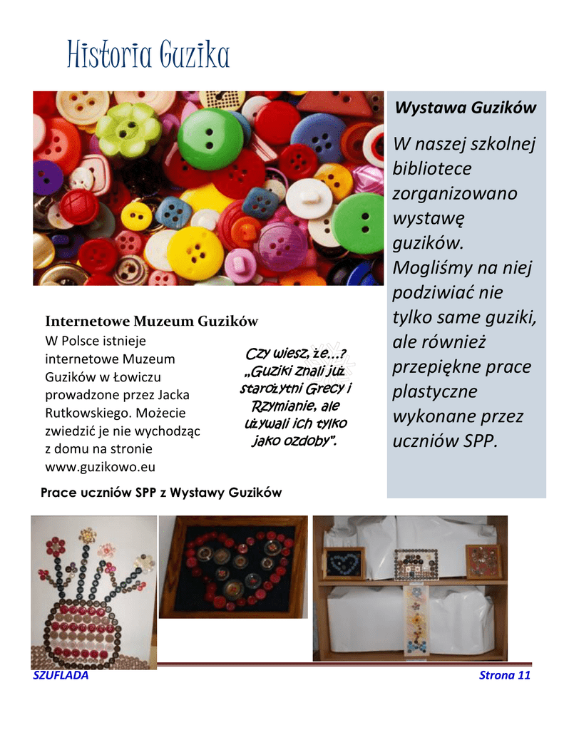 Historia Guzika Wystawa Guzików Internetowe Muzeum Guzików W Polsce istnieje Czy wiesz, że…? internetowe Muzeum „Guziki znali już Guzików w Łowiczu starożytni Grecy i prowadzone przez Jacka Rzymianie, ale Rutkowskiego. Możecie używali ich tylko zwiedzić je nie wychodząc jako ozdoby”. z domu na stronie www.guzikowo.eu W naszej szkolnej bibliotece zorganizowano wystawę guzików. Mogliśmy na niej podziwiać nie tylko same guziki, ale również przepiękne prace plastyczne wykonane przez uczniów SPP. Prace uczniów SPP z Wystawy Guzików SZUFLADA Strona 11 URODZINY MISIA 3 grudnia 2010 roku dzieci z klas 1 i 2 zostały zaproszone do biblioteki szkolnej na Miłe Spotkanie z Książką. Mogły tam poznać historię misia o bardzo małym rozumku czyli Kubusia Puchatka. Wszyscy bardzo miło spędzili czas na zabawach, jedzeniu pysznego miodku i rozwiązywaniu łamigłówek z tym znanym na całym świecie misiem. Możecie sami zobaczyć na zdjęciach jak wyglądały urodziny Kubusia w naszej szkole. Czy wiesz, że…? „Kubuś Puchatek ma już 84 lata? A. A. Milne, autor książek o jego przygodach stworzył Kubusia w 1926 roku!” SZUFLADA Strona 2 Strona 12