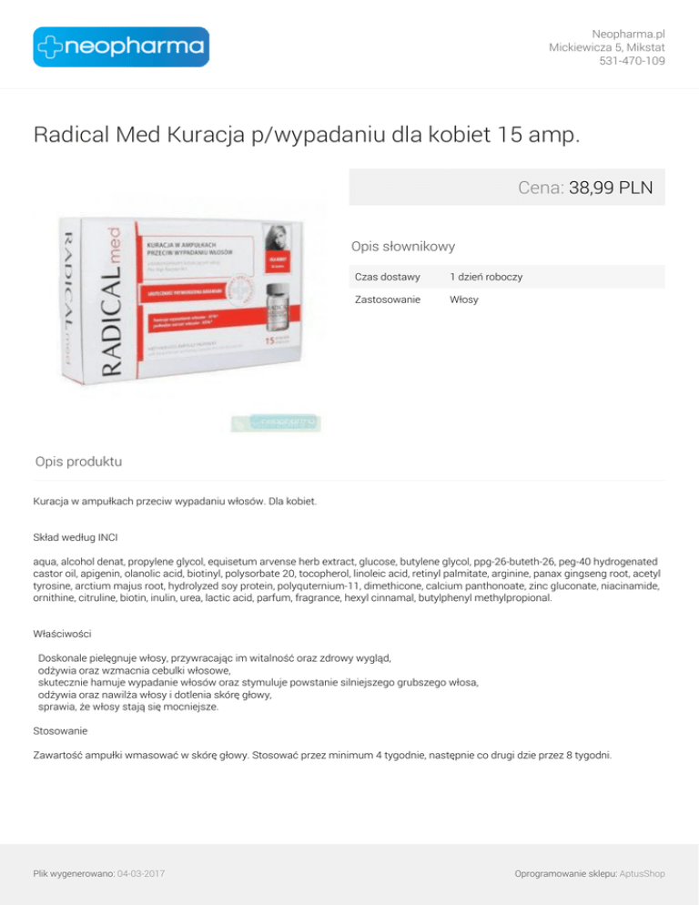 Neopharma.pl Mickiewicza 5, Mikstat 531-470-109 Radical Med Kuracja p/wypadaniu dla kobiet 15 amp. Cena: 38,99 PLN Opis słownikowy Czas dostawy 1 dzień roboczy Zastosowanie Włosy Opis produktu Kuracja w ampułkach przeciw wypadaniu włosów. Dla kobiet. Skład według INCI aqua, alcohol denat, propylene glycol, equisetum arvense herb extract, glucose, butylene glycol, ppg-26-buteth-26, peg-40 hydrogenated castor oil, apigenin, olanolic acid, biotinyl, polysorbate 20, tocopherol, linoleic acid, retinyl palmitate, arginine, panax gingseng root, acetyl tyrosine, arctium majus root, hydrolyzed soy protein, polyquternium-11, dimethicone, calcium panthonoate, zinc gluconate, niacinamide, ornithine, citruline, biotin, inulin, urea, lactic acid, parfum, fragrance, hexyl cinnamal, butylphenyl methylpropional. Właściwości Doskonale pielęgnuje włosy, przywracając im witalność oraz zdrowy wygląd, odżywia oraz wzmacnia cebulki włosowe, skutecznie hamuje wypadanie włosów oraz stymuluje powstanie silniejszego grubszego włosa, odżywia oraz nawilża włosy i dotlenia skórę głowy, sprawia, że włosy stają się mocniejsze. Stosowanie Zawartość ampułki wmasować w skórę głowy. Stosować przez minimum 4 tygodnie, następnie co drugi dzie przez 8 tygodni. Plik wygenerowano: 04-03-2017 Powered by TCPDF (www.tcpdf.org) Oprogramowanie sklepu: AptusShop