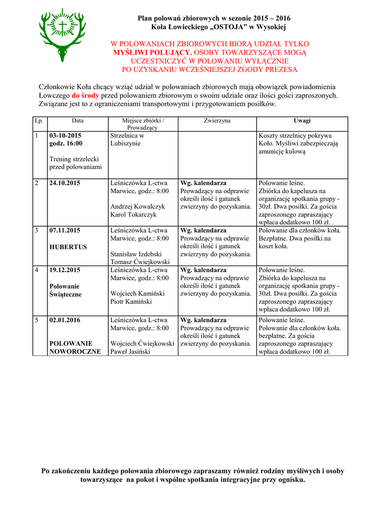 Plan polowań zbiorowych w sezonie 2015 – 2016 Koła Łowieckiego „OSTOJA” w Wysokiej W POLOWANIACH ZBIOROWYCH BIORĄ UDZIAŁ TYLKO MYŚLIWI POLUJĄCY. OSOBY TOWARZYSZĄCE MOGĄ UCZESTNICZYĆ W POLOWANIU WYŁĄCZNIE PO UZYSKANIU WCZEŚNIEJSZEJ ZGODY PREZESA Członkowie Koła chcący wziąć udział w polowaniach zbiorowych mają obowiązek powiadomienia Łowczego do środy przed polowaniem zbiorowym o swoim udziale oraz ilości gości zaproszonych. Związane jest to z ograniczeniami transportowymi i przygotowaniem posiłków. Lp. 1 Data 03-10-2015 godz. 16:00 Miejsce zbiórki / Prowadzący Zwierzyna Strzelnica w Lubiszynie Uwagi Koszty strzelnicy pokrywa Koło. Myśliwi zabezpieczają amunicję kulową Trening strzelecki przed polowaniami 2 24.10.2015 Leśniczówka L-ctwa Marwice, godz.: 8:00 Andrzej Kowalczyk Karol Tokarczyk 3 07.11.2015 HUBERTUS 4 19.12.2015 Polowanie Świąteczne 5 02.01.2016 POLOWANIE NOWOROCZNE Leśniczówka L-ctwa Marwice, godz.: 8:00 Stanisław Izdebski Tomasz Ćwiejkowski Leśniczówka L-ctwa Marwice, godz.: 8:00 Wg. kalendarza Prowadzący na odprawie określi ilość i gatunek zwierzyny do pozyskania. Wg. kalendarza Prowadzący na odprawie określi ilość i gatunek zwierzyny do pozyskania. Polowanie leśne. Zbiórka do kapelusza na organizację spotkania grupy 30zł. Dwa posiłki. Za gościa zaproszonego zapraszający wpłaca dodatkowo 100 zł. Polowanie dla członków koła. Bezpłatne. Dwa posiłki na koszt koła. Wg. kalendarza Prowadzący na odprawie określi ilość i gatunek zwierzyny do pozyskania. Polowanie leśne. Zbiórka do kapelusza na organizację spotkania grupy 30zł. Dwa posiłki. Za gościa zaproszonego zapraszający wpłaca dodatkowo 100 zł. Wg. kalendarza Prowadzący na odprawie określi ilość i gatunek Wojciech Ćwiejkowski zwierzyny do pozyskania. Paweł Jasiński Polowanie leśne. Polowanie dla członków koła. bezpłatne. Za gościa zaproszonego zapraszający wpłaca dodatkowo 100 zł. Wojciech Kamiński Piotr Kamiński Leśniczówka L-ctwa Marwice, godz.: 8:00 Po zakończeniu każdego polowania zbiorowego zapraszamy również rodziny myśliwych i osoby towarzyszące na pokot i wspólne spotkania integracyjne przy ognisku. DODATKOWE INFORMACJE: 1. 26. września 2015 r. - Z pewnością większość z Nas czytała relacje ze spontanicznej akcji budowania ambon i wspólnego grilowania. Pojawił się pomysł na zakończenie lata z młotkiem w ręku i kolejnym grilem na zakończenie dnia. Wszak życie towarzyskie myśliwego to nie tylko polowania zbiorowe. Chętnych na wspólne majsterkowanie przy budowie kolejnych urządzeń łowieckich zachęcamy i zapraszamy do spotkania w łowisku. Wolę udziału prosimy zgłosić do Łowczego, który z pewnością odpowie na wszelkie pytania i zorganizuje dla wszystkich w tym dniu rozrywkę inną niż „zbiorówka”. 2. Wzorem lat poprzednich chcąc dać Koleżankom i Kolegom możliwość przystrzelania oraz sprawdzenia swoich umiejętności na osi dzika w przebiegu przed sezonem polowań zbiorowych zachęcamy i zapraszamy do udziału w treningu strzeleckim 3. października 2015 r. godz. 16:00 na strzelnicy w Lubiszynie. 3. 10. października 2015 r. - wzorem sąsiednich Kół Zarząd zaprasza do wyjścia w łowisko na polowanie indywidualne większą grupą czego efektem powinno być efektywniejsze realizowanie planu samic zwierzyny płowej. Naszą propozycją jest spotkanie przy książce ewidencji o godzinie 16:00, rozlosowanie lub ustalenie rejonów polowania a po polowaniu wspólna biesiada przy ognisku i wymiana poglądów o zaobserwowanym stanie zwierzyny. Szerszej informacji w tej sprawie udziela Łowczy Koła. 4. MSZA HUBERTOWSKA - Z okazji 20-go jubileuszu Koła Łowieckiego „Ostoja” zapraszamy Koleżanki i Kolegów na uroczystą Mszę Hubertowską, która odbędzie się 15. listopada o godzinie 11:00 w Kościele w Wysokiej. Po Mszy zapraszamy wszystkich wraz z żonami lub osobami towarzyszącymi na wspólny obiad okraszony muzyką myśliwską na sali wiejskiej w Wysokiej. Prosimy o potwierdzenie swojej obecności u Łowczego Koła, ma to na celu zamówienie odpowiedniej ilości dań obiadowych.