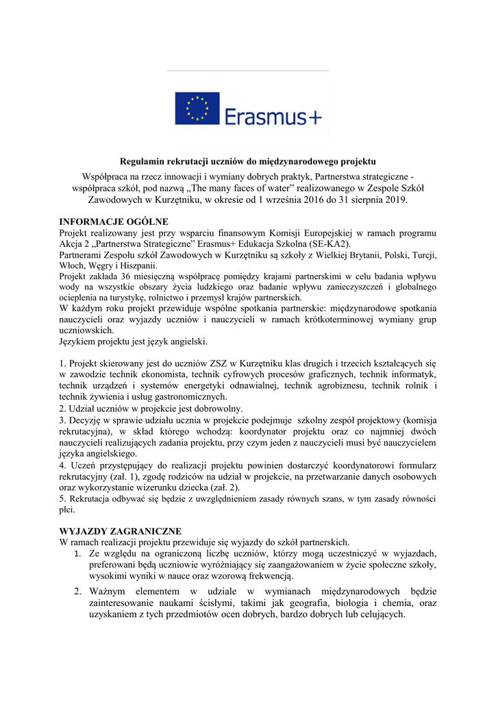 Regulamin rekrutacji uczniów do międzynarodowego projektu Współpraca na rzecz innowacji i wymiany dobrych praktyk, Partnerstwa strategiczne współpraca szkół, pod nazwą „The many faces of water” realizowanego w Zespole Szkół Zawodowych w Kurzętniku, w okresie od 1 września 2016 do 31 sierpnia 2019. INFORMACJE OGÓLNE Projekt realizowany jest przy wsparciu finansowym Komisji Europejskiej w ramach programu Akcja 2 „Partnerstwa Strategiczne” Erasmus+ Edukacja Szkolna (SE-KA2). Partnerami Zespołu szkół Zawodowych w Kurzętniku są szkoły z Wielkiej Brytanii, Polski, Turcji, Włoch, Węgry i Hiszpanii. Projekt zakłada 36 miesięczną współpracę pomiędzy krajami partnerskimi w celu badania wpływu wody na wszystkie obszary życia ludzkiego oraz badanie wpływu zanieczyszczeń i globalnego ocieplenia na turystykę, rolnictwo i przemysł krajów partnerskich. W każdym roku projekt przewiduje wspólne spotkania partnerskie: międzynarodowe spotkania nauczycieli oraz wyjazdy uczniów i nauczycieli w ramach krótkoterminowej wymiany grup uczniowskich. Językiem projektu jest język angielski. 1. Projekt skierowany jest do uczniów ZSZ w Kurzętniku klas drugich i trzecich kształcących się w zawodzie technik ekonomista, technik cyfrowych procesów graficznych, technik informatyk, technik urządzeń i systemów energetyki odnawialnej, technik agrobiznesu, technik rolnik i technik żywienia i usług gastronomicznych. 2. Udział uczniów w projekcie jest dobrowolny. 3. Decyzję w sprawie udziału ucznia w projekcie podejmuje szkolny zespół projektowy (komisja rekrutacyjna), w skład którego wchodzą: koordynator projektu oraz co najmniej dwóch nauczycieli realizujących zadania projektu, przy czym jeden z nauczycieli musi być nauczycielem języka angielskiego. 4. Uczeń przystępujący do realizacji projektu powinien dostarczyć koordynatorowi formularz rekrutacyjny (zał. 1), zgodę rodziców na udział w projekcie, na przetwarzanie danych osobowych oraz wykorzystanie wizerunku dziecka (zał. 2). 5. Rekrutacja odbywać się będzie z uwzględnieniem zasady równych szans, w tym zasady równości płci. WYJAZDY ZAGRANICZNE W ramach realizacji projektu przewiduje się wyjazdy do szkół partnerskich. 1. Ze względu na ograniczoną liczbę uczniów, którzy mogą uczestniczyć w wyjazdach, preferowani będą uczniowie wyróżniający się zaangażowaniem w życie społeczne szkoły, wysokimi wyniki w nauce oraz wzorową frekwencją. 2. Ważnym elementem w udziale w wymianach międzynarodowych będzie zainteresowanie naukami ścisłymi, takimi jak geografia, biologia i chemia, oraz uzyskaniem z tych przedmiotów ocen dobrych, bardzo dobrych lub celujących. 3. Uczniowie będą zobowiązani do przystąpienia do rozmowy kwalifikacyjnej, która pozwoli komisji rekrutacyjnej ocenić predyspozycje językowe kandydatów. Idealny kandydat do udziału w programie powinien bez trudności posługiwać się językiem angielskim, który jest językiem wykładowym projektu. 4. Wyjazdy są opłacone z grantu otrzymanego przez szkołę (zakup biletów na środki transportu, ubezpieczenie, nocleg, wyżywienie). REKRUTACJA UCZNIÓW NA WYJAZDY ZAGRANICZNE 1. Przy kwalifikacji na wyjazdy uwzględniane będą następujące kryteria: a) zaangażowanie w życie społeczne szkoły b) wysokie wyniki w nauce c) wysoka frekwencja na zajęciach, d) znajomość języka angielskiego, W razie trudności z wyłonieniem uczestników na podstawie powyższych kryteriów, dodatkowo mogą zostać uwzględnione: a) nienaganne zachowanie, b) szeroko pojęte predyspozycje osobiste. 2. Przed każdym wyjazdem w szkole powoływana będzie komisja rekrutacyjna, która dokonuje rekrutacji uczniów biorących udział w wyjeździe. Komisja liczy co najmniej 3 osoby i składa się z koordynatora oraz co najmniej dwóch nauczycieli realizujących zadania projektu, przy czym jeden z nauczycieli musi być nauczycielem języka angielskiego. 3. W przypadkach spornych decyzję podejmie komisja złożona z przedstawiciela dyrekcji szkoły, koordynatora i co najmniej jednego nauczyciela realizującego projekt. 4. W ramach realizacji projektu będą miały miejsce dwa wyjazdy zagraniczne, przeznaczone łącznie dla dziewięciu uczniów. 5. Przyjmuje się zasadę zgodnie z którą uczeń może brać udział w wyjeździe zagranicznym jeden raz, zastrzega się jednak możliwość ponownego wyboru ucznia w sytuacji, w której nie można wskazać innych uczestników gwarantujących pełną realizację celów zaplanowanych podczas wyjazdu zagranicznego. 6. W przypadku, gdy liczba chętnych przekroczy ilość uczniów, którzy mogą wziąć udział w wyjeździe, utworzona zostanie grupa rezerwowa. 7. W przypadku rezygnacji ucznia zakwalifikowanego do wyjazdu, do udziału w wyjeździe zostanie zaproszony uczeń z listy rezerwowej. 8. Jeżeli uczeń zakwalifikowany na wyjazd do szkoły partnerskiej zrezygnuje z danego wyjazdu, rodzic/opiekun prawny ucznia zobowiązuje się do poniesienia kosztów wynikających z tej rezygnacji (zmiana nazwiska na bilecie lotniczym, odwołanie rezerwacji, zakup nowego ubezpieczenia itp.). ZASADY UCZESTNICTWA W WYJAZDACH 1. Uczeń może wziąć udział w wyjeździe wyłącznie za pisemną zgodą rodziców/opiekunów prawnych. 2. Uczeń w terminie określonym każdorazowo przez koordynatora zobowiązany jest dostarczyć komplet dokumentów (zgoda rodziców itp.) oraz pisemne potwierdzenie zapoznania się z regulaminem wyjazdu. 3. Rodzice ucznia wraz z dzieckiem zobowiązani są do udziału w zebraniach informacyjnych i organizacyjnych. POSTANOWIENIA KOŃCOWE 1. Szkolny zespół projektowy zastrzega sobie prawo zmiany postanowień niniejszego Regulaminu w przypadku zaistnienia nieprzewidzianych okoliczności. 2. W przypadkach spornych decyzję podejmie komisja złożona z przedstawiciela dyrekcji szkoły, koordynatora i co najmniej jednego nauczyciela realizującego projekt. Odwołanie należy złoży