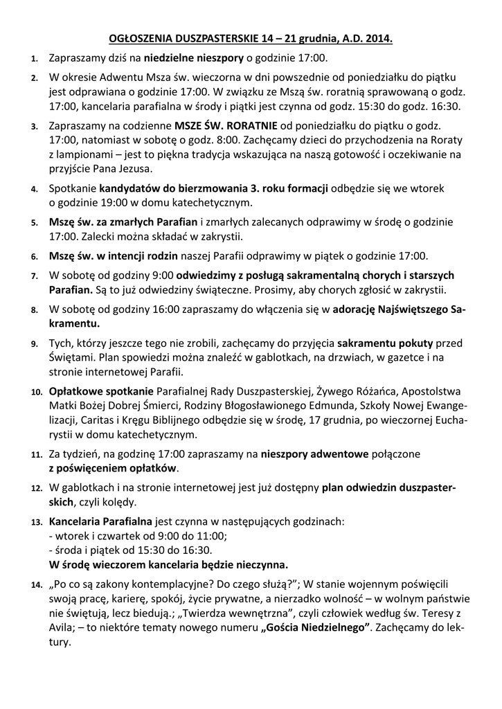 OGŁOSZENIA DUSZPASTERSKIE 14 – 21 grudnia, A.D. 2014. 1. Zapraszamy dziś na niedzielne nieszpory o godzinie 17:00. 2. W okresie Adwentu Msza św. wieczorna w dni powszednie od poniedziałku do piątku jest odprawiana o godzinie 17:00. W związku ze Mszą św. roratnią sprawowaną o godz. 17:00, kancelaria parafialna w środy i piątki jest czynna od godz. 15:30 do godz. 16:30. 3. Zapraszamy na codzienne MSZE ŚW. RORATNIE od poniedziałku do piątku o godz. 17:00, natomiast w sobotę o godz. 8:00. Zachęcamy dzieci do przychodzenia na Roraty z lampionami – jest to piękna tradycja wskazująca na naszą gotowość i oczekiwanie na przyjście Pana Jezusa. 4. Spotkanie kandydatów do bierzmowania 3. roku formacji odbędzie się we wtorek o godzinie 19:00 w domu katechetycznym. 5. Mszę św. za zmarłych Parafian i zmarłych zalecanych odprawimy w środę o godzinie 17:00. Zalecki można składać w zakrystii. 6. Mszę św. w intencji rodzin naszej Parafii odprawimy w piątek o godzinie 17:00. 7. W sobotę od godziny 9:00 odwiedzimy z posługą sakramentalną chorych i starszych Parafian. Są to już odwiedziny świąteczne. Prosimy, aby chorych zgłosić w zakrystii. 8. W sobotę od godziny 16:00 zapraszamy do włączenia się w adorację Najświętszego Sakramentu. 9. Tych, którzy jeszcze tego nie zrobili, zachęcamy do przyjęcia sakramentu pokuty przed Świętami. Plan spowiedzi można znaleźć w gablotkach, na drzwiach, w gazetce i na stronie internetowej Parafii. 10. Opłatkowe spotkanie Parafialnej Rady Duszpasterskiej, Żywego Różańca, Apostolstwa Matki Bożej Dobrej Śmierci, Rodziny Błogosławionego Edmunda, Szkoły Nowej Ewangelizacji, Caritas i Kręgu Biblijnego odbędzie się w środę, 17 grudnia, po wieczornej Eucharystii w domu katechetycznym. 11. Za tydzień, na godzinę 17:00 zapraszamy na nieszpory adwentowe połączone z poświęceniem opłatków. 12. W gablotkach i na stronie internetowej jest już dostępny plan odwiedzin duszpasterskich, czyli kolędy. 13. Kancelaria Parafialna jest czynna w następujących godzinach: - wtorek i czwartek od 9:00 do 11:00; - środa i piątek od 15:30 do 16:30. W środę wieczorem kancelaria będzie nieczynna. 14. „Po co są zakony kontemplacyjne? Do czego służą?”; W stanie wojennym poświęcili swoją pracę, karierę, spokój, życie prywatne, a nierzadko wolność – w wolnym państwie nie świętują, lecz biedują.; „Twierdza wewnętrzna”, czyli człowiek według św. Teresy z Avila; – to niektóre tematy nowego numeru „Gościa Niedzielnego”. Zachęcamy do lektury. 15. Bardzo serdecznie dziękujemy tym wszystkim, którzy w minionym tygodniu pomagali przy bieżących pracach, a także przy sprzątaniu kościoła i domu katechetycznego. Wszystkich chętnych prosimy o dalszą pomoc – codziennie od godziny 9:00. 16. Po Mszach świętych pod chórem u naszych Sióstr można zaopatrzyć się w opłatki wigilijne. 17. Po Mszach świętych w wieży kościoła można nabywać świece Wigilijnego Dzieła Pomocy Dzieciom rozprowadzane, jak co roku przez „Caritas”. 18. Po Mszach świętych w wieży kościoła można nabywać, rozprowadzane przez Dzieci Maryi, lampiony roratnie, kartki, książki i kalendarze na rok 2015. 19. Kolekta dziś i za tydzień jest przeznaczona na potrzeby naszej parafii. Dziś przed kościołem – zgodnie z instrukcją Episkopatu – zbiórka na pomoc katolikom na Wschodzie. Bóg zapłać za wszystkie składane ofiary.