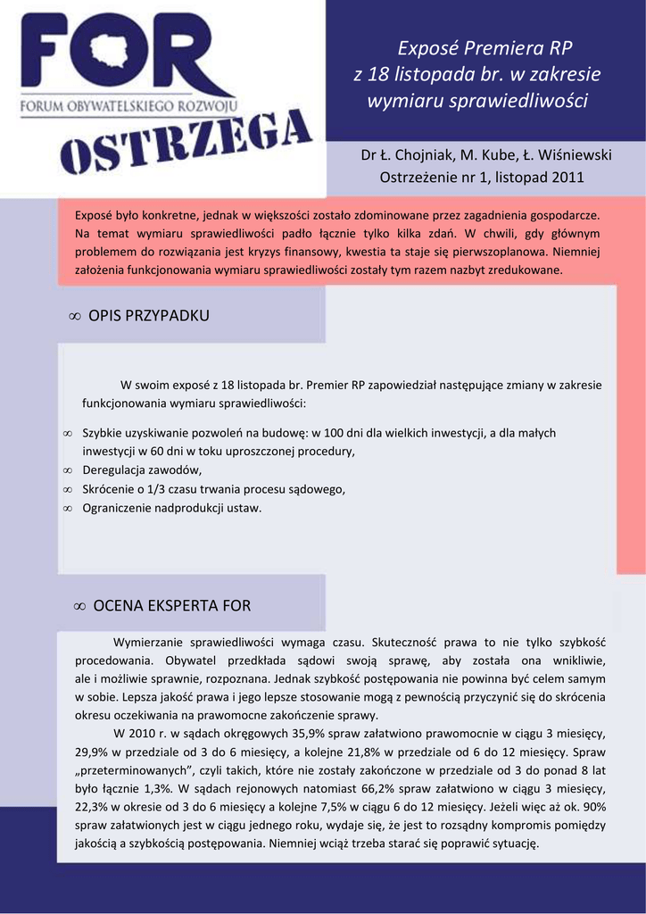 Exposé Premiera RP z 18 listopada br. w zakresie wymiaru sprawiedliwości Dr Ł. Chojniak, M. Kube, Ł. Wiśniewski Ostrzeżenie nr 1, listopad 2011 Exposé było konkretne, jednak w większości zostało zdominowane przez zagadnienia gospodarcze. Na temat wymiaru sprawiedliwości padło łącznie tylko kilka zdań. W chwili, gdy głównym problemem do rozwiązania jest kryzys finansowy, kwestia ta staje się pierwszoplanowa. Niemniej założenia funkcjonowania wymiaru sprawiedliwości zostały tym razem nazbyt zredukowane. • OPIS PRZYPADKU W swoim exposé z 18 listopada br. Premier RP zapowiedział następujące zmiany w zakresie funkcjonowania wymiaru sprawiedliwości: • • • • Szybkie uzyskiwanie pozwoleń na budowę: w 100 dni dla wielkich inwestycji, a dla małych inwestycji w 60 dni w toku uproszczonej procedury, Deregulacja zawodów, Skrócenie o 1/3 czasu trwania procesu sądowego, Ograniczenie nadprodukcji ustaw. • OCENA EKSPERTA FOR Wymierzanie sprawiedliwości wymaga czasu. Skuteczność prawa to nie tylko szybkość procedowania. Obywatel przedkłada sądowi swoją sprawę, aby została ona wnikliwie, ale i możliwie sprawnie, rozpoznana. Jednak szybkość postępowania nie powinna być celem samym w sobie. Lepsza jakość prawa i jego lepsze stosowanie mogą z pewnością przyczynić się do skrócenia okresu oczekiwania na prawomocne zakończenie sprawy. W 2010 r. w sądach okręgowych 35,9% spraw załatwiono prawomocnie w ciągu 3 miesięcy, 29,9% w przedziale od 3 do 6 miesięcy, a kolejne 21,8% w przedziale od 6 do 12 miesięcy. Spraw „przeterminowanych”, czyli takich, które nie zostały zakończone w przedziale od 3 do ponad 8 lat było łącznie 1,3%. W sądach rejonowych natomiast 66,2% spraw załatwiono w ciągu 3 miesięcy, 22,3% w okresie od 3 do 6 miesięcy a kolejne 7,5% w ciągu 6 do 12 miesięcy. Jeżeli więc aż ok. 90% spraw załatwionych jest w ciągu jednego roku, wydaje się, że jest to rozsądny kompromis pomiędzy jakością a szybkością postępowania. Niemniej wciąż trzeba starać się poprawić sytuację. W exposé padła zapowiedź ograniczenia nadprodukcji ustaw. W ten sposób zaakcentowano dążenie do większej stabilności prawa. Trudno się nie zgodzić, ale ciężko uwierzyć. W poprzedniej kadencji nowelizacje ad hoc, wprowadzane na skutek głośnych, ale jednostkowych wypadków, były bardzo częste. Koronnym przykładem jest tu zupełnie zbędna nowelizacja prawa karnego dotycząca ochrony funkcjonariuszy publicznych, w tym policjantów – zbędna nie dlatego, że funkcjonariuszy publicznych nie należy chronić, lecz dlatego, że odpowiednie regulacje już wcześniej były w prawie karnym. Proponowane wprowadzenie zasady, iż liczba nowych ustaw musi być równa co najmniej liczbie ustaw uchylanych jest ciekawym pomysłem, ale na nic się to nie zda, dopóki zmiany prawa nie przestaną być instrumentem służącym politykom do zdobywania sympatii wyborców. Poza tym zmiana prawa nie rozwiązuje zazwyczaj danego problemu, jeśli prawo, jego cele, działanie, etc. pozostaje nie wystarczająco znane społeczeństwu. Za przemyślaną zmianą prawa powinna często następować kampania informacyjna kształtująca nowe wzorce zachowań. Bez tego, nawet najlepsze nowe prawo, może pozostać tylko zapisem na papierze. Deregulacja. To słowo zrobiło w ostatnich dniach zawrotną karierę. Jeśli program rządu ma polegać na rozsądnym poszerzeniu dostępu do niektórych zawodów, nie powinien być on z góry krytykowany. W przypadku jednak gdy program ten nie będzie uwzględniał wymagań art. 17 ust. 1 Konstytucji, mówiącego o zadaniach samorządów zawodowych, w tym o ochronie interesu publicznego, wszelkie nowelizacje nieuchronnie trafią do Trybunału Konstytucyjnego. W swoim exposé sprzed czterech lat premier poświęcił wymiarowi sprawiedliwości więcej miejsca. Sztandarowym projektem było rozdzielenie funkcji ministra sprawiedliwości i prokuratora generalnego. Zmiana ta dokonała się w 2010 r. Według zapowiedzi miała ona być „zwieńczeniem procesu” reformy systemu sprawiedliwości. Do chwili obecnej nie została jednak przeprowadzona kompleksowa zmiana ustawy o prokuraturze. Premier zapowiadał również odejście od praktyki chaotycznych i doraźnych nowelizacji prawa. Jak już podkreślono, rzeczywistość była zupełnie inna. Inne źródła informacji: Kancelaria Prezesa Rady Ministrów – www.kprm.gov.pl Forum Obywatelskiego Rozwoju - FOR Al. J.Ch. Szucha 2/4 lok. 20, 00-582 Warszawa tel. +48 22 427 40 10, fax +48 22 213 37 85 e-mail: [email protected]