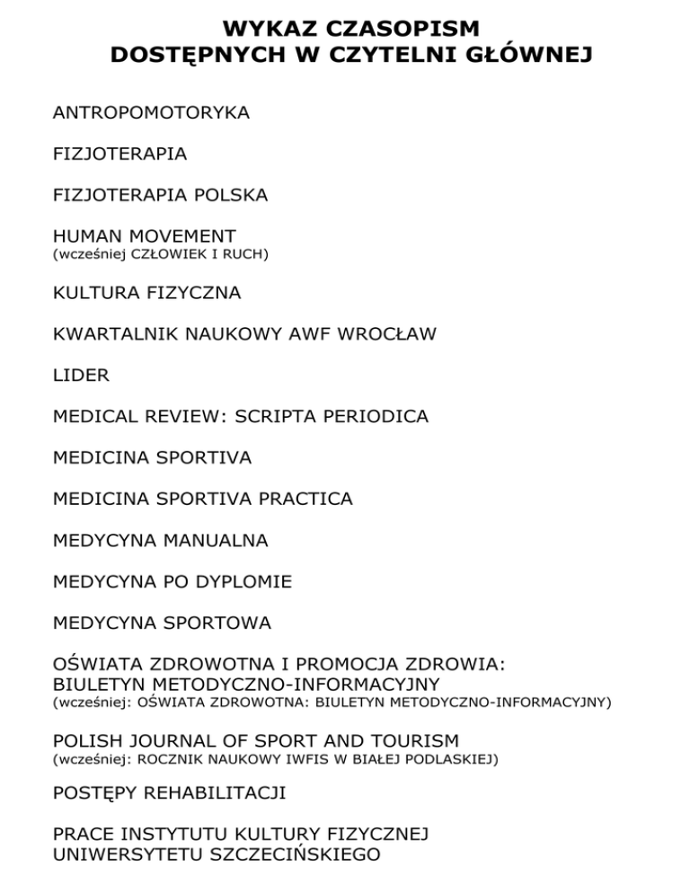 WYKAZ CZASOPISM DOSTĘPNYCH W CZYTELNI GŁÓWNEJ ANTROPOMOTORYKA FIZJOTERAPIA FIZJOTERAPIA POLSKA HUMAN MOVEMENT (wcześniej CZŁOWIEK I RUCH) KULTURA FIZYCZNA KWARTALNIK NAUKOWY AWF WROCŁAW LIDER MEDICAL REVIEW: SCRIPTA PERIODICA MEDICINA SPORTIVA MEDICINA SPORTIVA PRACTICA MEDYCYNA MANUALNA MEDYCYNA PO DYPLOMIE MEDYCYNA SPORTOWA OŚWIATA ZDROWOTNA I PROMOCJA ZDROWIA: BIULETYN METODYCZNO-INFORMACYJNY (wcześniej: OŚWIATA ZDROWOTNA: BIULETYN METODYCZNO-INFORMACYJNY) POLISH JOURNAL OF SPORT AND TOURISM (wcześniej: ROCZNIK NAUKOWY IWFIS W BIAŁEJ PODLASKIEJ) POSTĘPY REHABILITACJI PRACE INSTYTUTU KULTURY FIZYCZNEJ UNIWERSYTETU SZCZECIŃSKIEGO REHABILITACJA MEDYCZNA ROCZNIK NAUKOWY AWF GDAŃSK ROCZNIKI NAUKOWE AWF KATOWICE ROCZNIKI NAUKOWE AWF POZNAŃ ROCZNIKI NAUKOWE AWF WARSZAWA ROZPRAWY NAUKOWE AWF WROCŁAW SPORT WYCZYNOWY STUDIA I MONOGRAFIE AWF WROCŁAW TRENING WYCHOWANIE FIZYCZNE I SPORT WYCHOWANIE FIZYCZNE I ZDROWOTNE (wcześniej WYCHOWANIE FIZYCZNE I HIGIENA SZKOLNA) ZESZYTY METODYCZNO-NAUKOWE AWF KATOWICE ZESZYTY NAUKOWE AWF POZNAŃ ZESZYTY NAUKOWE AWF WROCŁAW ZESZYTY NAUKOWE. WYCHOWANIE FIZYCZNE I FIZJOTERAPIA