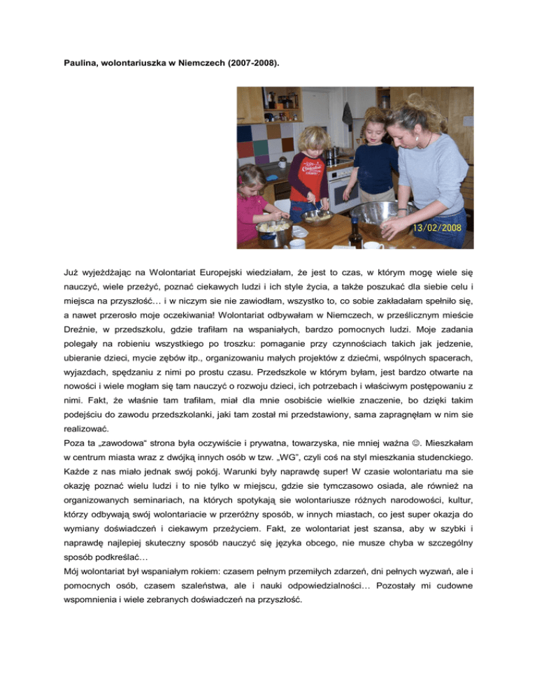 Paulina, wolontariuszka w Niemczech (2007-2008). Już wyjeżdżając na Wolontariat Europejski wiedziałam, że jest to czas, w którym mogę wiele się nauczyć, wiele przeżyć, poznać ciekawych ludzi i ich style życia, a także poszukać dla siebie celu i miejsca na przyszłość… i w niczym sie nie zawiodłam, wszystko to, co sobie zakładałam spełniło się, a nawet przerosło moje oczekiwania! Wolontariat odbywałam w Niemczech, w prześlicznym mieście Dreźnie, w przedszkolu, gdzie trafiłam na wspaniałych, bardzo pomocnych ludzi. Moje zadania polegały na robieniu wszystkiego po troszku: pomaganie przy czynnościach takich jak jedzenie, ubieranie dzieci, mycie zębów itp., organizowaniu małych projektów z dziećmi, wspólnych spacerach, wyjazdach, spędzaniu z nimi po prostu czasu. Przedszkole w którym byłam, jest bardzo otwarte na nowości i wiele mogłam się tam nauczyć o rozwoju dzieci, ich potrzebach i właściwym postępowaniu z nimi. Fakt, że właśnie tam trafiłam, miał dla mnie osobiście wielkie znaczenie, bo dzięki takim podejściu do zawodu przedszkolanki, jaki tam został mi przedstawiony, sama zapragnęłam w nim sie realizować. Poza ta „zawodowa“ strona była oczywiście i prywatna, towarzyska, nie mniej ważna . Mieszkałam w centrum miasta wraz z dwójką innych osób w tzw. „WG”, czyli coś na styl mieszkania studenckiego. Każde z nas miało jednak swój pokój. Warunki były naprawdę super! W czasie wolontariatu ma sie okazję poznać wielu ludzi i to nie tylko w miejscu, gdzie sie tymczasowo osiada, ale również na organizowanych seminariach, na których spotykają sie wolontariusze różnych narodowości, kultur, którzy odbywają swój wolontariacie w przeróżny sposób, w innych miastach, co jest super okazja do wymiany doświadczeń i ciekawym przeżyciem. Fakt, ze wolontariat jest szansa, aby w szybki i naprawdę najlepiej skuteczny sposób nauczyć się języka obcego, nie musze chyba w szczególny sposób podkreślać… Mój wolontariat był wspaniałym rokiem: czasem pełnym przemiłych zdarzeń, dni pełnych wyzwań, ale i pomocnych osób, czasem szaleństwa, ale i nauki odpowiedzialności… Pozostały mi cudowne wspomnienia i wiele zebranych doświadczeń na przyszłość.