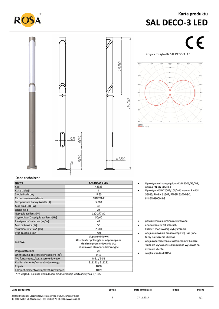 Karta produktu SAL DECO-3 LED Krzywa rozsyłu dla SAL DECO-3 LED Dane techniczne Nazwa Kod Klasa izolacji Stopień ochrony Typ zastosowanej diody Temperatura barwy światła [K] Moc diod LED [W] Liczba diod Napięcie zasilania [V] Częstotliwość napięcia zasilania [Hz] Efektywność świetlna [lm/W] Moc całkowita [W] Strumień świetlny* [lm] Prąd zasilania [mA] SAL DECO-3 LED 42923 II IP 65 CREE XT-E 5 000 48 24 120-277 AC 50/60 44 56 2 500 700 słup aluminiowy; klosz biały z poliwęglanu odpornego na Budowa działanie promieniowania UV; aluminiowe elementy dekoracyjne Waga netto [kg] 28 3 Orientacyjna objętość jednostkowa [m ] 0,12 Typ fundamentu/kosza zbrojeniowego B-51 / Z-51 Kod fundamentu/kosza zbrojeniowego 311151 / 311251 Regula 4008 Komplet elementów złącznych zrywalnych 4009 * ze względu na klasę dokładności diod tolerancja wartości wynosi +/- 3% Dane producenta Zakład Produkcji Sprzętu Oświetleniowego ROSA Stanisław Rosa 43-109 Tychy, ul. Strefowa 1, tel. +48 32 73 88 901, www.rosa.pl Dyrektywa niskonapięciowa LVD 2006/95/WE, norma PN-EN 60598-1 Dyrektywa EMC 2004/108/WE, normy: PN-EN 55015, PN-EN 61547, PN-EN 61000-3-2, PN-EN 61000-3-3 powierzchnia: aluminium szlifowane anodowanie w 10 kolorach, każdy z możliwością wybłyszczania opcja malowania proszkowego wg RAL (inne farby na życzenie klienta) opcja zabezpieczenia elastomerem w kolorze słupa do wysokości 350 mm (inna wysokość na życzenie klienta) wnęka standard ROSA Edycja Data aktualizacji 5 27.11.2014 Podpis Strona 1/1