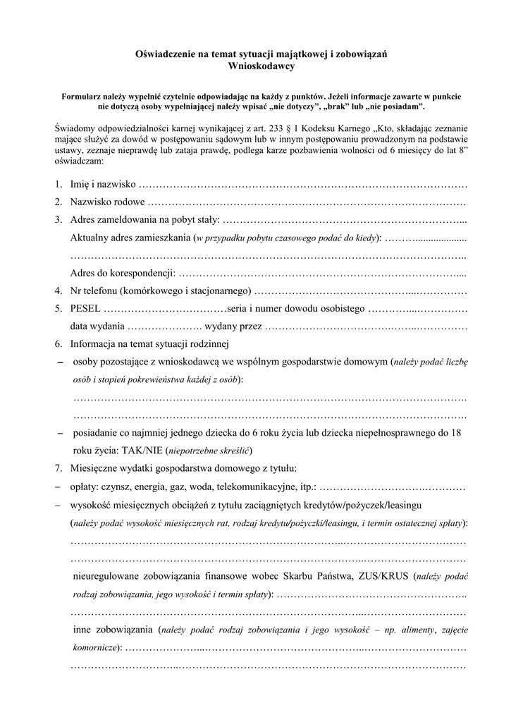 Oświadczenie na temat sytuacji majątkowej i zobowiązań Wnioskodawcy Formularz należy wypełnić czytelnie odpowiadając na każdy z punktów. Jeżeli informacje zawarte w punkcie nie dotyczą osoby wypełniającej należy wpisać „nie dotyczy”, „brak” lub „nie posiadam”. Świadomy odpowiedzialności karnej wynikającej z art. 233 § 1 Kodeksu Karnego „Kto, składając zeznanie mające służyć za dowód w postępowaniu sądowym lub w innym postępowaniu prowadzonym na podstawie ustawy, zeznaje nieprawdę lub zataja prawdę, podlega karze pozbawienia wolności od 6 miesięcy do lat 8” oświadczam: 1. Imię i nazwisko …………………………………………………………………………………… 2. Nazwisko rodowe ………………………………………………………………………………… 3. Adres zameldowania na pobyt stały: ……………………………………………………………... Aktualny adres zamieszkania (w przypadku pobytu czasowego podać do kiedy): ……….................... …………………………………………………………………………………………………….. Adres do korespondencji: ……………………………………………………………………….... 4. Nr telefonu (komórkowego i stacjonarnego) ………………………………………...…………… 5. PESEL ………………………………seria i numer dowodu osobistego …………...…………… data wydania …………………. wydany przez ……………………………….……..…………… 6. Informacja na temat sytuacji rodzinnej osoby pozostające z wnioskodawcą we wspólnym gospodarstwie domowym (należy podać liczbę osób i stopień pokrewieństwa każdej z osób): ……………………………………………………………………………………………………. ……………………………………………………………………………………………………. posiadanie co najmniej jednego dziecka do 6 roku życia lub dziecka niepełnosprawnego do 18 roku życia: TAK/NIE (niepotrzebne skreślić) 7. Miesięczne wydatki gospodarstwa domowego z tytułu: opłaty: czynsz, energia, gaz, woda, telekomunikacyjne, itp.: ………………………….………… wysokość miesięcznych obciążeń z tytułu zaciągniętych kredytów/pożyczek/leasingu (należy podać wysokość miesięcznych rat, rodzaj kredytu/pożyczki/leasingu, i termin ostatecznej spłaty): ……………………………………………………………………..……………………………… …………………………………………………………………………..………………………… nieuregulowane zobowiązania finansowe wobec Skarbu Państwa, ZUS/KRUS (należy podać rodzaj zobowiązania, jego wysokość i termin spłaty): ……………………………………………….. …………………………………………………………………………..………………………… inne zobowiązania (należy podać rodzaj zobowiązania i jego wysokość – np. alimenty, zajęcie komornicze): …………………...………………………………………..………………………… …………………………..………………………………………………………………………… 8. Stan cywilny (panna/kawaler, mężatka/żonaty, rozwiedziona/rozwiedziony, wdowa/wdowiec): ………………………………………………………………..…………………………………… 9. Stosunki majątkowe między małżonkami (wspólność majątkowa, rozdzielność majątkowa) …………………………………………………………………………………………………….. 10. Dane dotyczące współmałżonka w przypadku istnienia wspólności majątkowej (imię, nazwisko i numer PESEL): ………………………………………………………………………………….. 11. Dane dotyczące działalności gospodarczej współmałżonka (niepotrzebne skreślić): współmałżonek aktualnie nie wykonuje i nie ma zawieszonej działalności gospodarczej oraz nie zaprzestał wykonywania działalności gospodarczej w okresie 6 miesięcy bezpośrednio poprzedzających dzień złożenia wniosku współmałżonek aktualnie posiada zawieszoną działalność gospodarczą (należy podać nr NIP, rodzaje działalności, symbole PKD i lokalizację): …………………………………………………… …………………………………………………………………………………………………….. współmałżonek aktualnie nie wykonuje działalności gospodarczej, ale wykonywał działalność gospodarczą w okresie 6 miesięcy bezpośrednio poprzedzających dzień złożenia wniosku (należy podać nr NIP, rodzaje działalności, symbole PKD i lokalizację): ……………………………... ……………………………………………………………...…………………………………….. ………………………………………………………..…………………………………………… współmałżonek aktualnie wykonuje działalność gospodarczą (należy podać nr NIP, rodzaje działalności, symbole PKD i lokalizację) ………………………...………………………………… ……………………………………………………………………………..……………………… 12. Aktualna sytuacja materialna wnioskodawcy: nieruchomości stanowiące własność (należy podać ich rodzaj i szacunkową wartość): ……….……… ………………………………..……………………………………………...……….…………… ………………………………………..…………………………………………………………… inny p